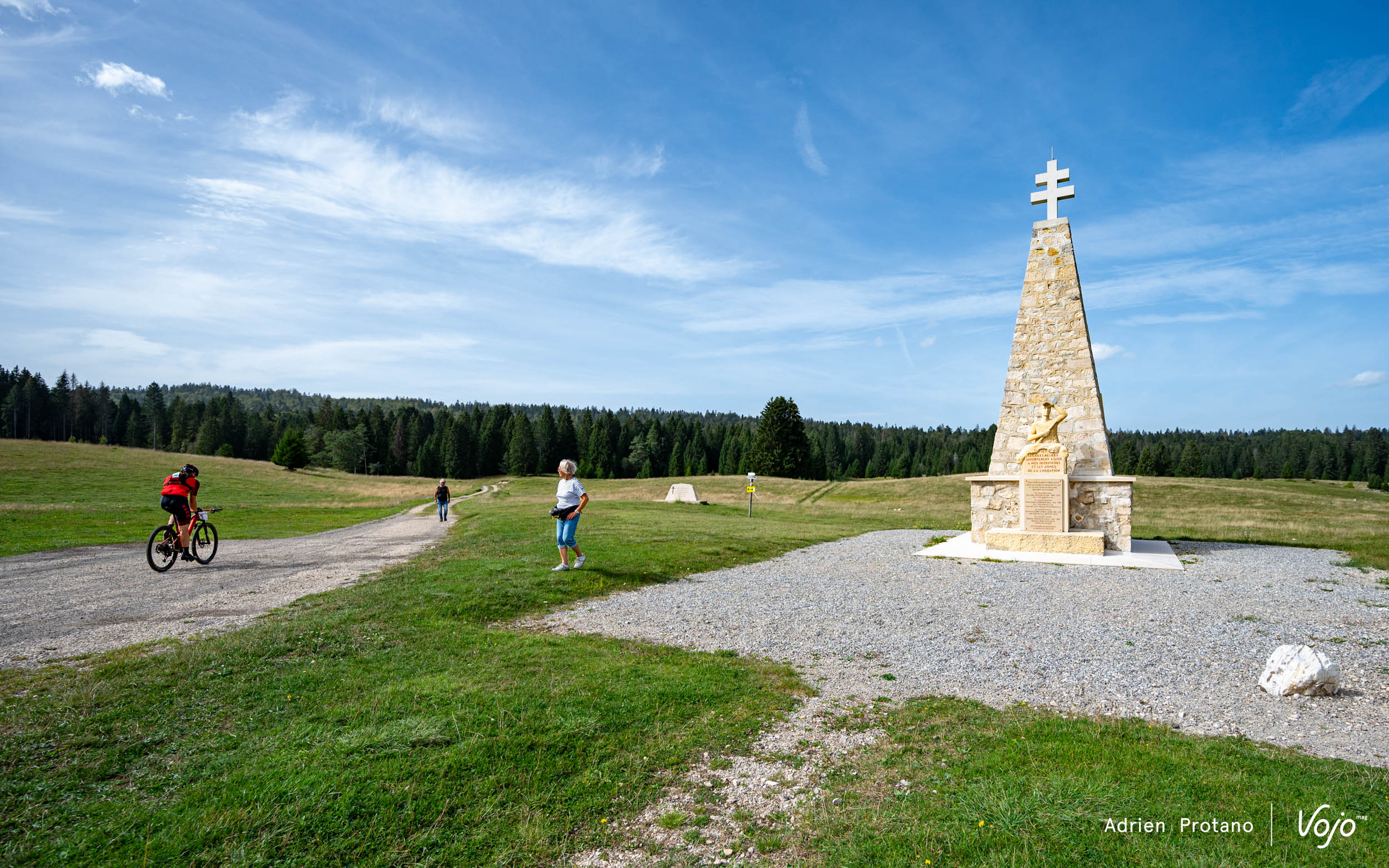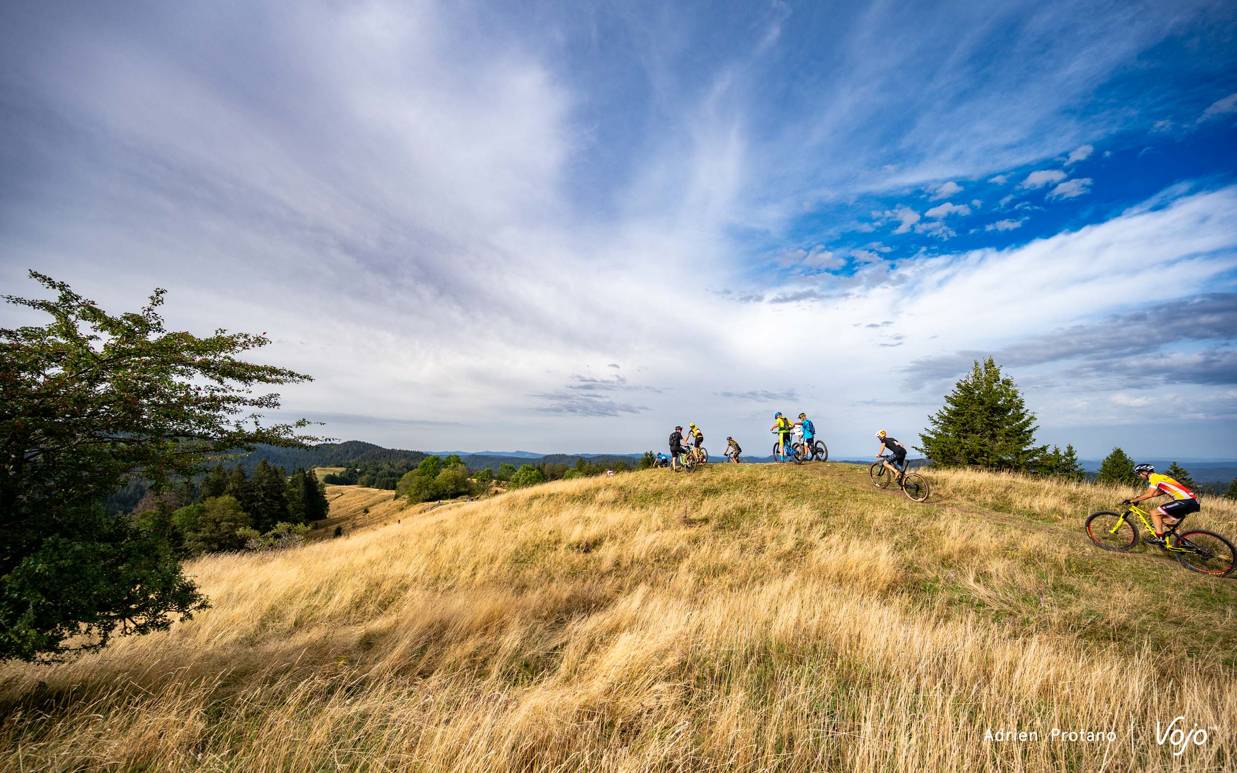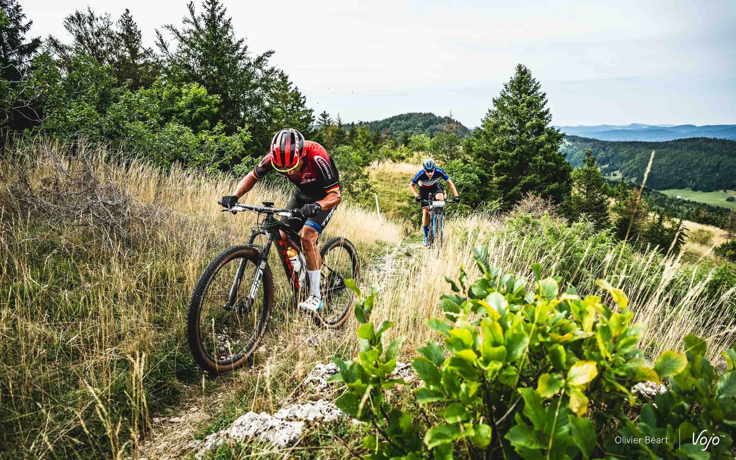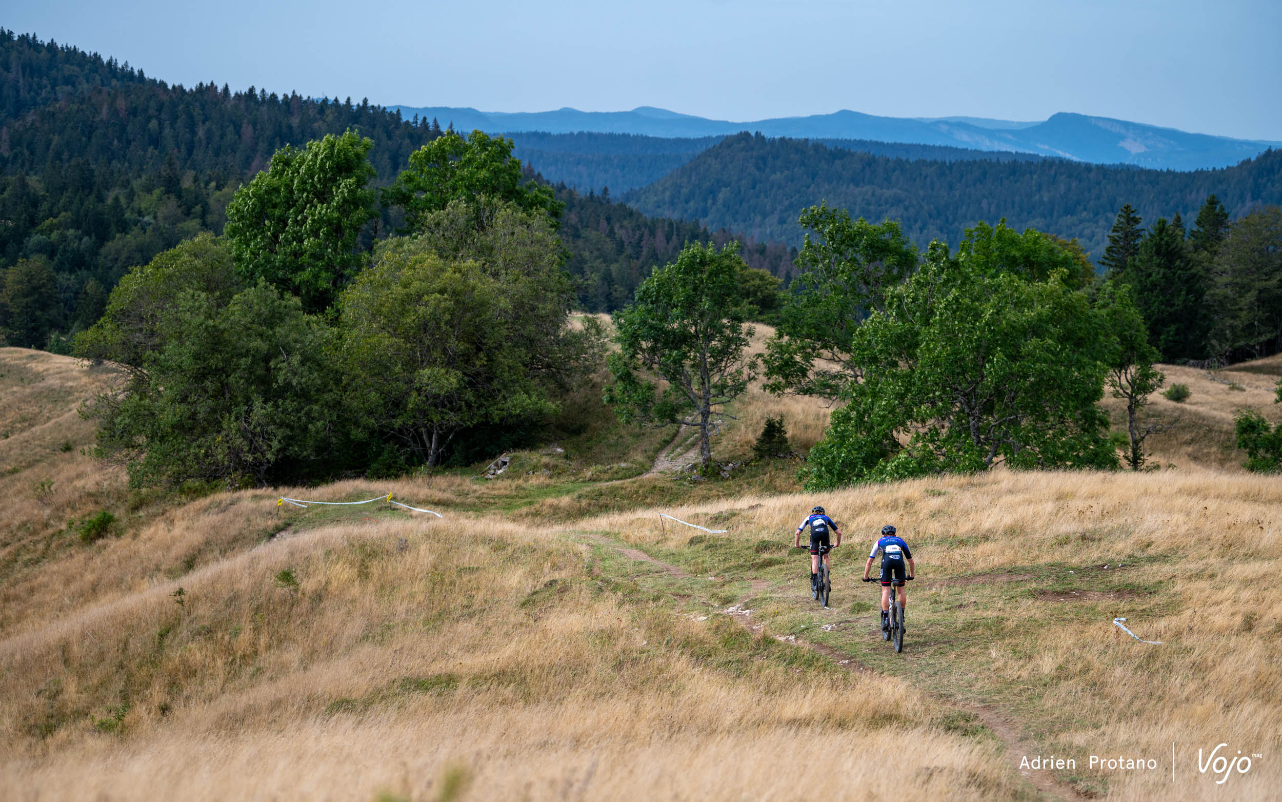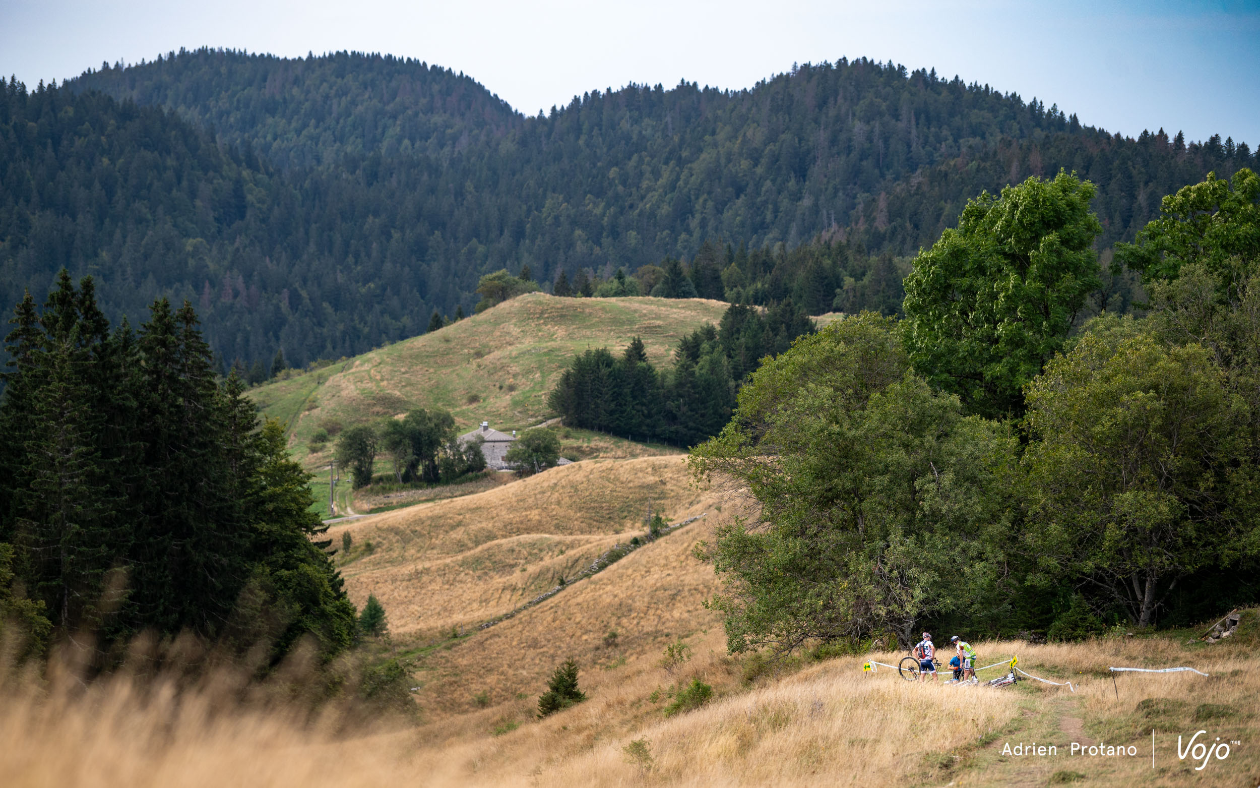Impossible de suivre les meilleurs dans la descente vers St-Claude, et c’est donc au niveau du magnifique panorama de la Croix des Bouchoux que nous retrouvons la tête de course. Au terme d’une ascension longue et cassante, Hugo Drechou a réussi à se détacher en compagnie de l’Allemand Martin Frey.