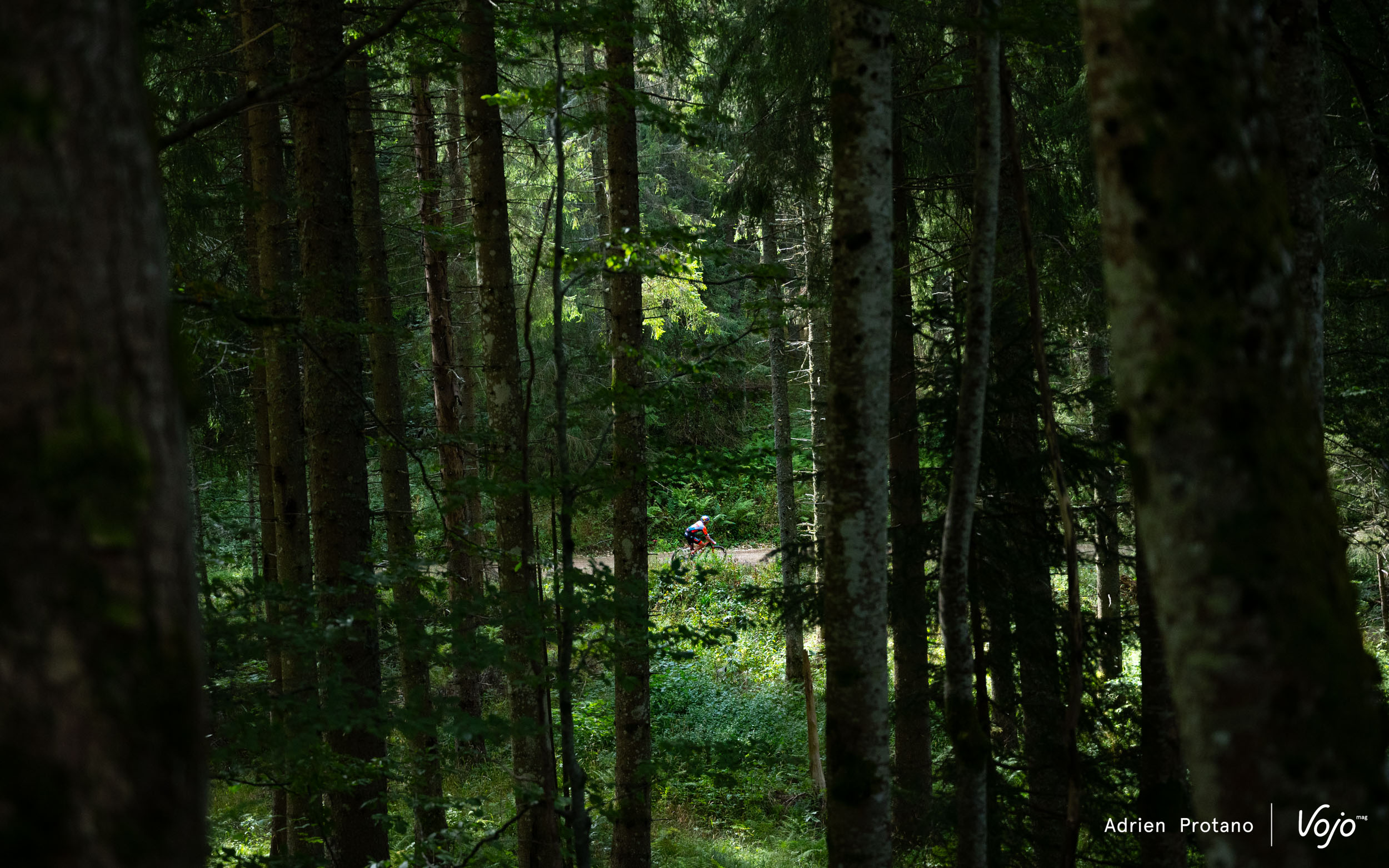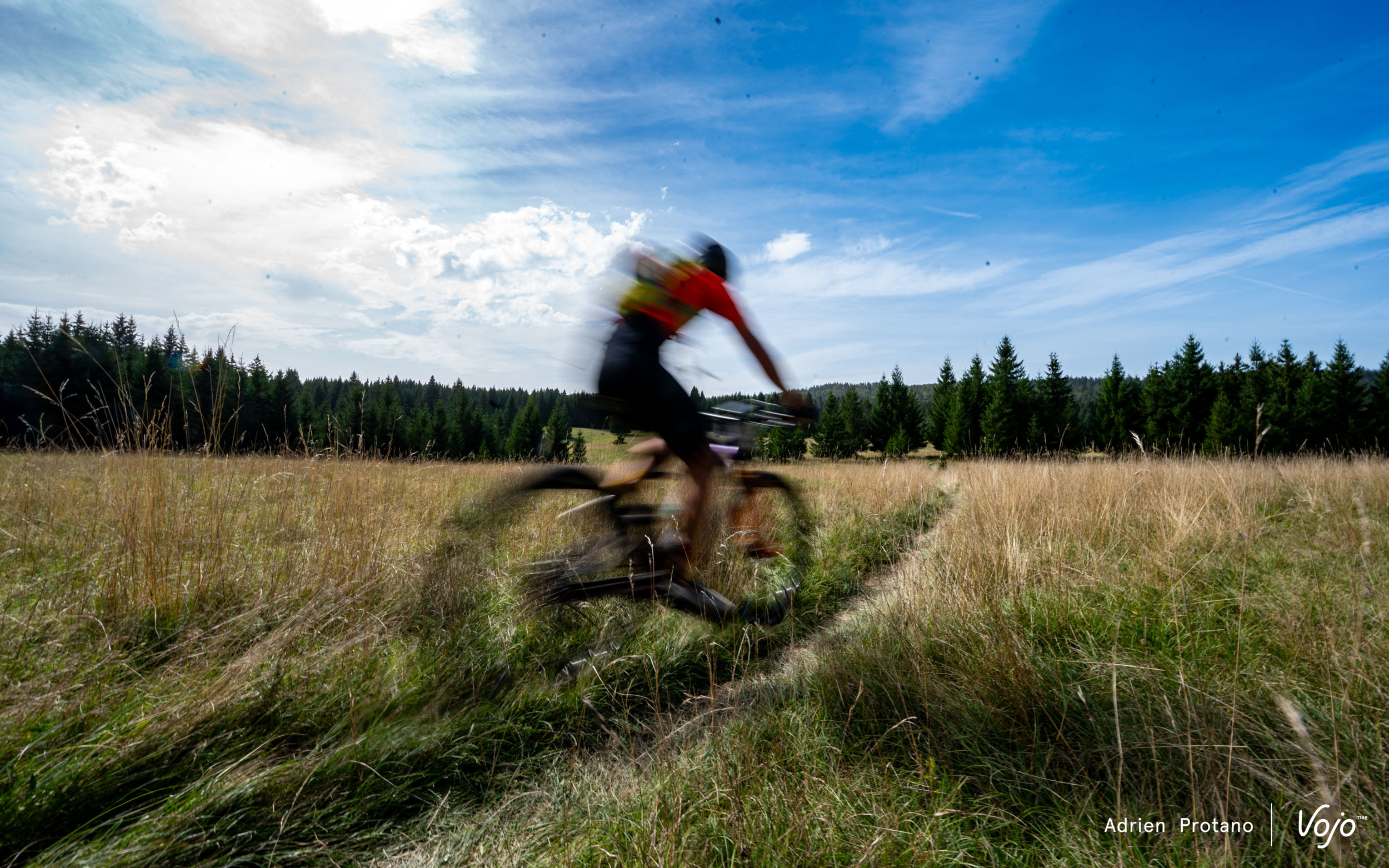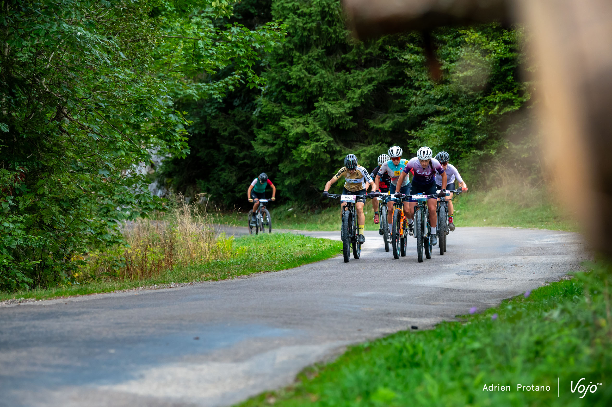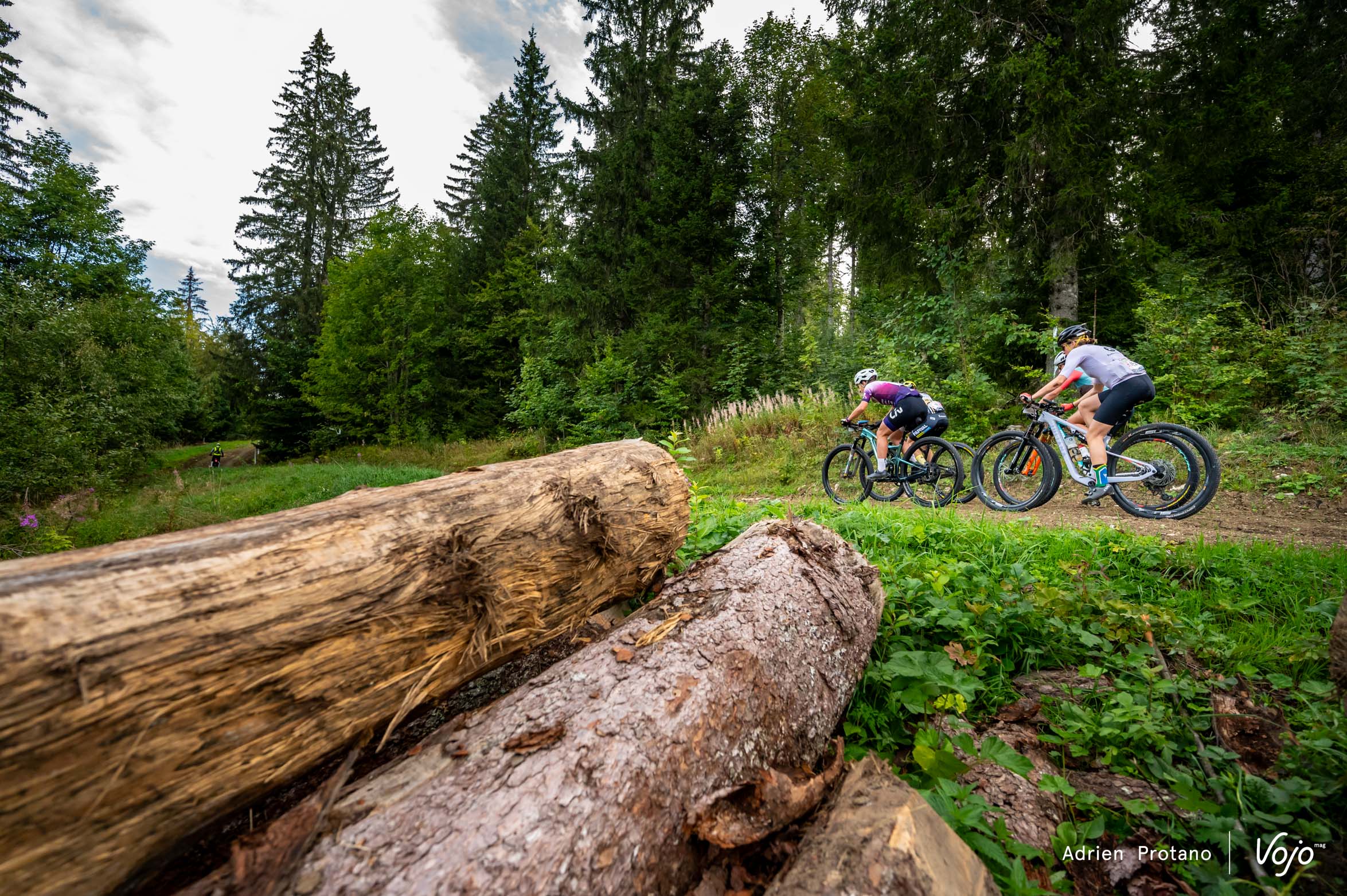 L’ascension se poursuit sur un chemin forestier où les pilotes Élites maintiennent un rythme effréné, comme s’ils abordaient une épreuve olympique de cross-country… or 100 kilomètres sont au programme de la course hommes, tandis que les femmes s’élancent pour 70 kilomètres.