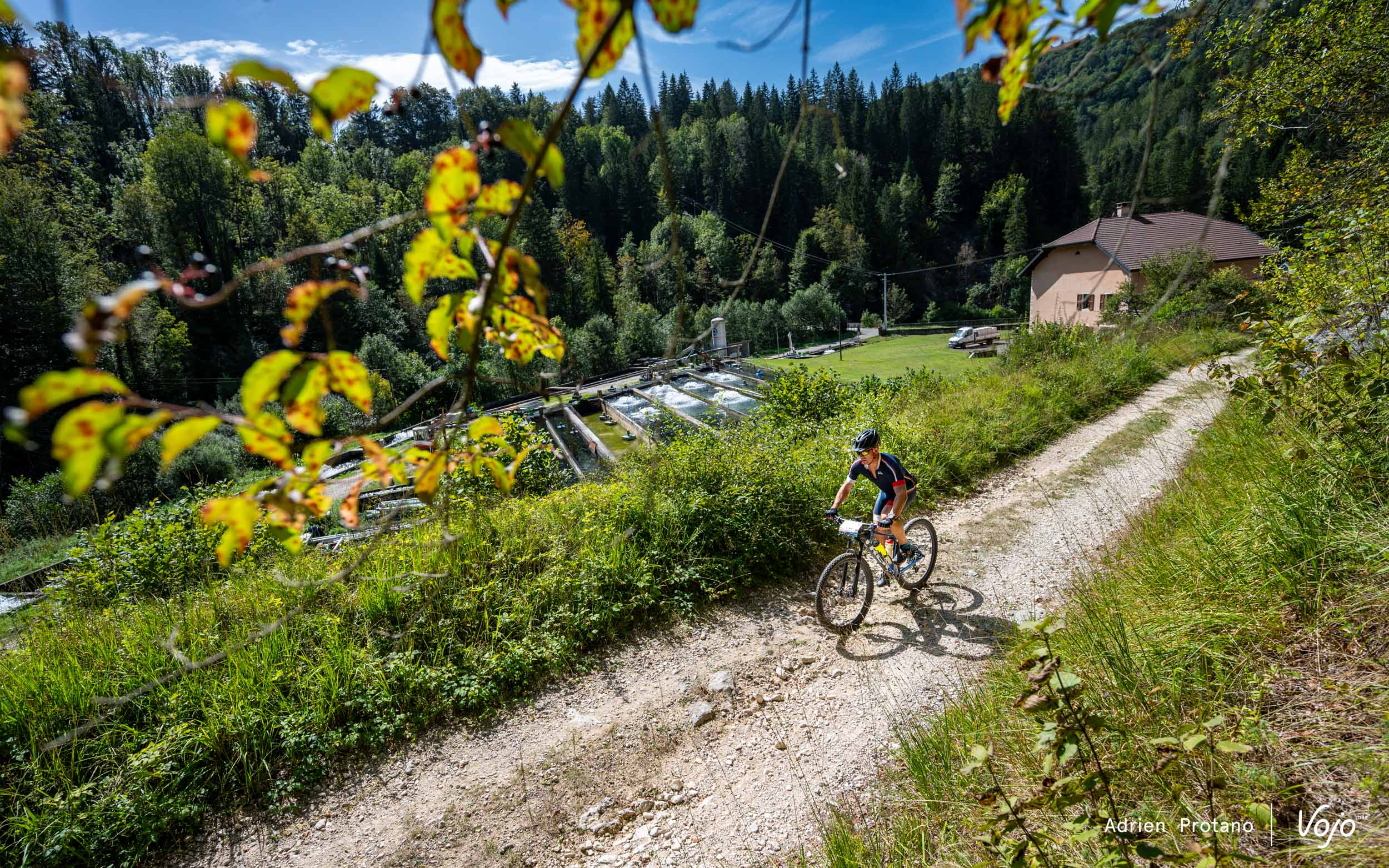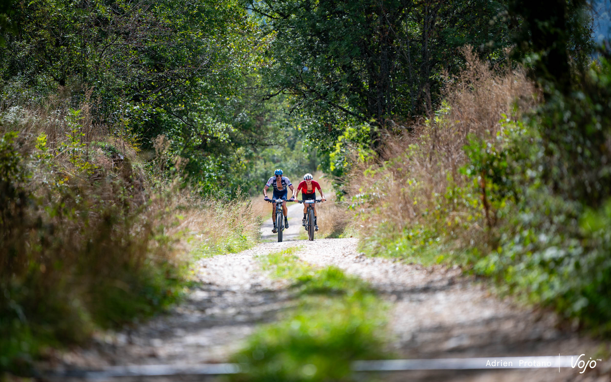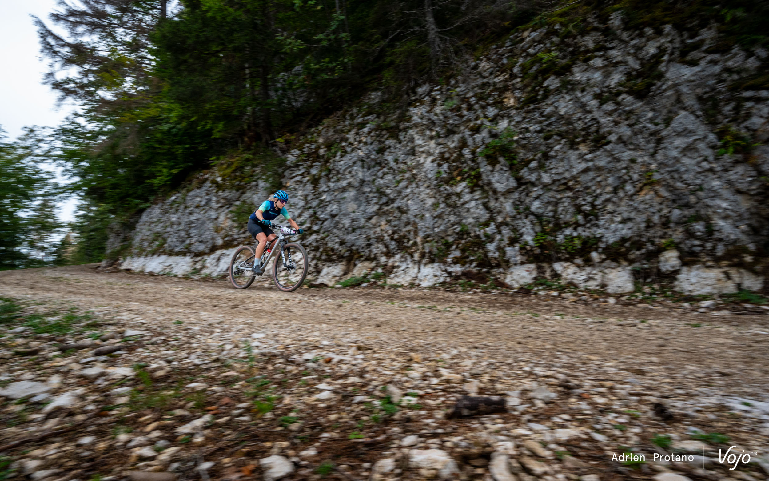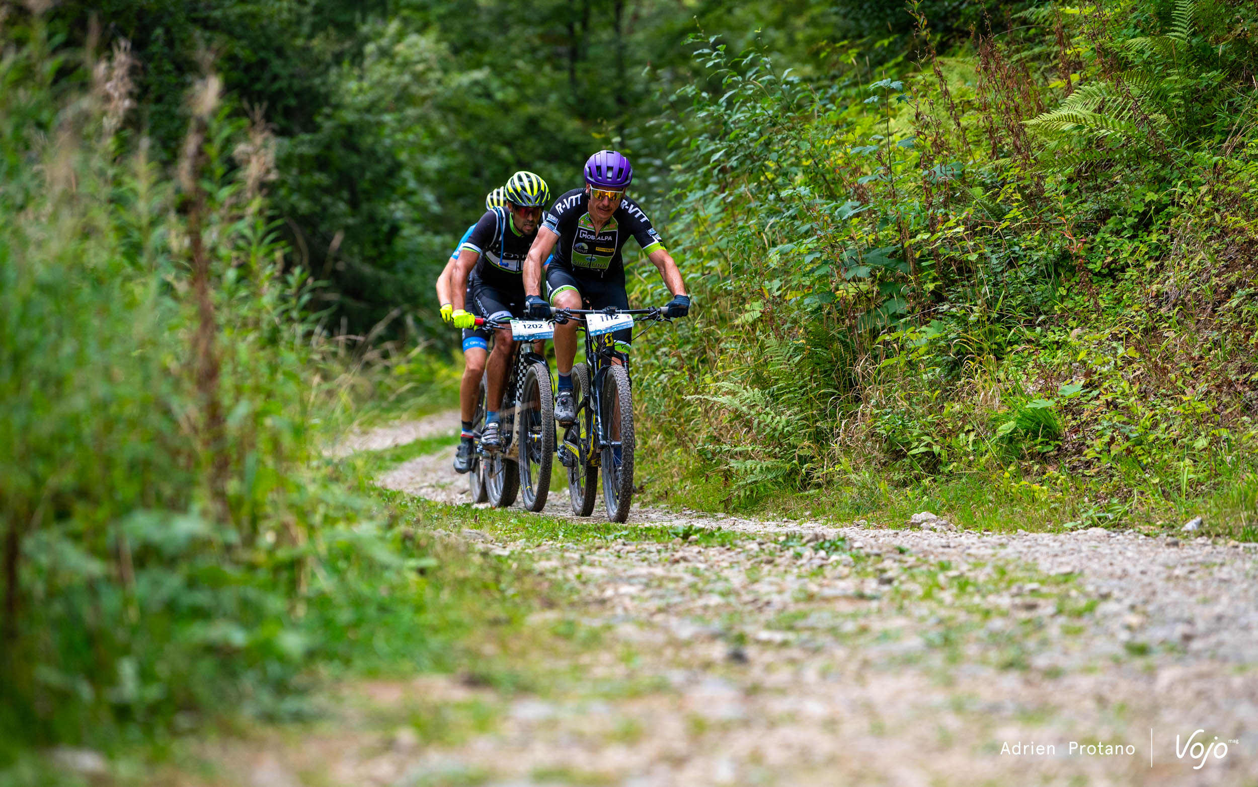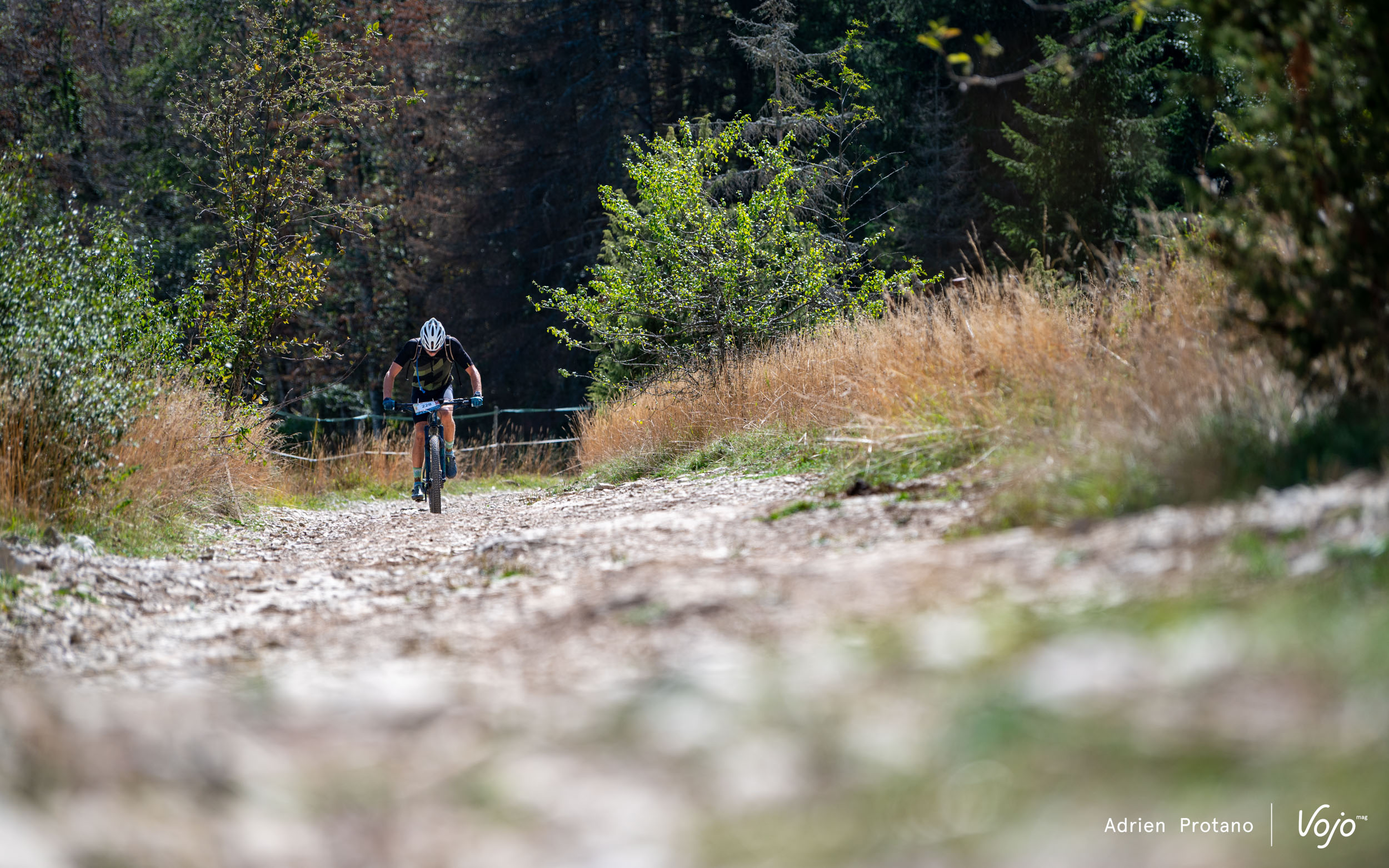 L’ascension se poursuit sur un chemin forestier où les pilotes Élites maintiennent un rythme effréné, comme s’ils abordaient une épreuve olympique de cross-country… or 100 kilomètres sont au programme de la course hommes, tandis que les femmes s’élancent pour 70 kilomètres.