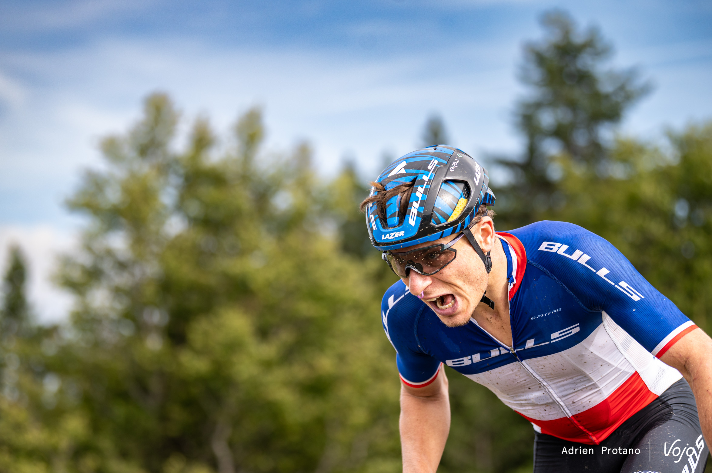 Maillot tricolore sur les épaules, Axel Roudil-Cortinat, bascule dans la descente en 4e position, juste derrière le Suisse Stauffer Hansueli. Il est marqué par l’effort, mais on sait que le champion de France est capable de puiser loin dans ses réserves pour signer une bonne place malgré la fatigue.