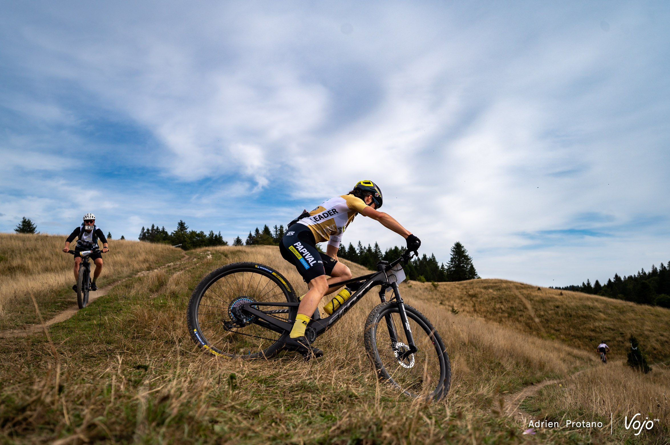 Ici au second plan, dans la roue de l’Allemand Sascha Weber (qui finira par abandonner), le champion de France de la discipline, Axel Roudil-Cortinat, reste également bien placé. Il a pourtant roulé plus de 5 heures la veille sur la coupe du Monde de marathon.