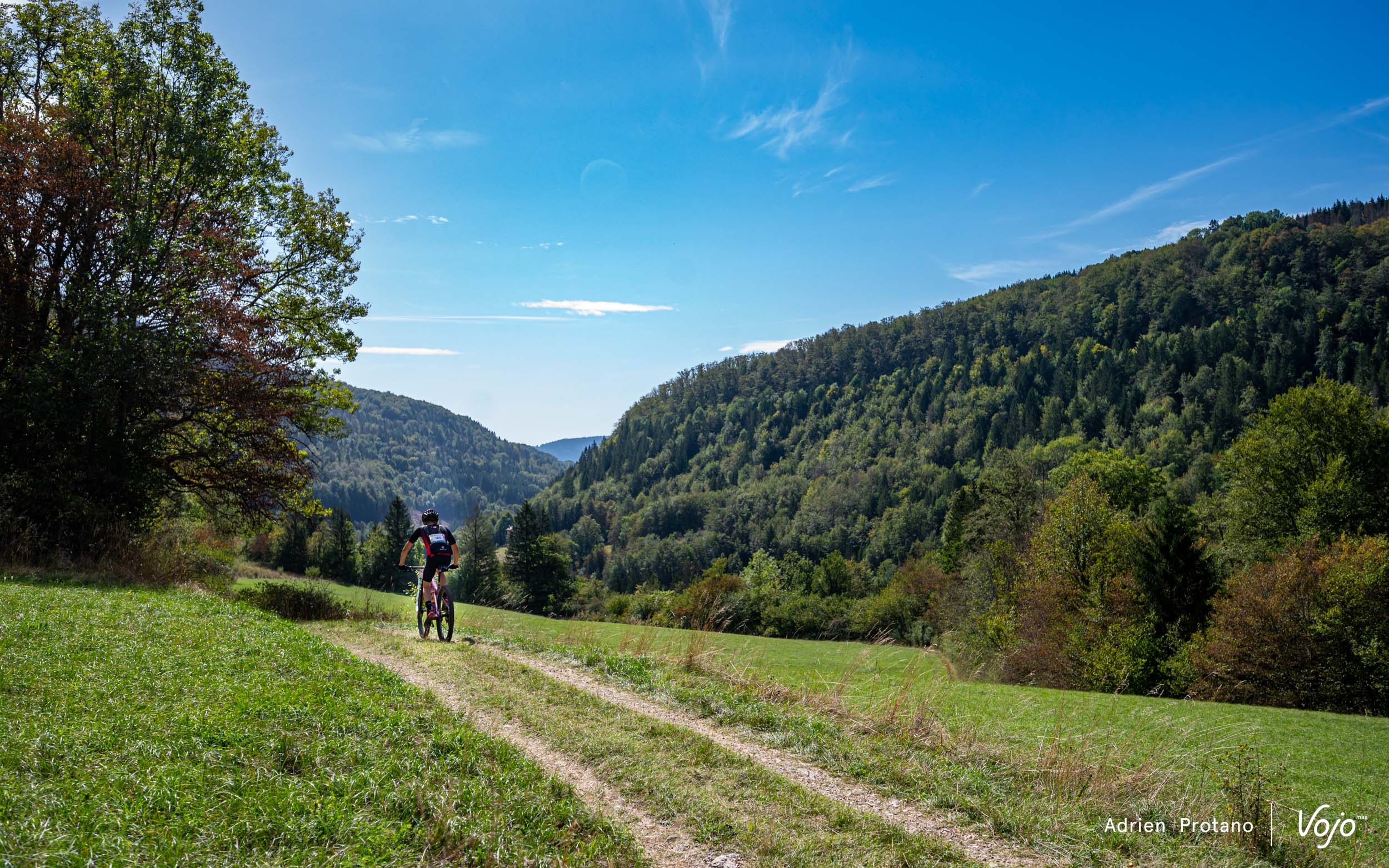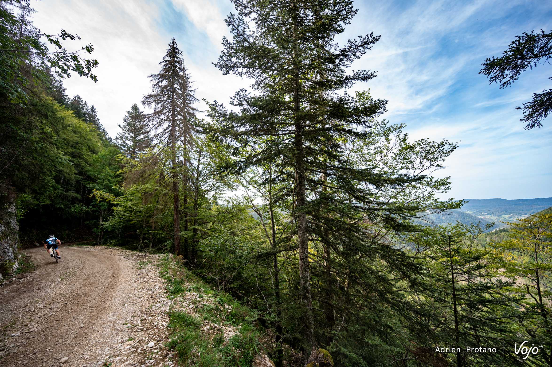 C’est sur le tracé de la grande traversée du Jura VTT que le parcours nous emmène afin de rejoindre le village de Giron et son ravitaillement. Si le comté local et un bon verre de coca frais nous trottent déjà dans le coin de la tête, il nous reste pourtant plus d’une dizaine de kilomètres avant de pouvoir en apercevoir la couleur !