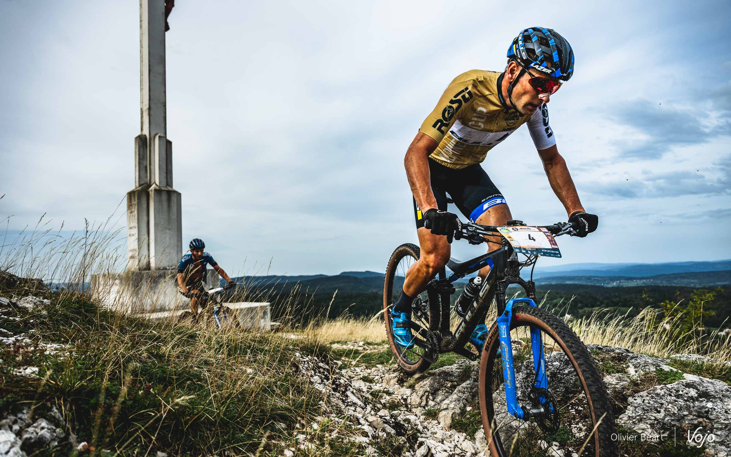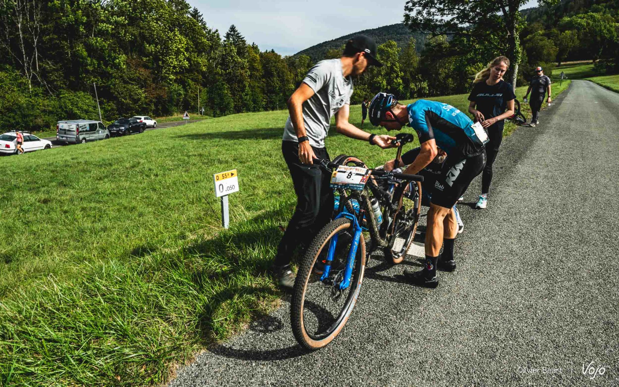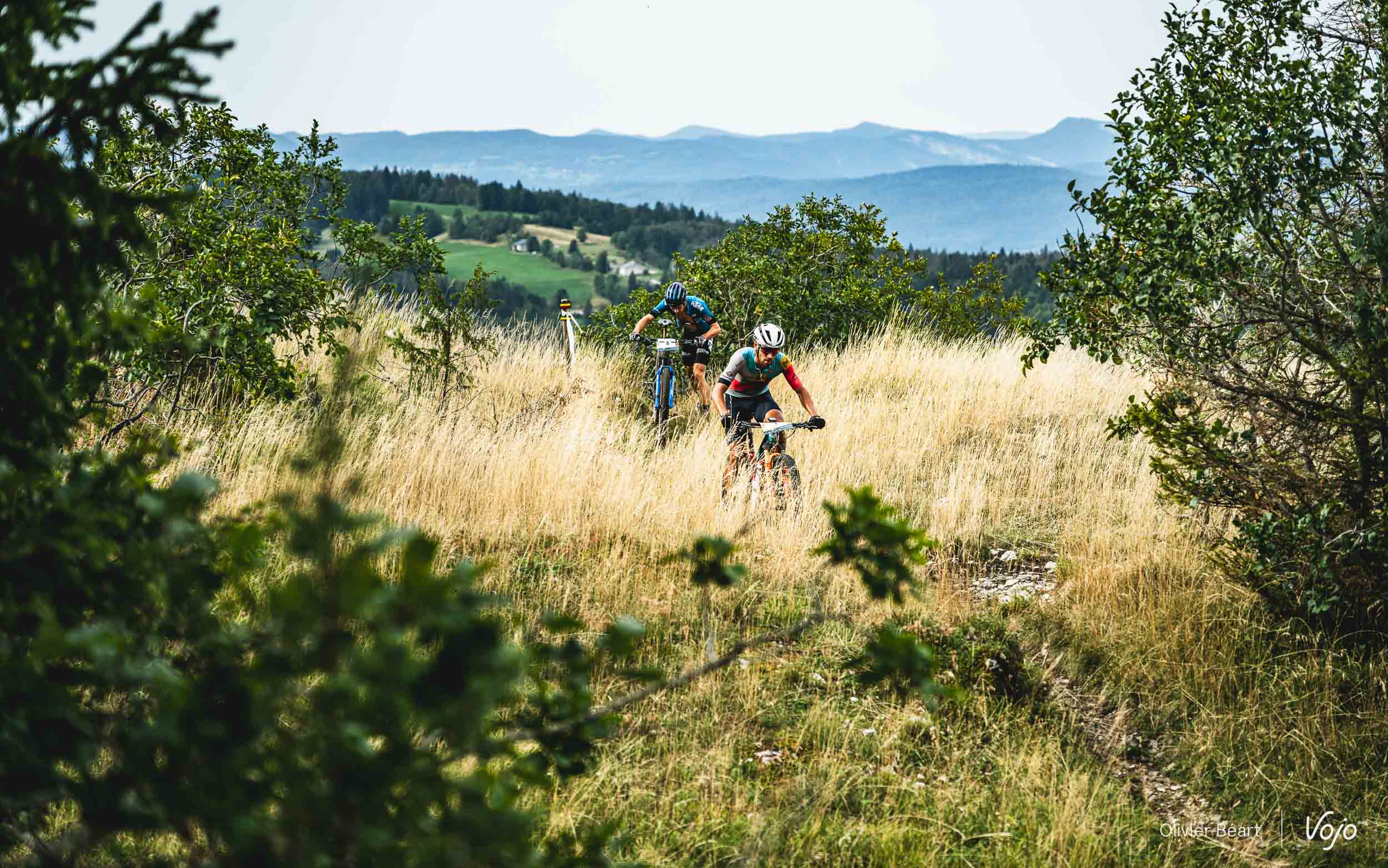 Impossible de suivre les meilleurs dans la descente vers St-Claude, et c’est donc au niveau du magnifique panorama de la Croix des Bouchoux que nous retrouvons la tête de course. Au terme d’une ascension longue et cassante, Hugo Drechou a réussi à se détacher en compagnie de l’Allemand Martin Frey.