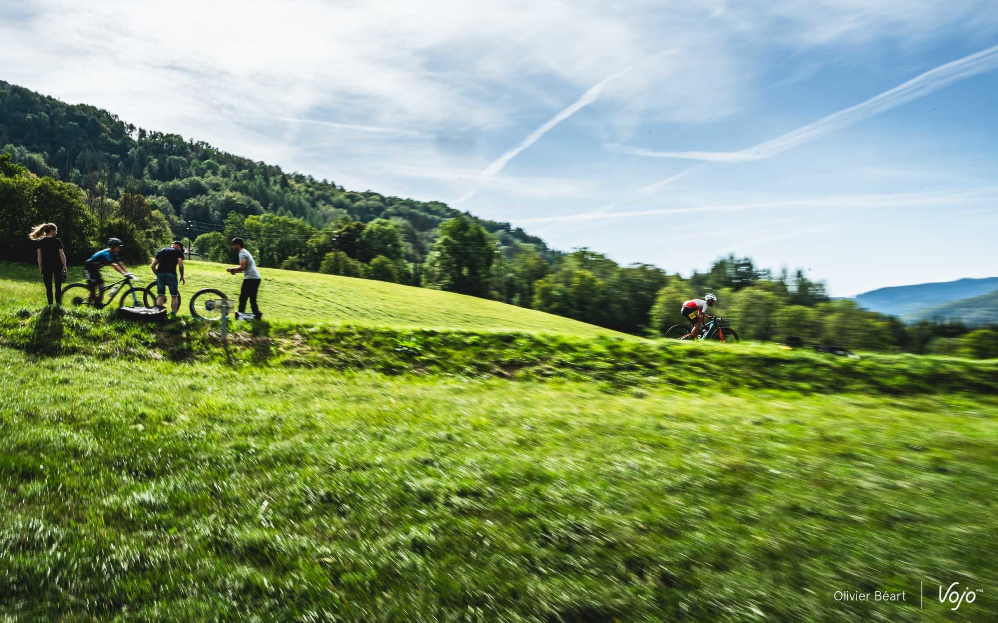Au niveau de leur second passage sur le crêt du Nerbier, nous retrouvons les pilotes Élite masculins. L’Allemand Martin Frey est passé en tête, poursuivi par le vainqueur sortant Hugo Drechou.