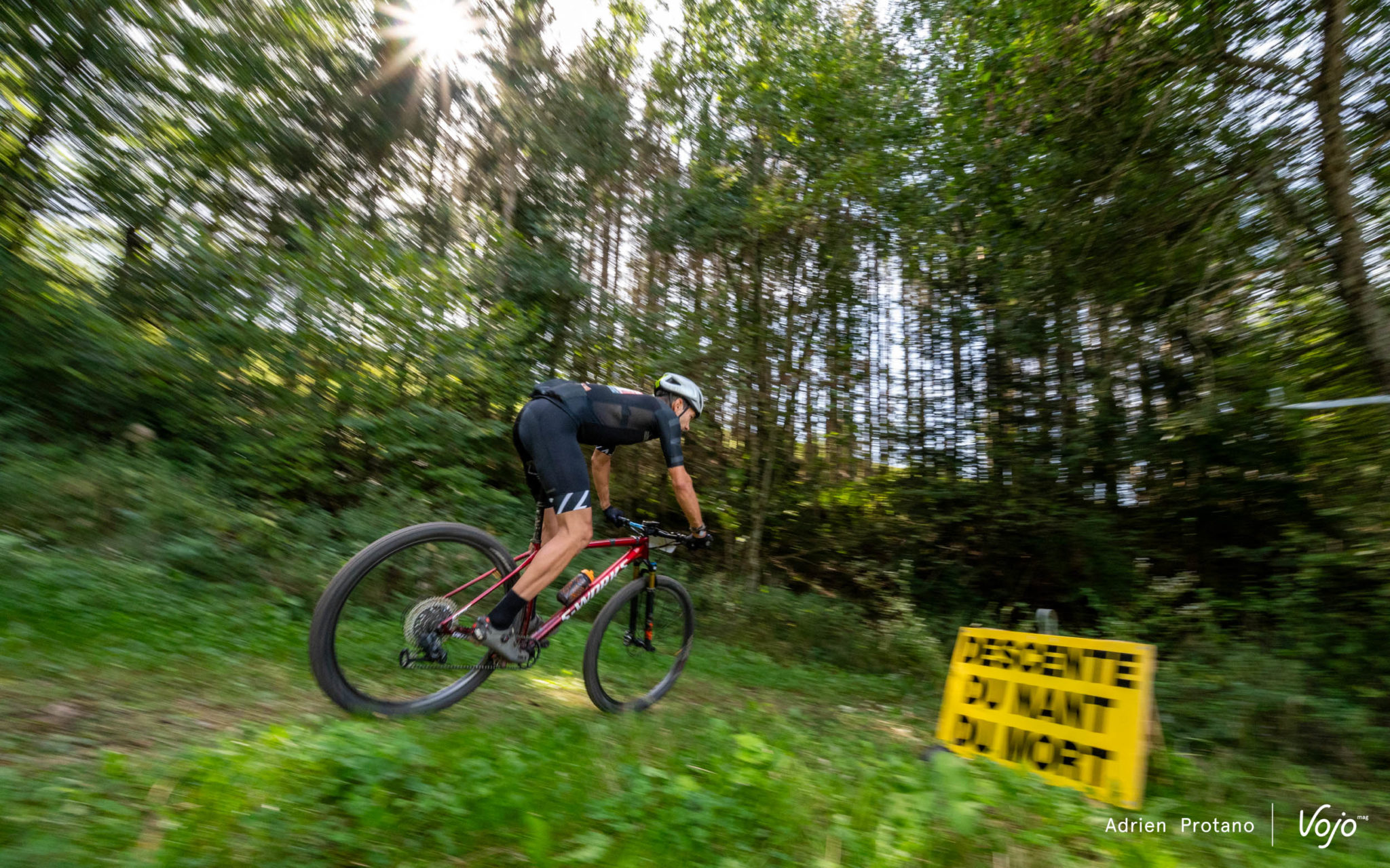 Maillot tricolore sur les épaules, Axel Roudil-Cortinat, bascule dans la descente en 4e position, juste derrière le Suisse Stauffer Hansueli. Il est marqué par l’effort, mais on sait que le champion de France est capable de puiser loin dans ses réserves pour signer une bonne place malgré la fatigue.