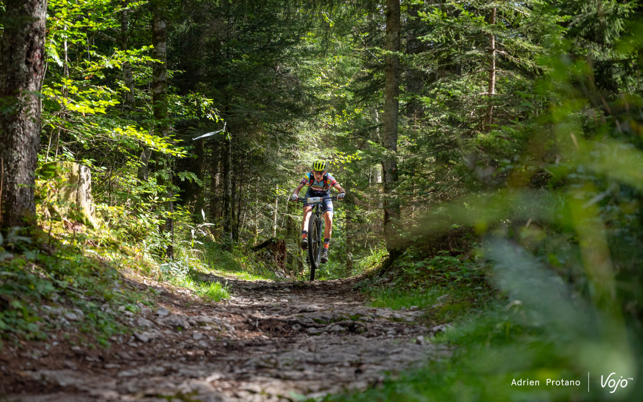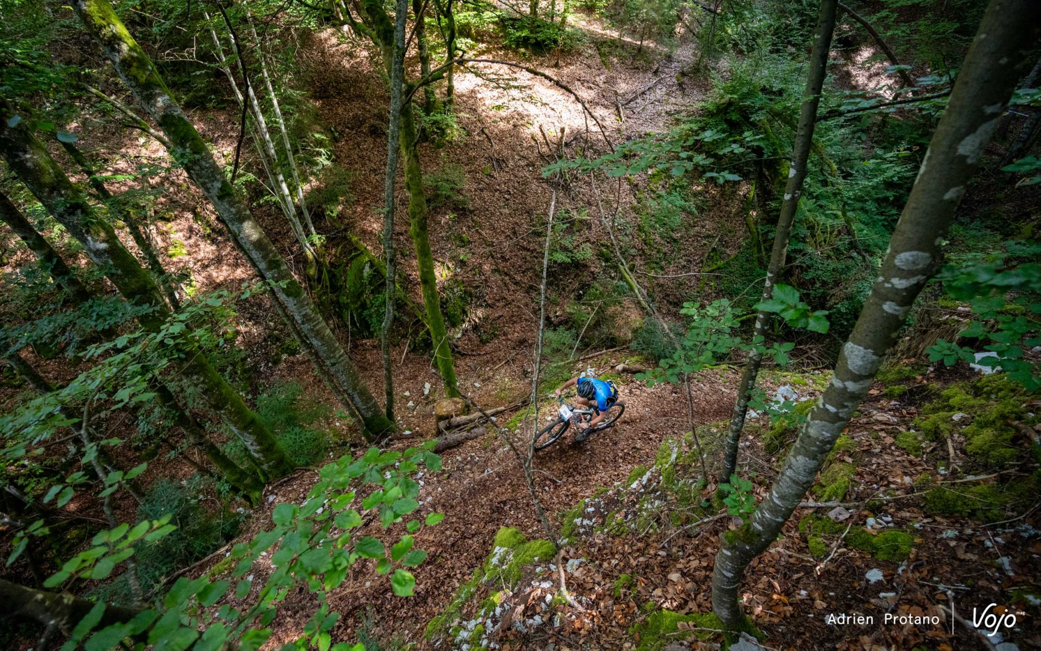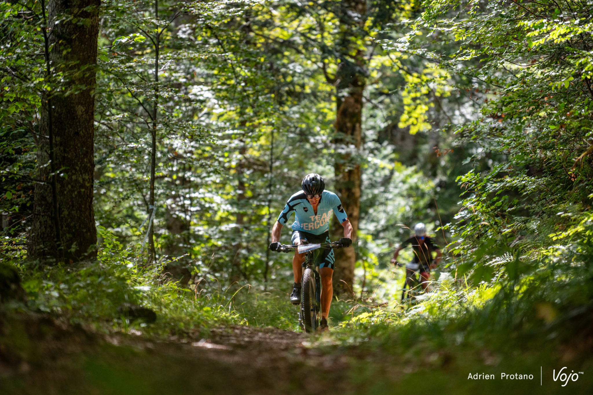 L’ascension se poursuit sur un chemin forestier où les pilotes Élites maintiennent un rythme effréné, comme s’ils abordaient une épreuve olympique de cross-country… or 100 kilomètres sont au programme de la course hommes, tandis que les femmes s’élancent pour 70 kilomètres.