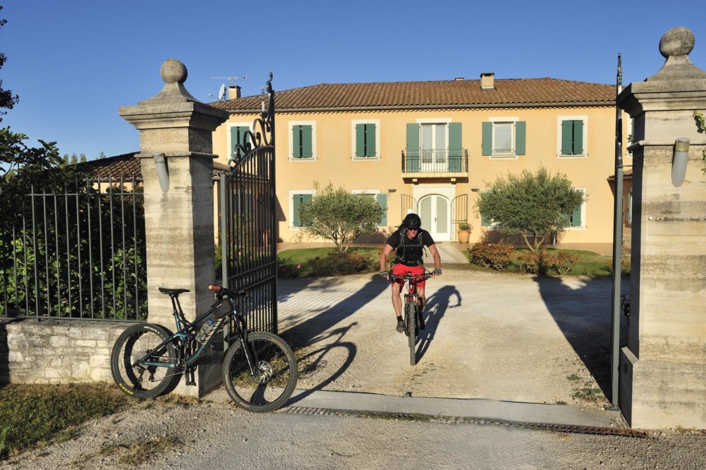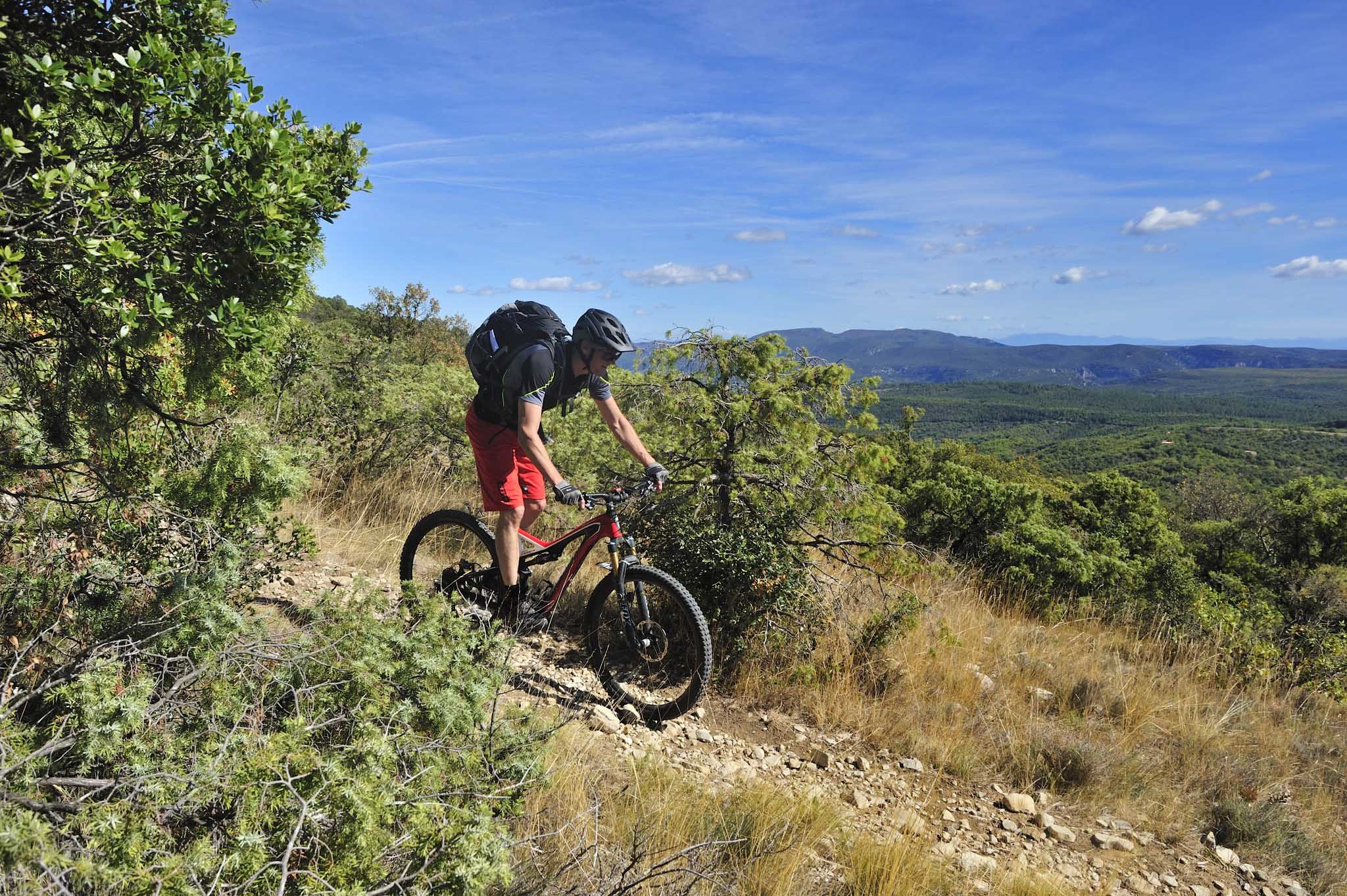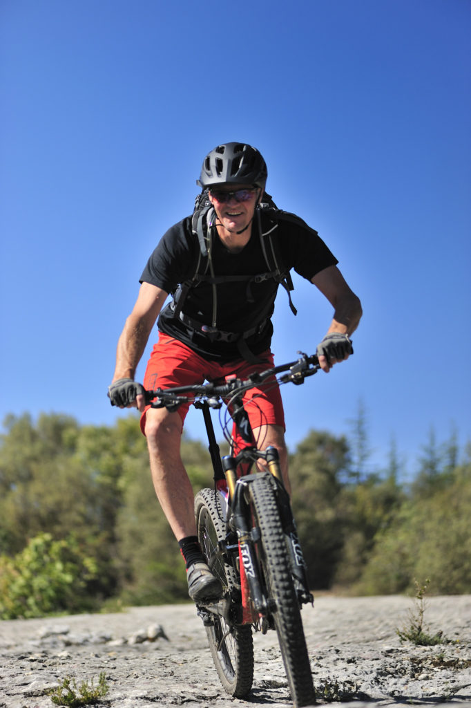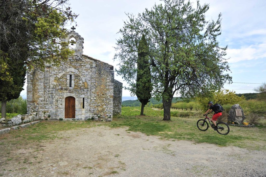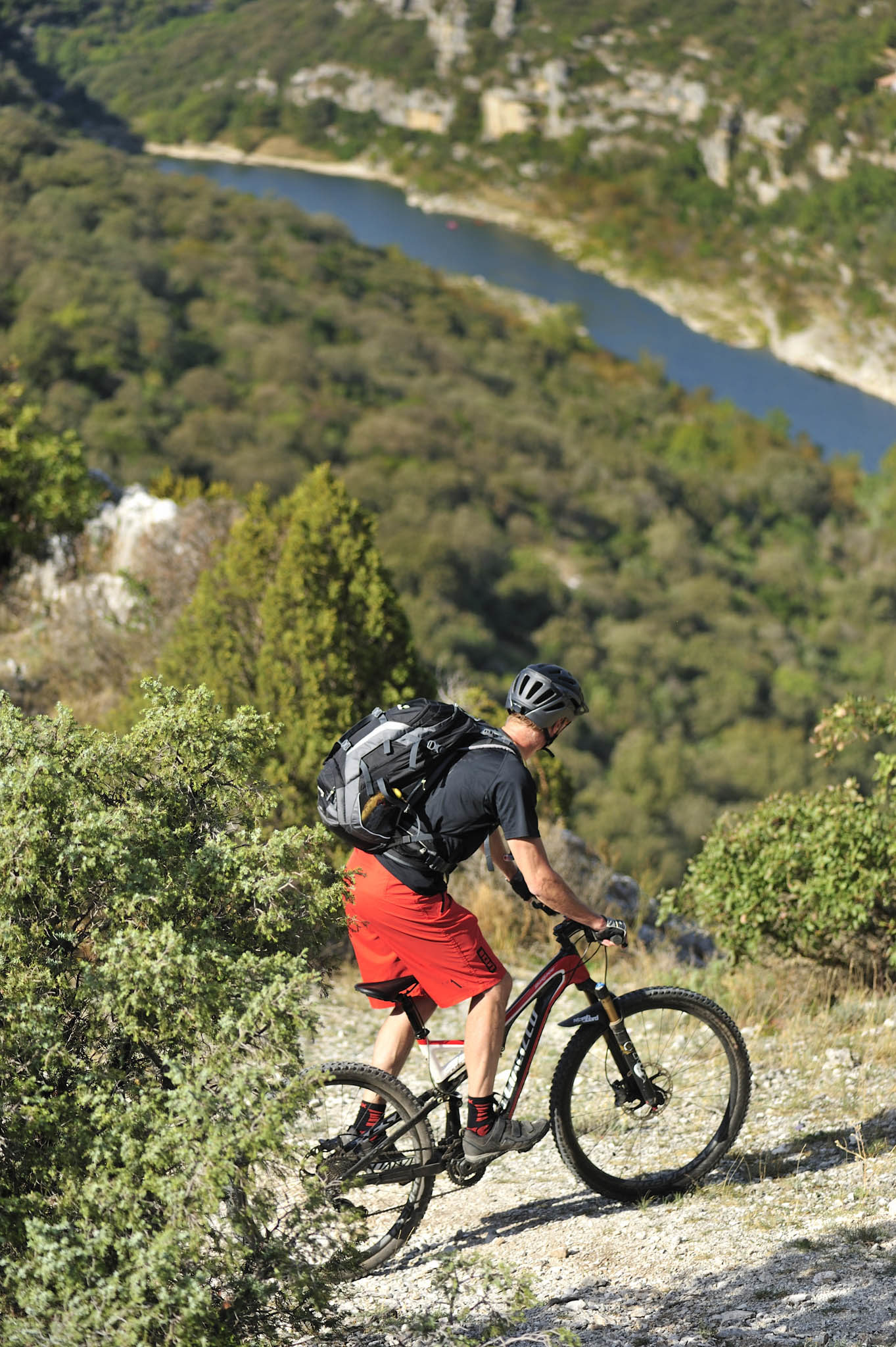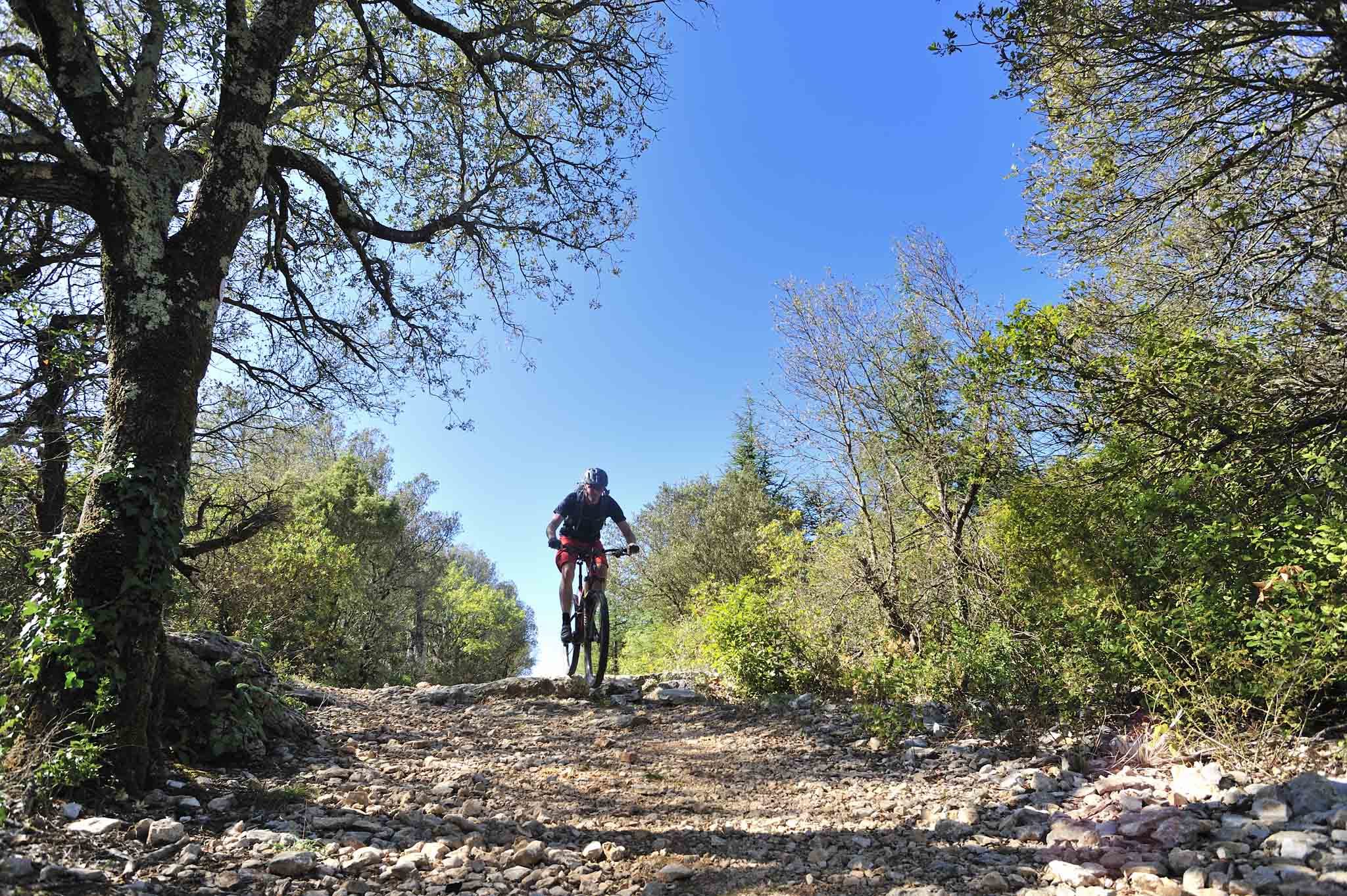 Ereintés, nous basculons du sommet vers l’autre versant. Tout n’est que chaos : nous sommes heureux d’avoir tiré nos gros VTT dans la côte. Ici, ils se montrent plus à leur aise. La folle descente est une idylle pour tout vététiste. Technique mais peu dangereuse si l’on est maître de sa monture. Les belles courbes s’enchaînent à des virages en épingles. Entre pinèdes et oliveraies, nous nous rapprochons de l’Ardèche.