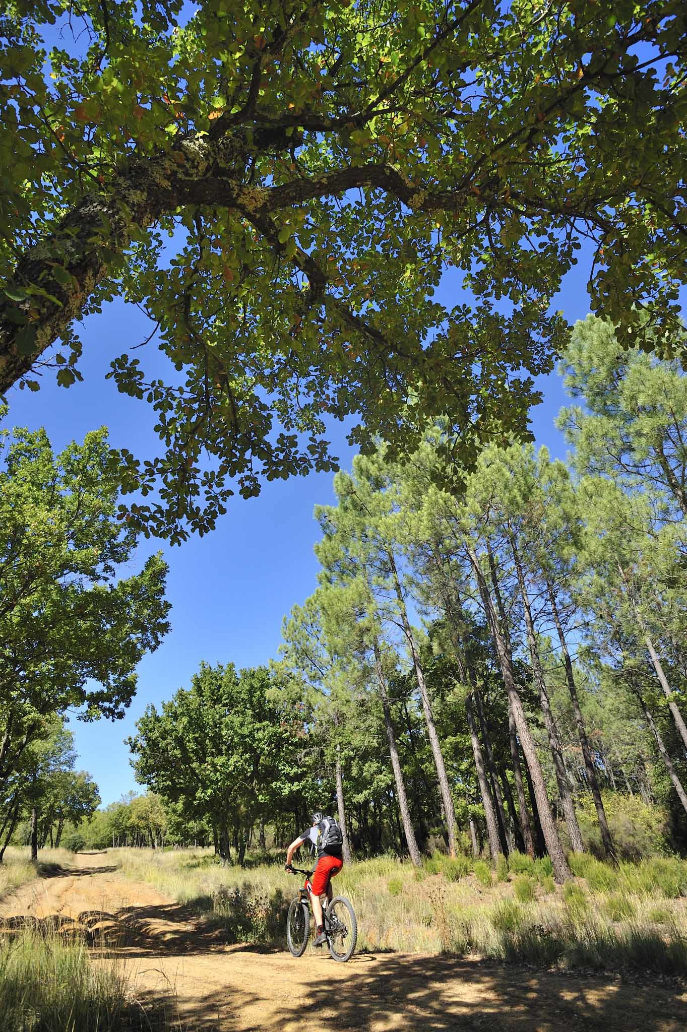 Premiers tours de roues et premiers chahuts. Les suspensions talonnent, tabassent sur le roc. La perméabilité de la roche calcaire vide les sentiers et chemins de la boue. Sur le single escarpé, les forêts de chênes et de châtaigniers forment un tunnel végétal dans lequel nous nous engouffrons. Un vrai maquis qui nous empêche d’accéder et d’admirer les gorges du Chassezac, toutes proches.