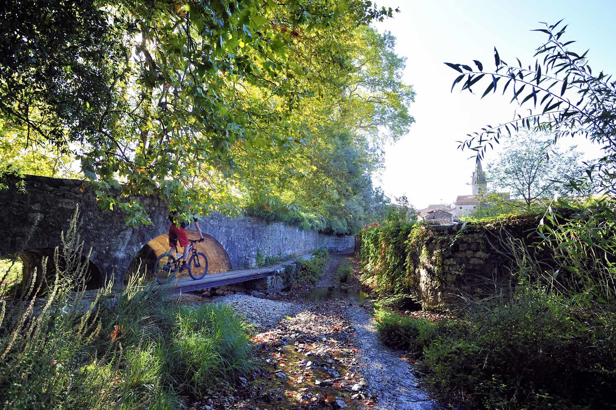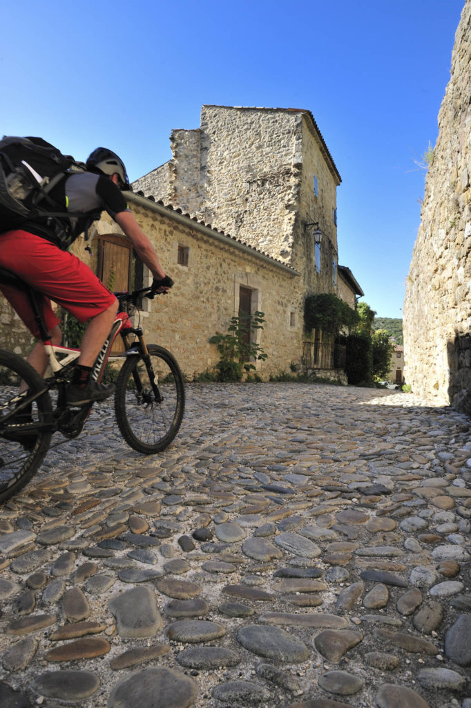 A l’approche du village classé d’Aigueze, la trace se durcit, s’engage sur une crête aérienne. Les gorges vertigineuses, à quelques mètres de nos roues, offrent enfin un panorama sur la rivière.