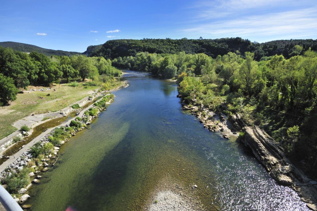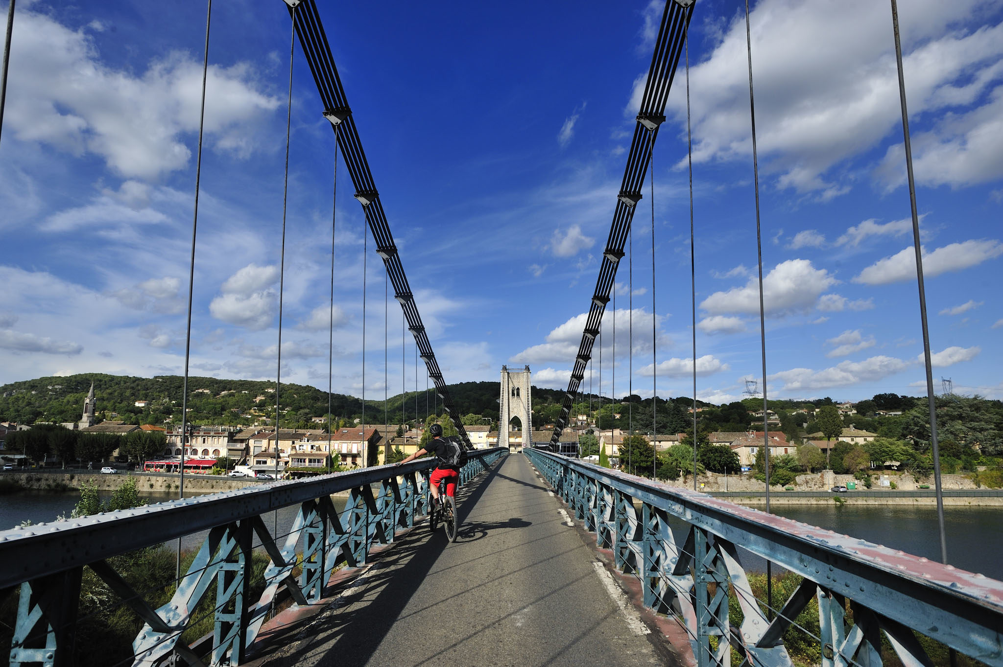 Une descente et nous traversons l’Ardèche sur le pont de Saint-Martin d’Ardèche. Sur l’autre rive, c’en est fini du plateau calcaire. Pour rejoindre Bourg-Saint-Andéol, la dernière étape de la grande traversée longe des vignes et offre un paysage de plus en plus ouvert vers la vallée du Rhône.