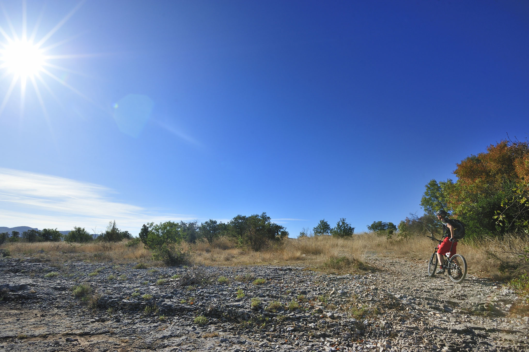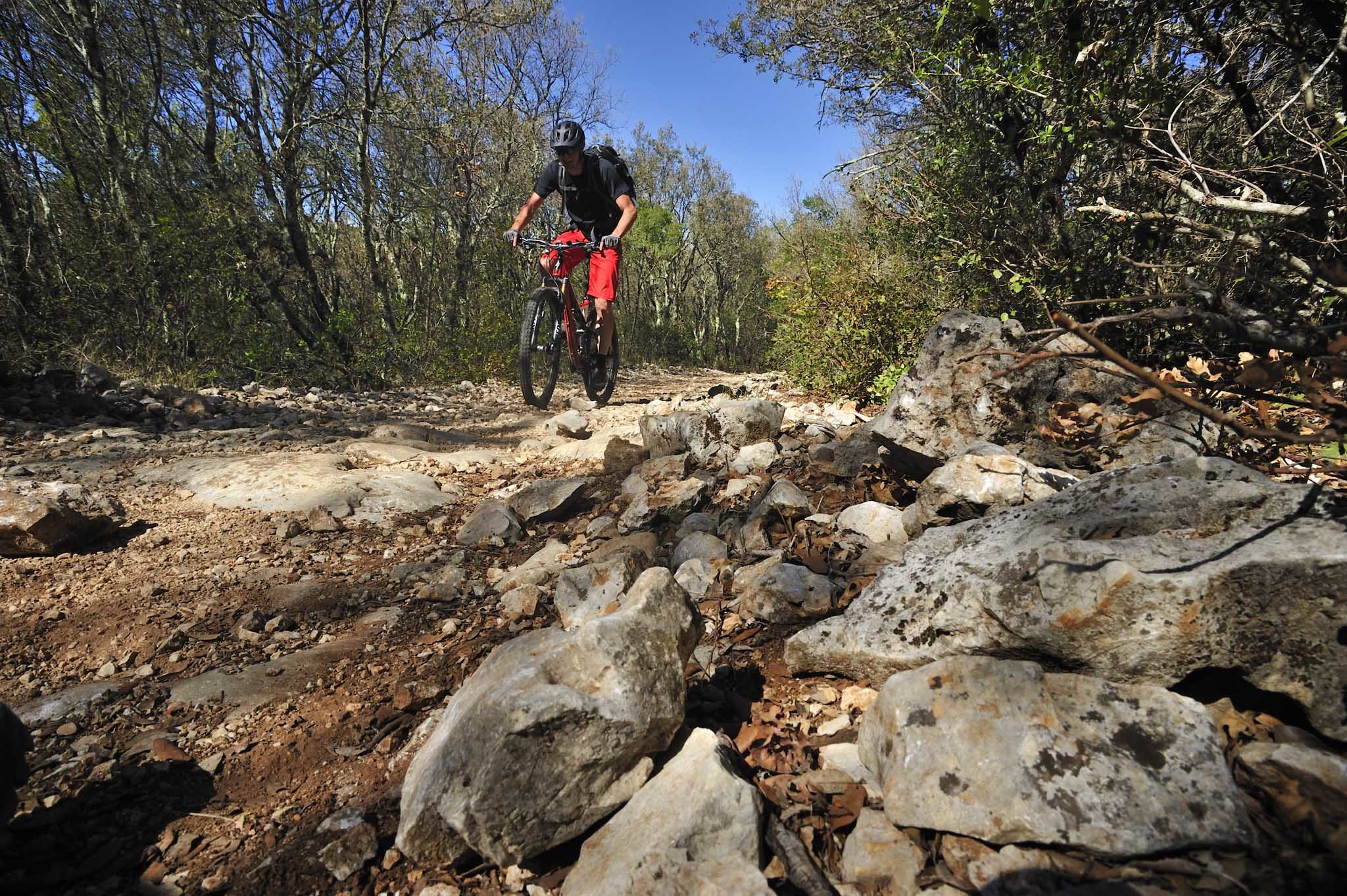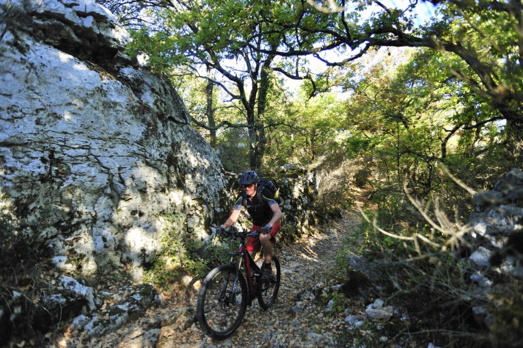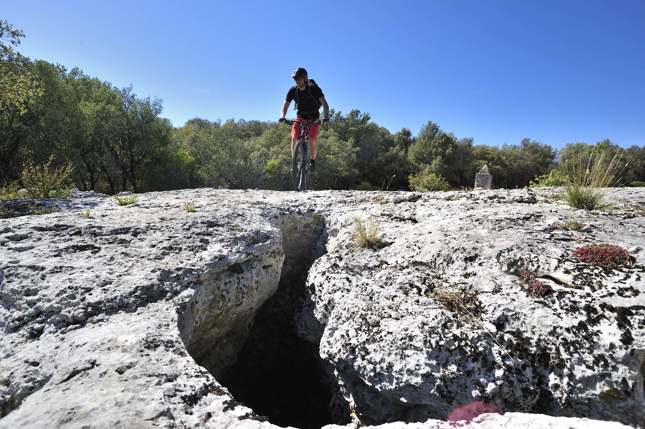 Sur le plateau d’Orgnac, les lapiaz fissurent le bloc calcaire : la roue avant pourrait se coincer dans l’anfractuosité ! Gare au choix de la mauvaise trajectoire…
