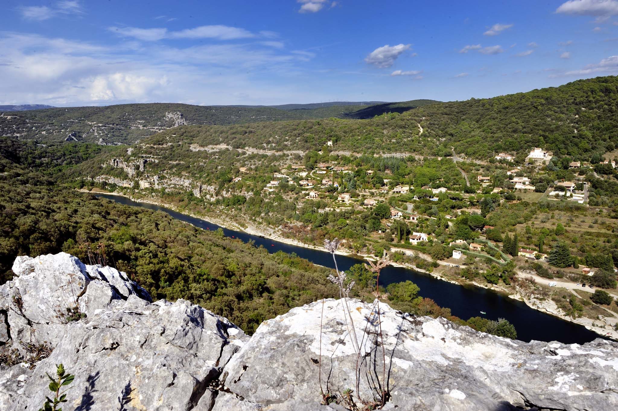 Nous quittons la forêt parfumée du plateau ardéchois pour rejoindre la rivière. Le sentier se fraye un passage entre les chênes verts au pied desquels s’épanouissent les bruissons épineux qui lacèrent les tibias. La caillasse est rugueuse, tranchante.