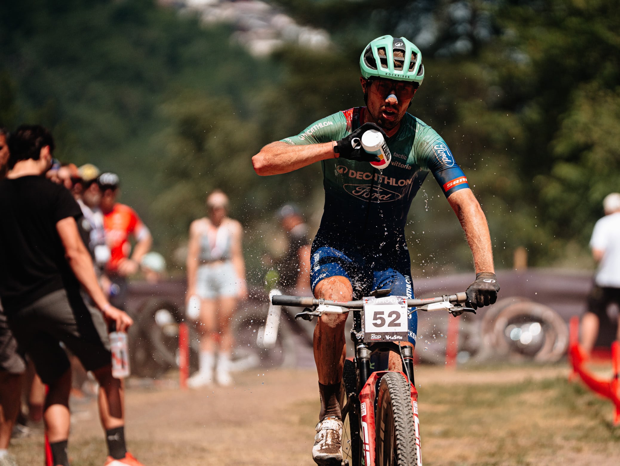 Non, je ne bois pas pendant le short track. C’est un format court – environ 20 minutes – et le bidon représente un poids supplémentaire qu’on préfère éviter. L’hiver, en cyclo-cross, je roule déjà une heure sans boire, donc je suis habitué. Ce n’est pas nouveau pour moi. D’ailleurs, même en XCO, à l’époque où on avait encore deux feed zones, j’étais l’un des seuls à retirer carrément le porte-bidon. Je prenais une gourde à la zone, je buvais une gorgée, et je la balançais aussitôt. On repassait toutes les 7 minutes, donc c’était devenu un automatisme. Un gain de poids non négligeable, surtout quand on cherche à grappiller des grammes partout.