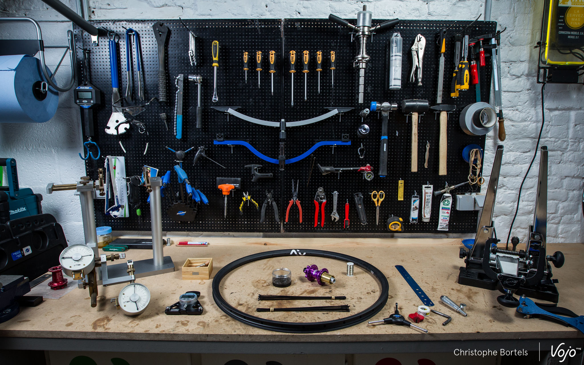 Bienvenue dans mon atelier ! Comme vous le voyez, on y retrouve les outils de base pour la mécanique vélo, mais aussi quelques instruments spécifiques au montage de roues. Je vous en parlerai un peu plus tard, mais chaque chose en son temps !