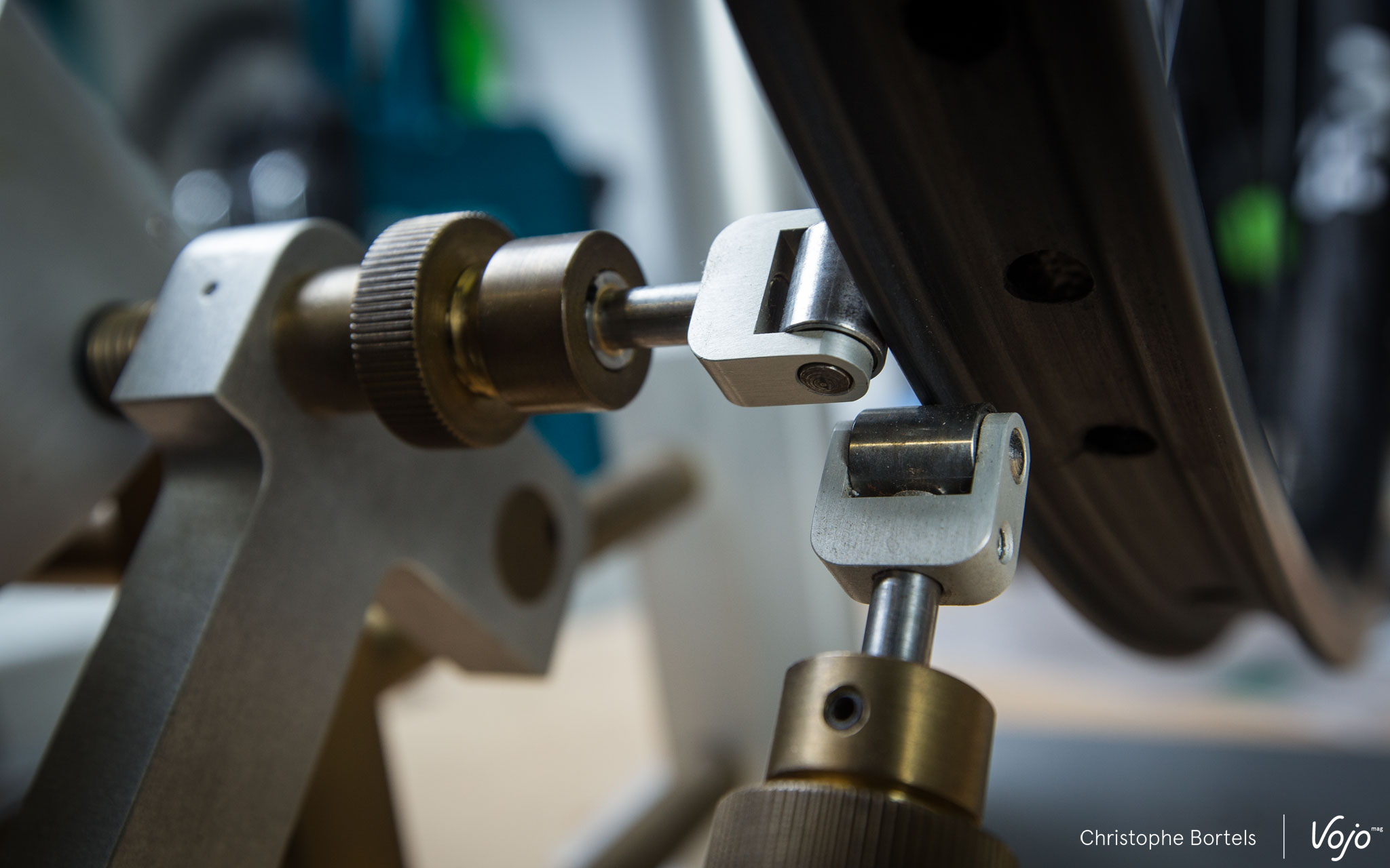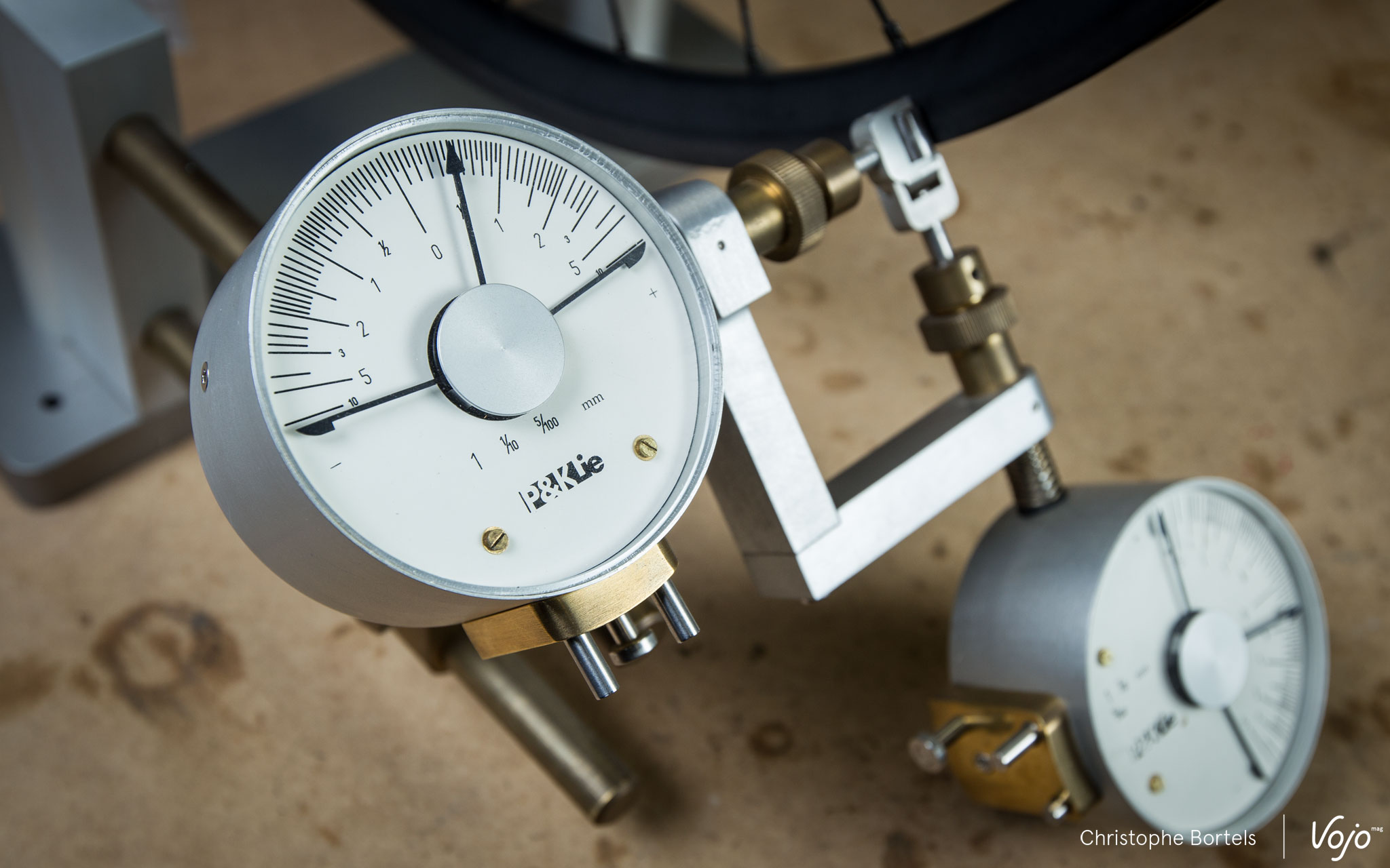 Voici l’un des outils que j’utilise pour contrôler le montage. Je peux le calibrer sur un certain point de la jante, généralement au niveau du trou de valve, et l’aiguille est alors sur zéro. Je fais ensuite tourner la roue et si l’aiguille du cadran supérieur se déplace vers +1 ou -1, c’est qu’il y a une déformation latérale vers la droite ou la gauche, autrement dit un voile. Le cadran du dessous indique quant à lui une déformation verticale, c’est-à-dire un saut. L’outil permet une précision au 20e de millimètre !