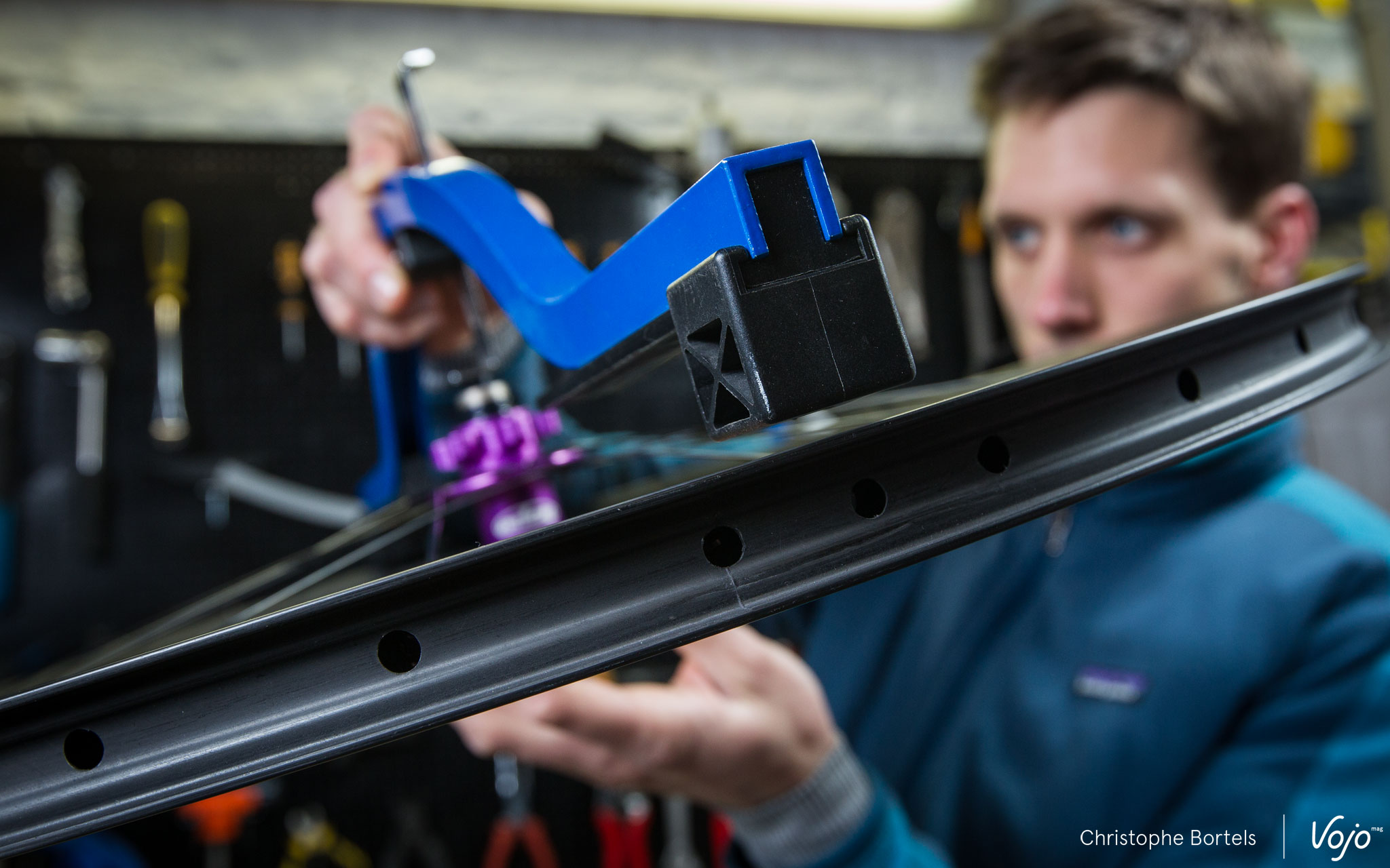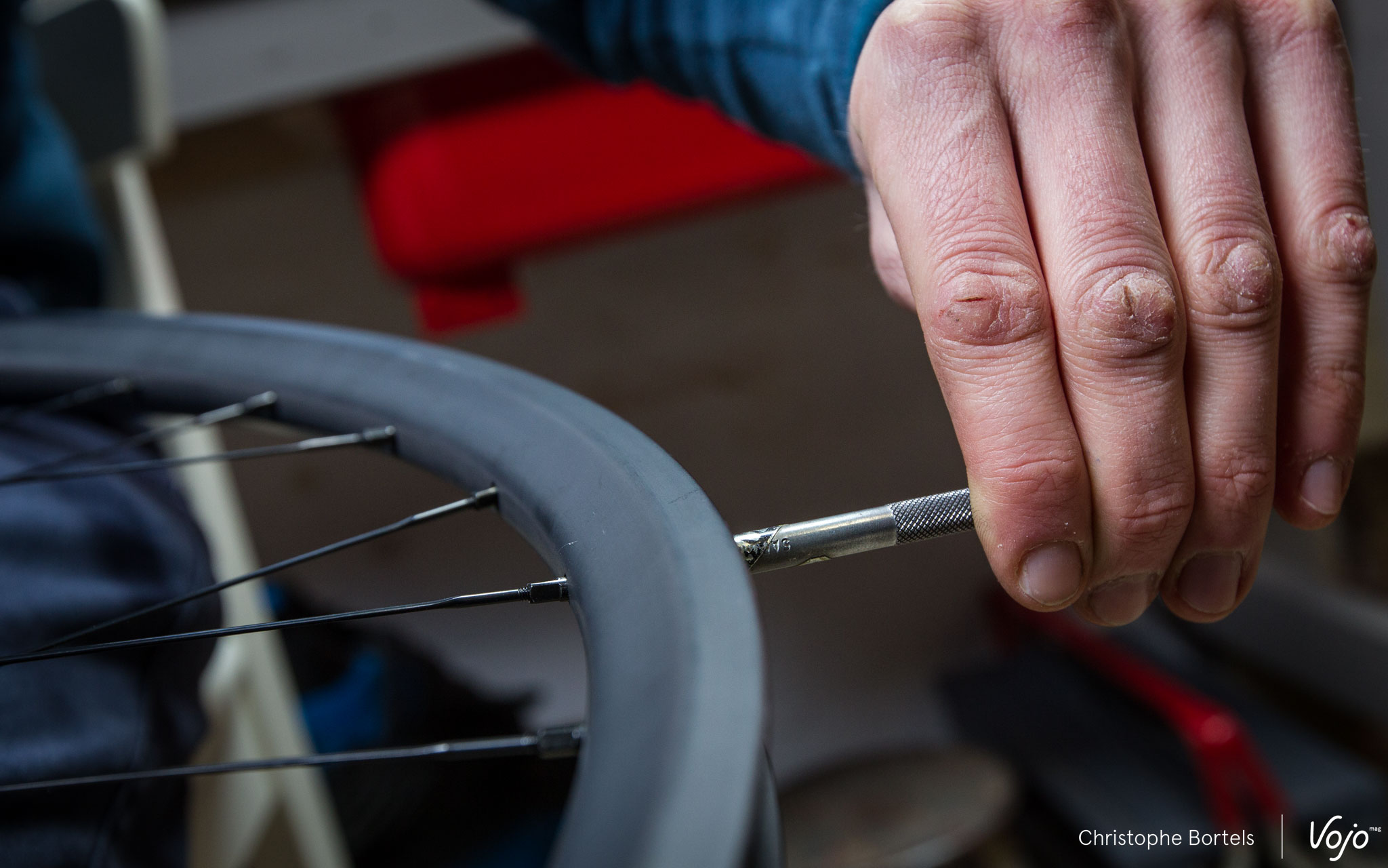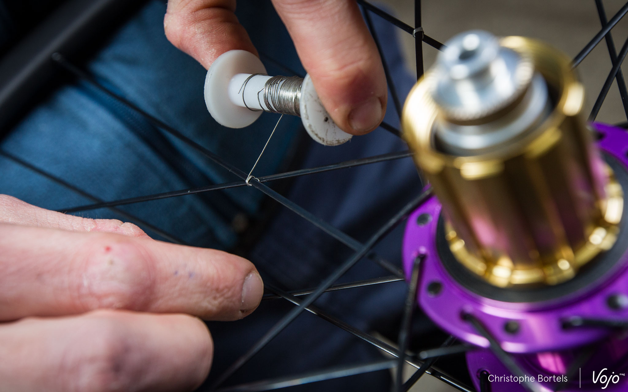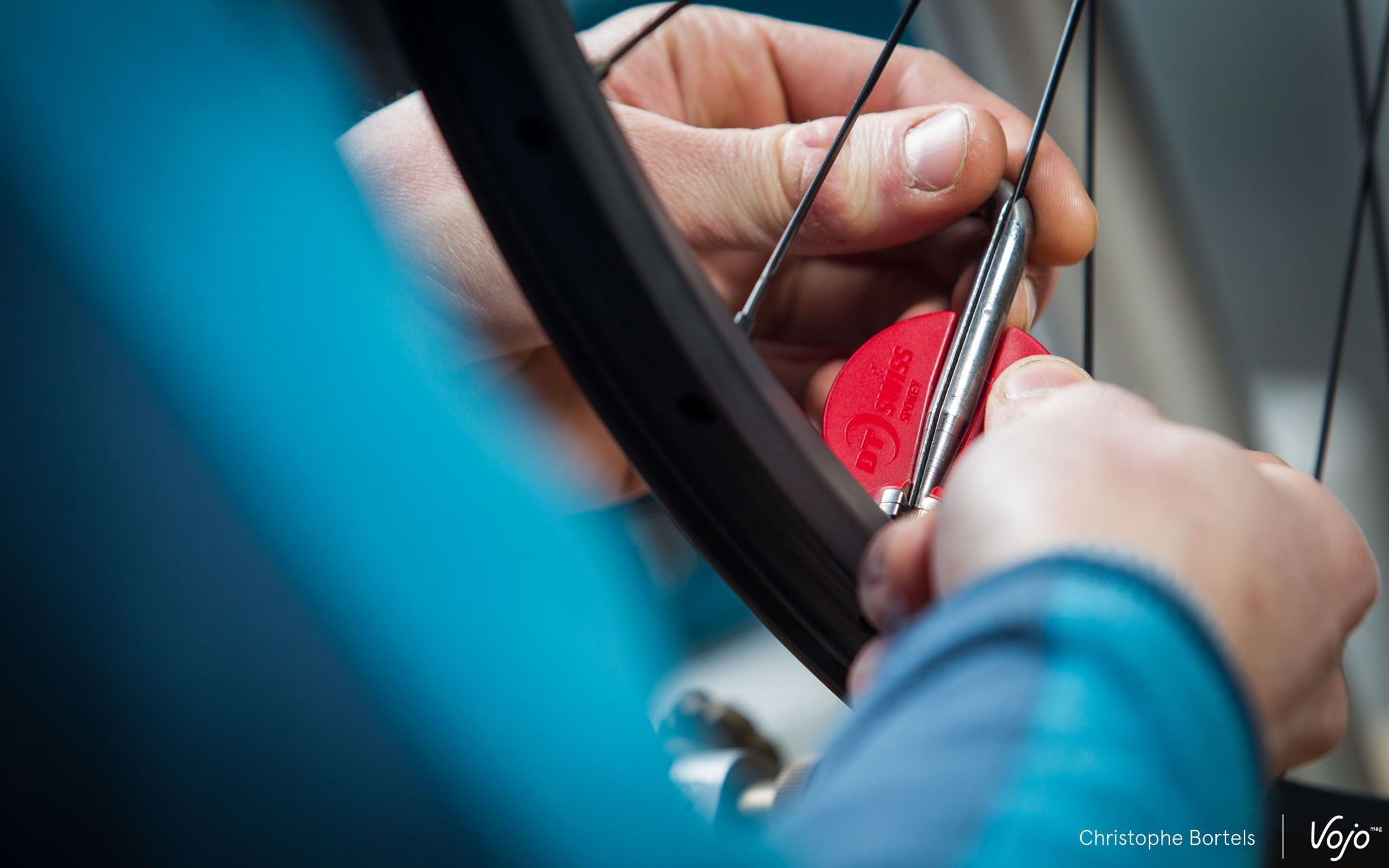 Le réglage du saut ou du voile ne se fait plus alors de manière optimale et il faut donc que le rayon revienne en position initiale avant de pouvoir retenter une retouche. Ce qui est obtenu grâce au cassage qui fait légèrement ressortir la tête de nipple de la jante et permet au rayon de se remettre droit. Si la manipulation n’est pas indispensable sur notre montage avec des rayons plats, qui sont maintenus par une clé durant toutes les étapes afin de ne pas se vriller, je le fais quand même systématiquement.
