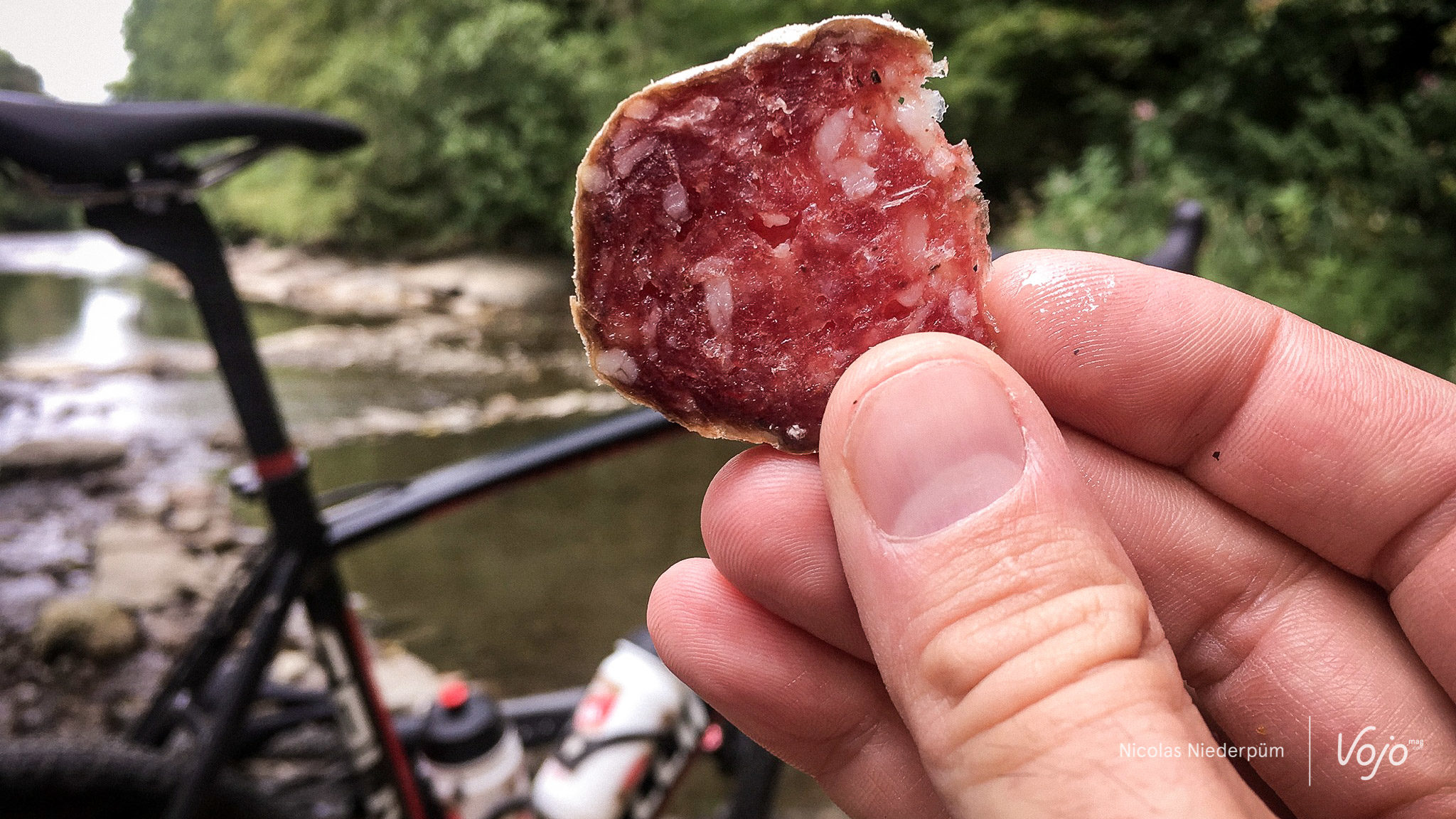 Une petite erreur de trace nous envoie sur un détour d’une vingtaine de kilomètres sur route avant de reprendre le bon chemin. C’est dans cette portion, ni très agréable, ni prévue, que Flo commence à montrer des signes de faiblesse et c’est lors d’une longue côte que le rythme chute vraiment. On fait énormément de pauses, le compteur n’avance plus vraiment et le ciel commence à se montrer menaçant. Si on n’arrive pas à reprendre rapidement notre rythme de croisière, l’arrivée dans les temps est vraiment compromise.