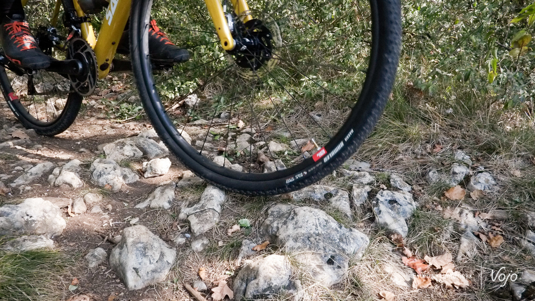 De face, nous avons à faire à des pneus Maxxis Rambler de 40mm de large qui seront par moment remplacés par des Schwalbe Pro One en 30mm.