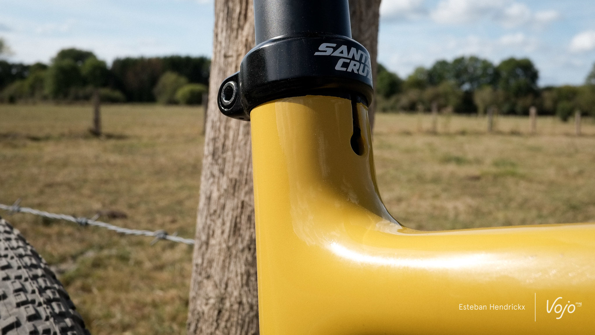 Même si ce n’est pas un test, le geek en moi ne peut pas s’empêcher de vous partager quelques détails de ce fameux “vélo”. De profil, nous avons affaire à un Santa Cruz Stigmata de 2019 en taille 54 (quand il est sorti, on vous l’a présenté ici : dev.vojomag.com/news/santa-cruz-stigmata-2019-une-gravel-plus-vtt-que-jamais). La marque l’annonce à 7,81 kg dans ce somptueux montage délicatement nommé “Red AXS Reserve / Carbon CC / 700cc” mais je dois admettre ne jamais avoir pris le temps de le peser voire même de réfléchir à comment on pèse ce genre de vélo… avec ou sans pédales ?