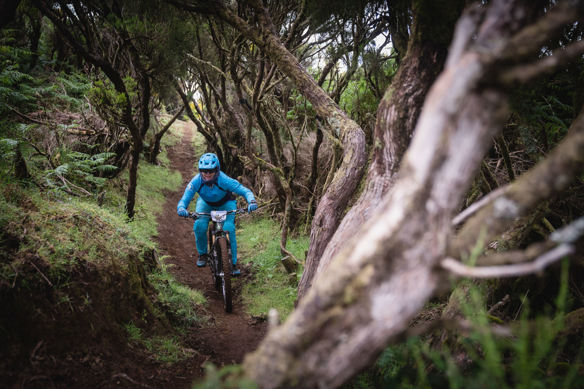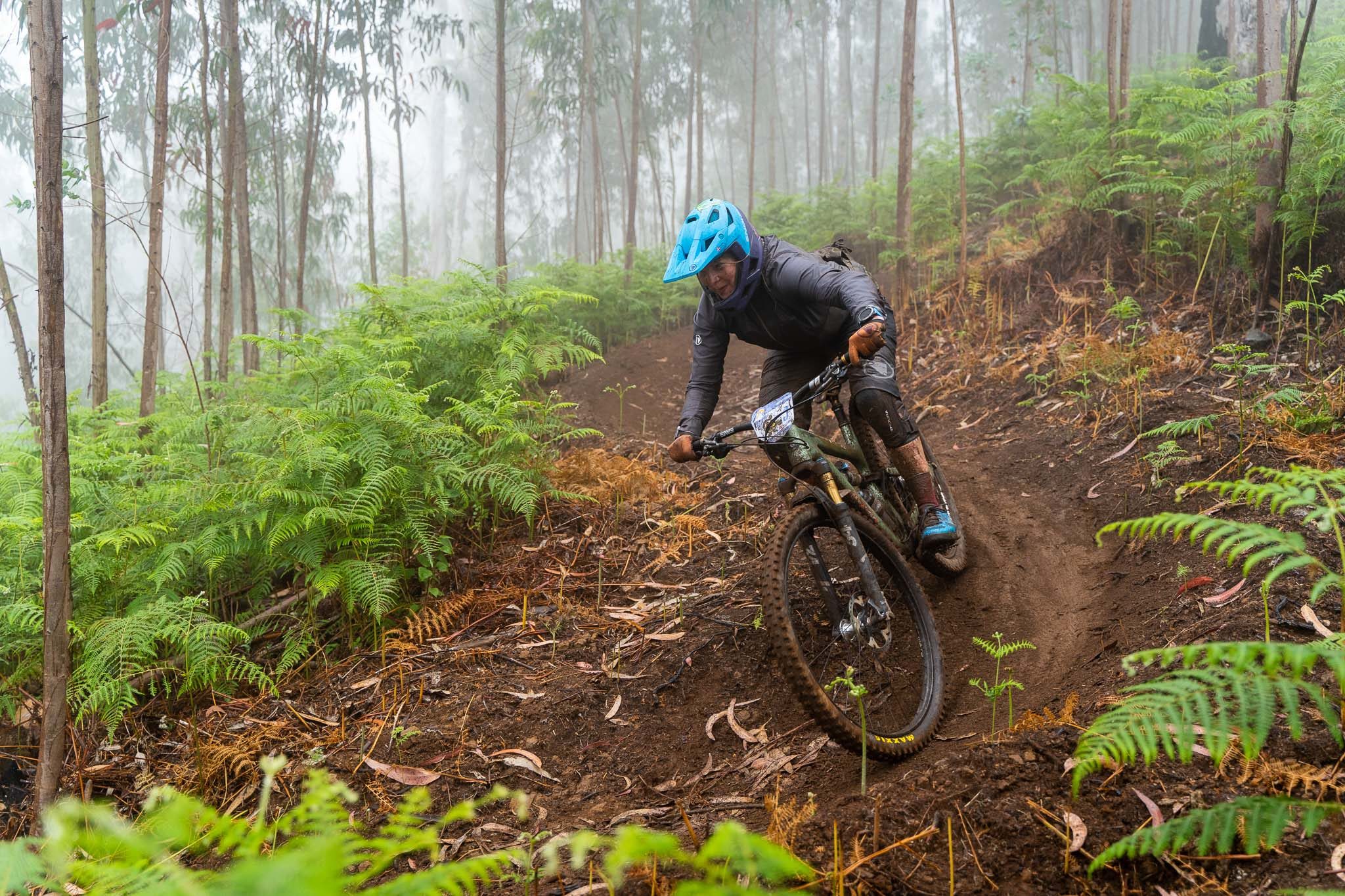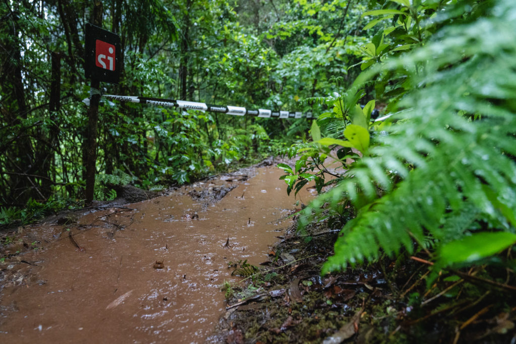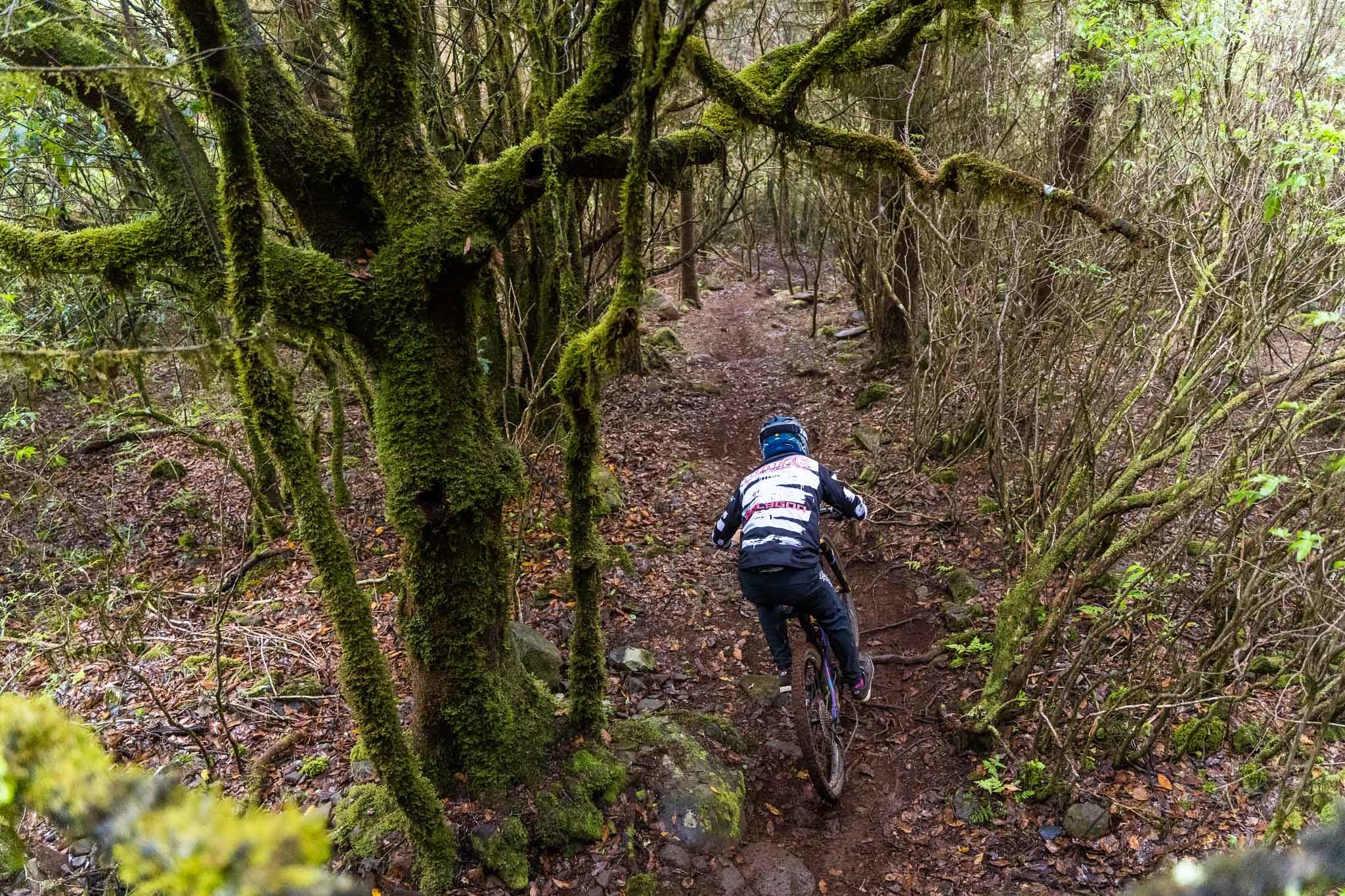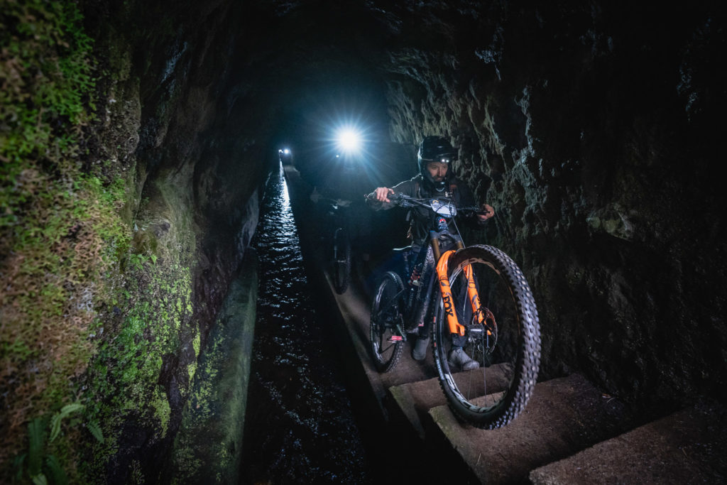 Parmi les riders, bien peu sont confiants avant d’affronter la tristement célèbre « glace noire » de Madère. Finalement, la pluie est si forte que nous ne l’affronterons pas vraiment aujourd’hui. La boue est tellement liquide que les pneus restent propres et c’est en fait assez fun à rouler ! La seule chose vraiment traître, c’est le « Serpent brun », autrement dit les racines !
