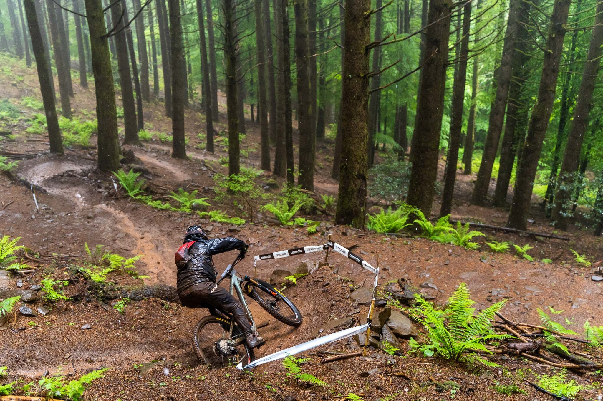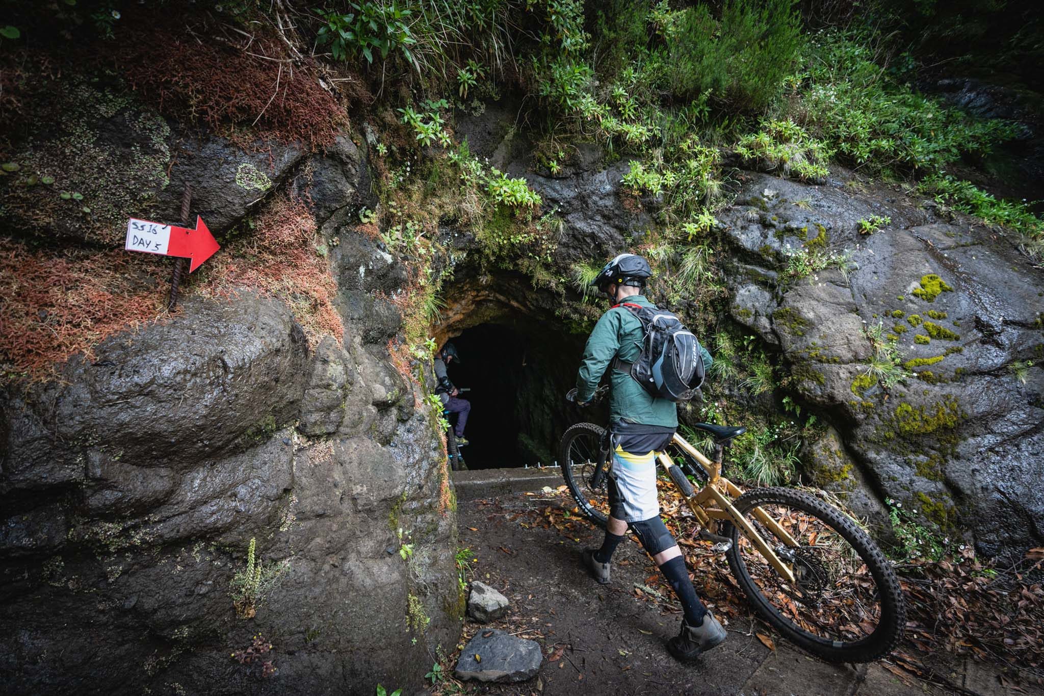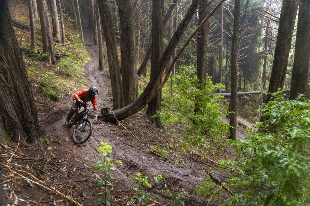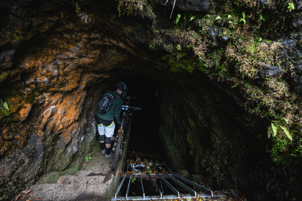 Parmi les riders, bien peu sont confiants avant d’affronter la tristement célèbre « glace noire » de Madère. Finalement, la pluie est si forte que nous ne l’affronterons pas vraiment aujourd’hui. La boue est tellement liquide que les pneus restent propres et c’est en fait assez fun à rouler ! La seule chose vraiment traître, c’est le « Serpent brun », autrement dit les racines !