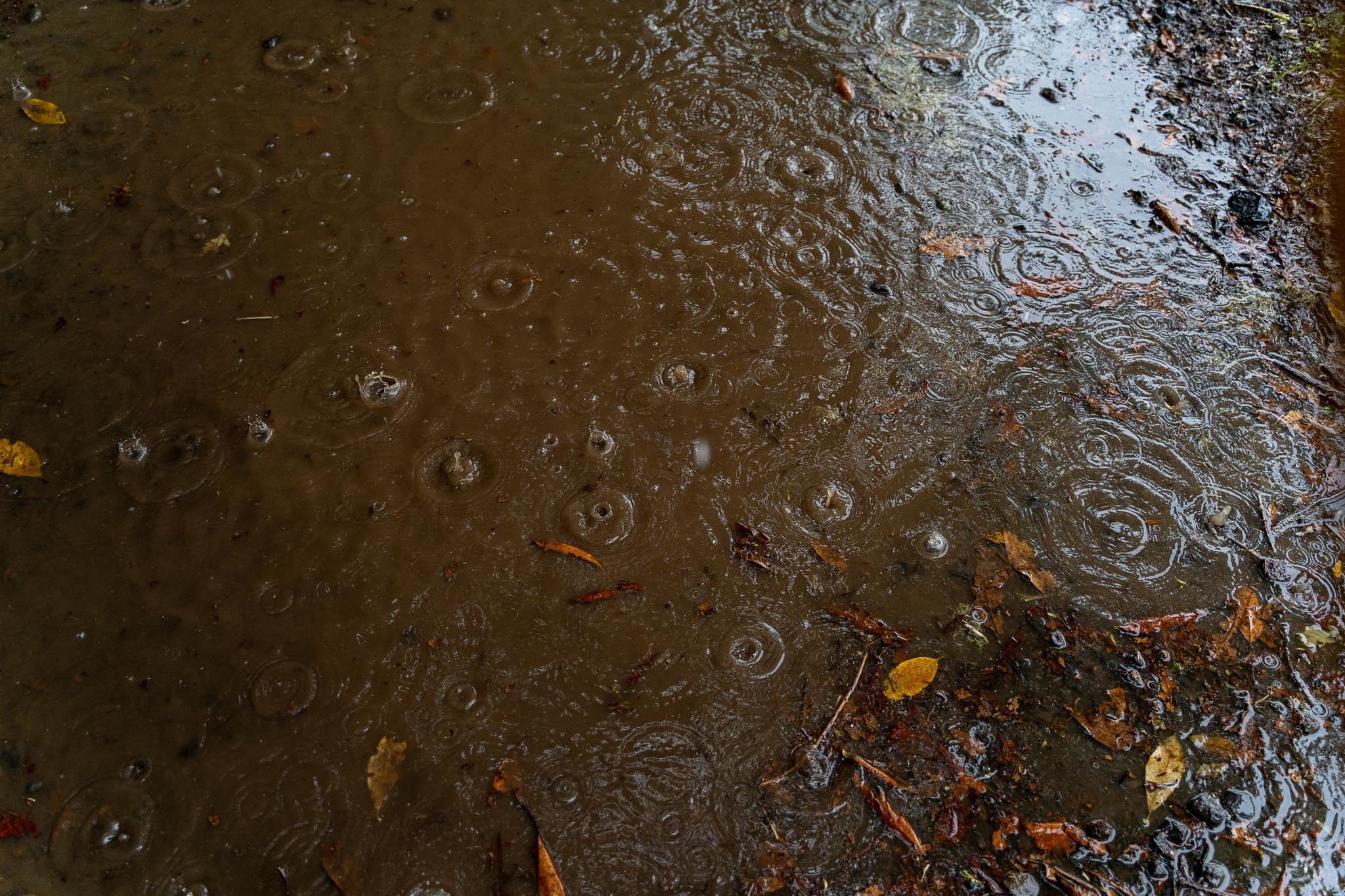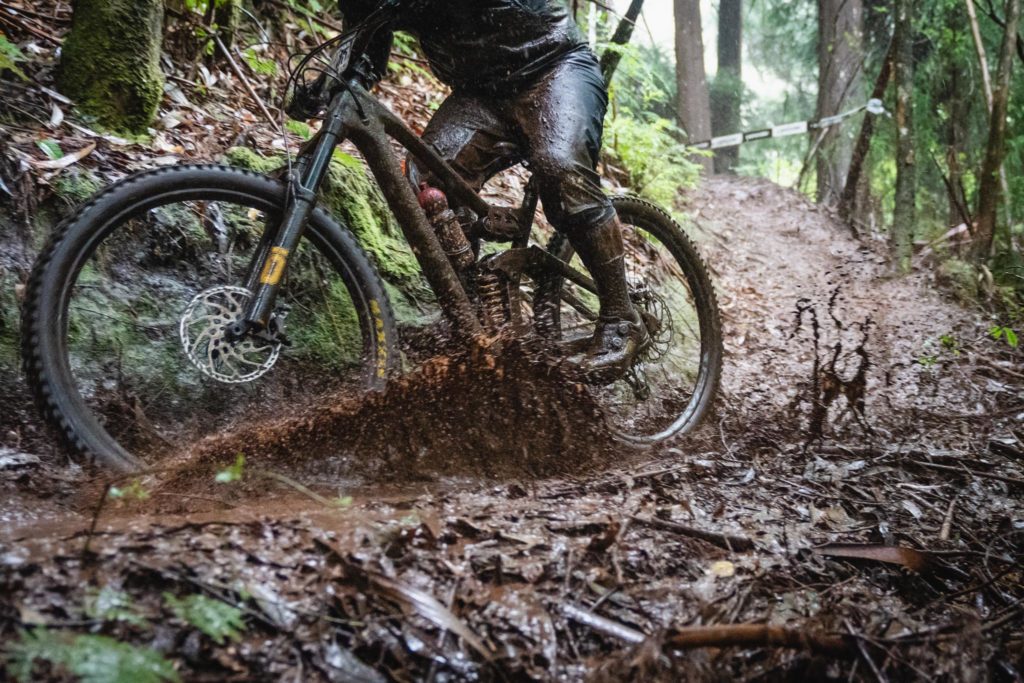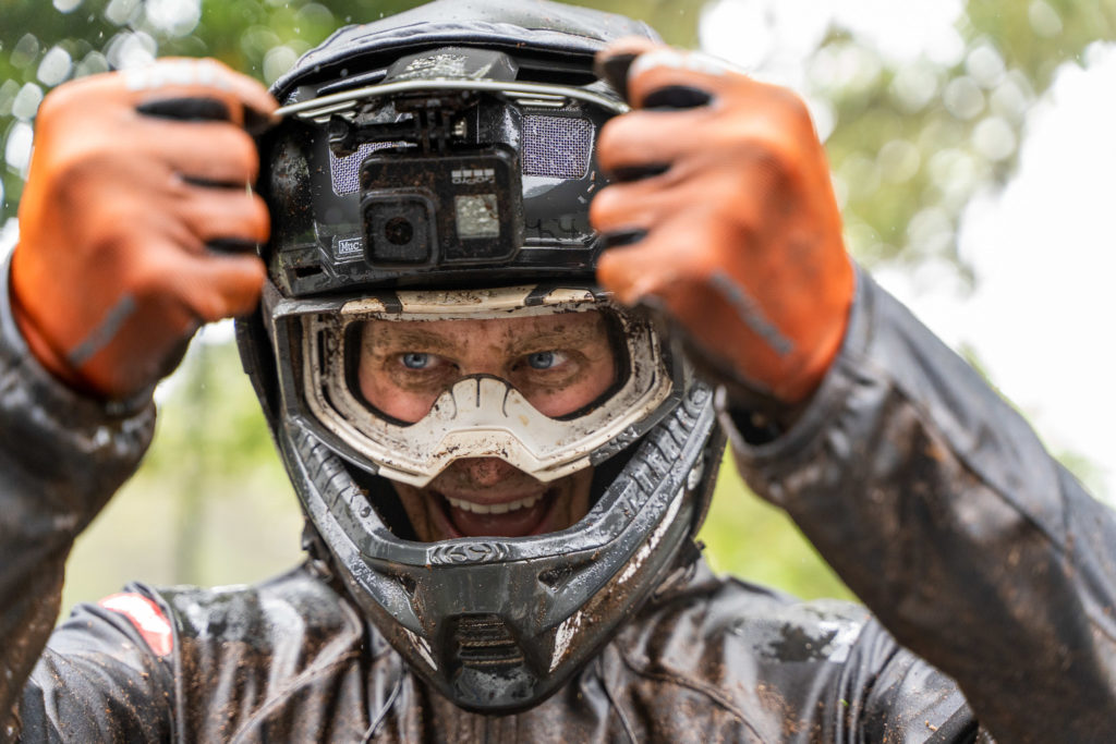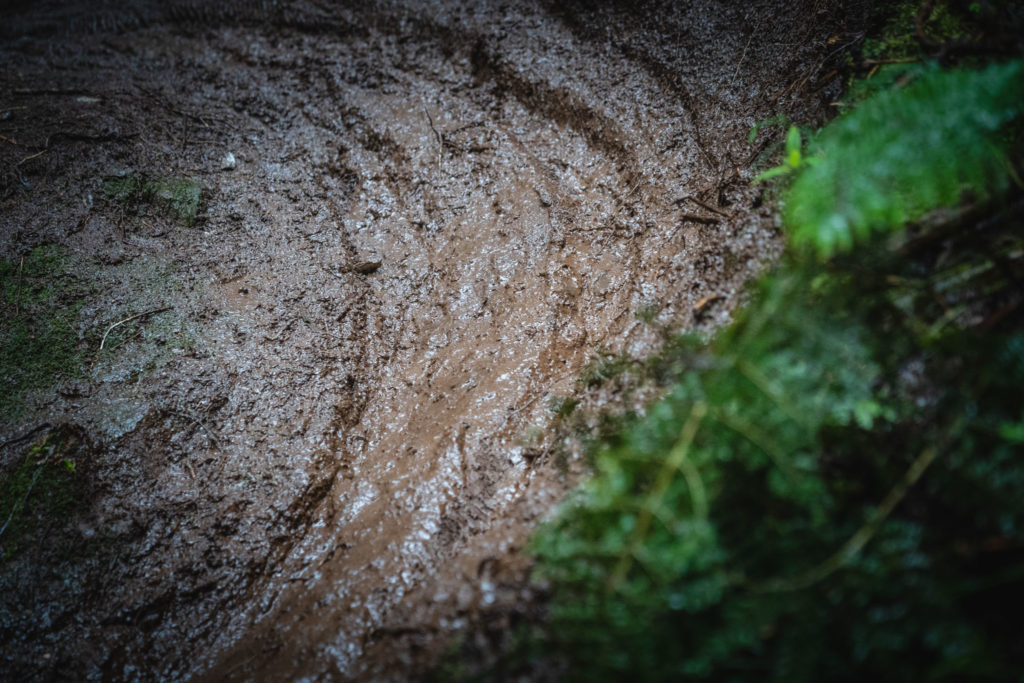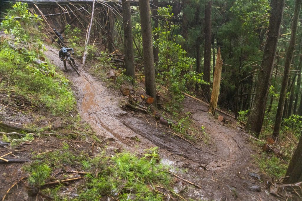 Habituellement, quand on descend plus bas, ça devient plus sec, mais malheureusement il pleut un peu aujourd’hui et les pistes restent glissantes, mais toujours amusantes. La pluie reste modérée mais ce n’est pas forcément mieux, la boue n’est pas très liquide et a tendance à rester coincée dans les pneus, ce qui engendre quelques glissades et figures de style pas toujours très contrôlées !