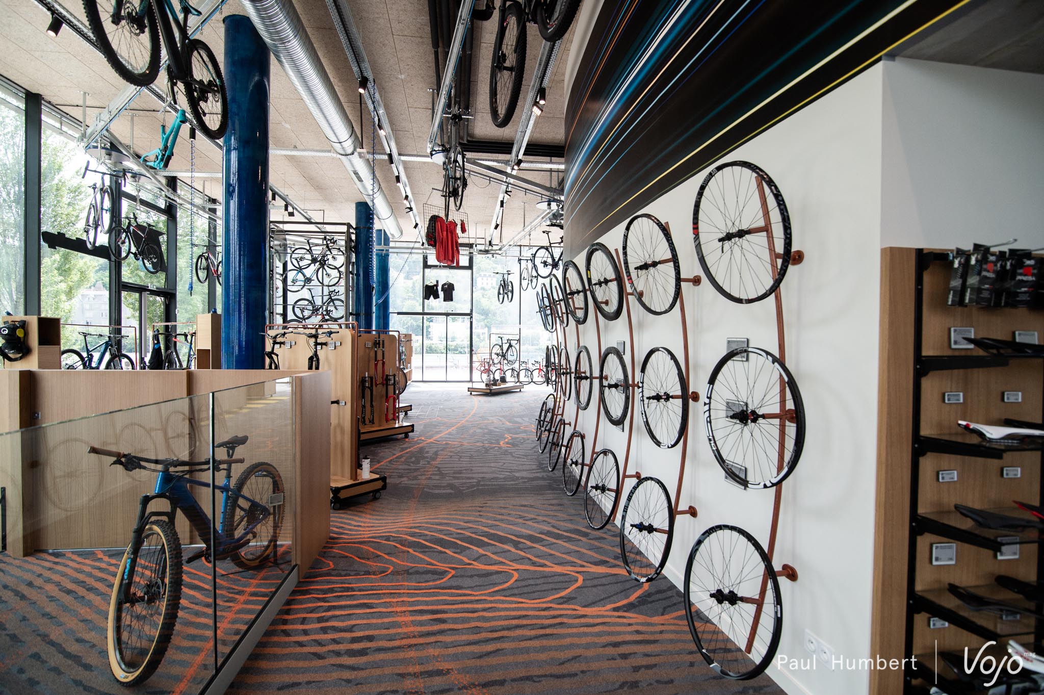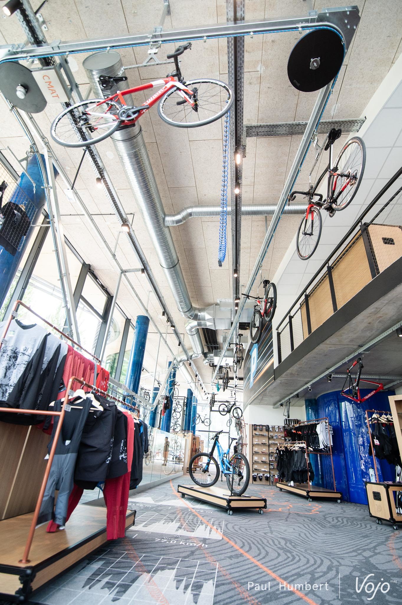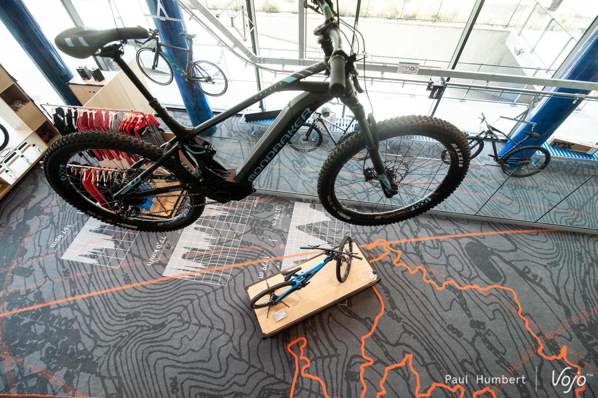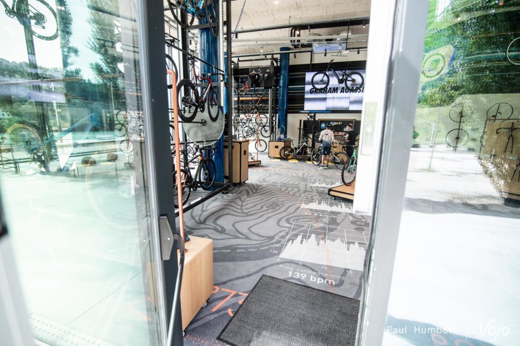 C’est à l’étage qu’on réalise le travail d’aménagement de la boutique, un rail mobile parcourant l’espace met les VTT en mouvement, et c’est assez unique !