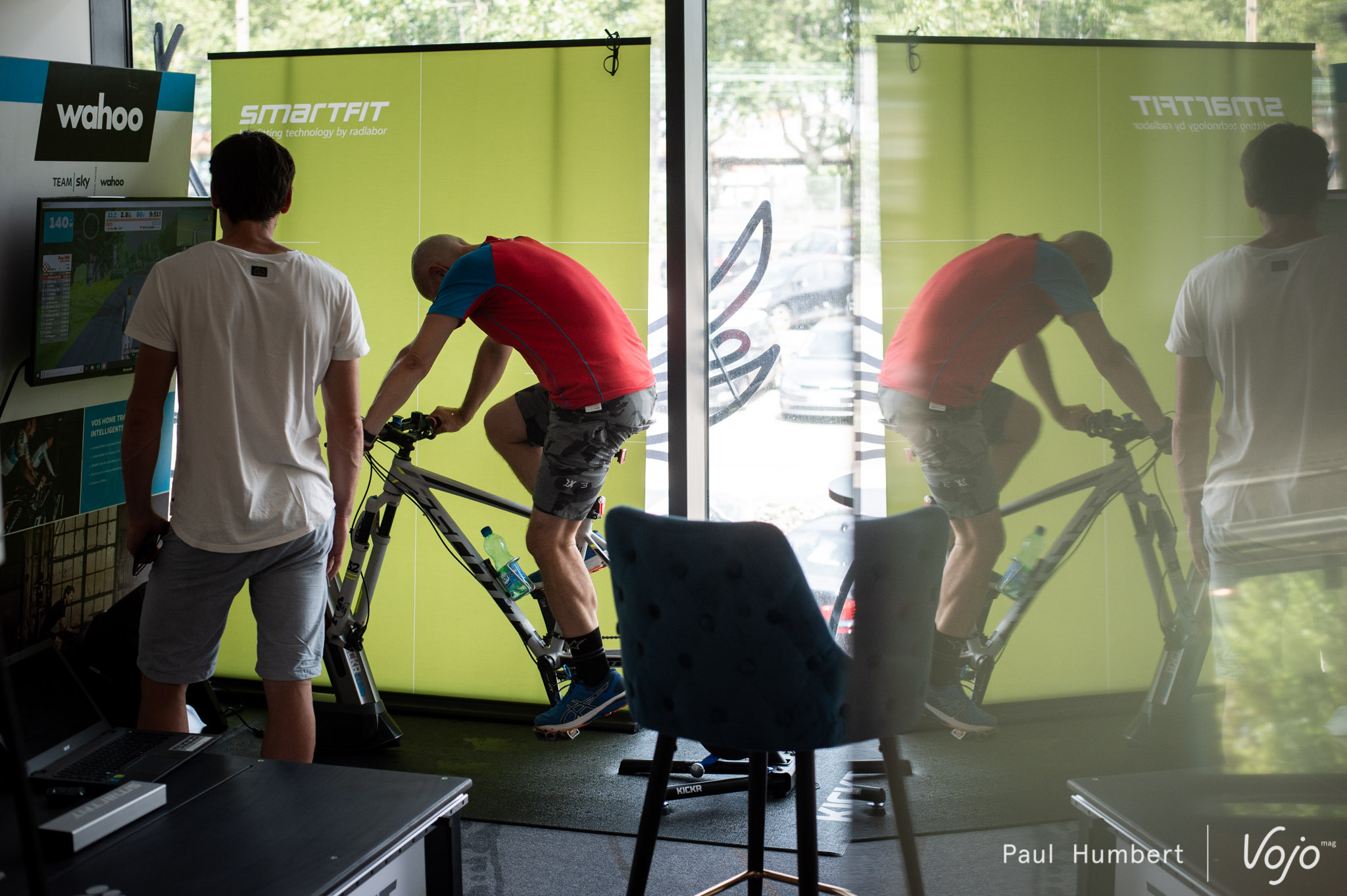 Lors de notre visite, un premier client pédalait en compagnie de Camille, son objectif : s’améliorer pour la Probikeshop SaintéLyon VTT.