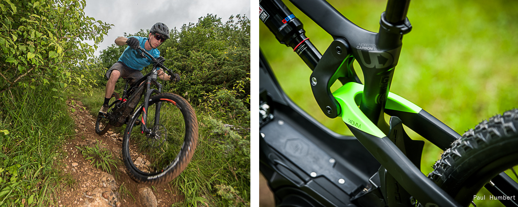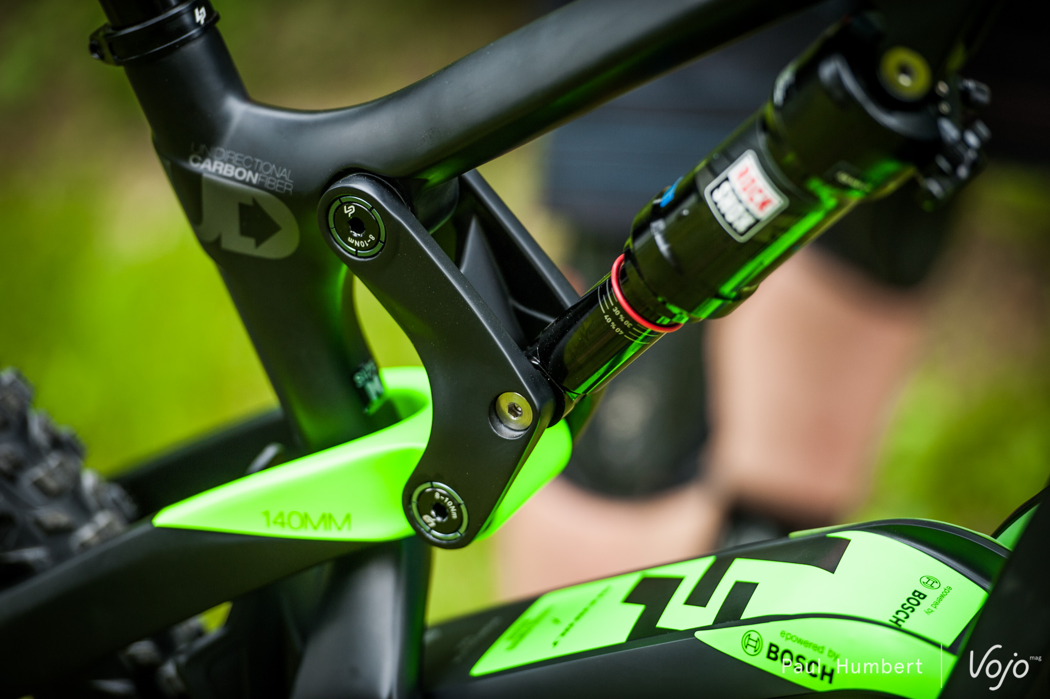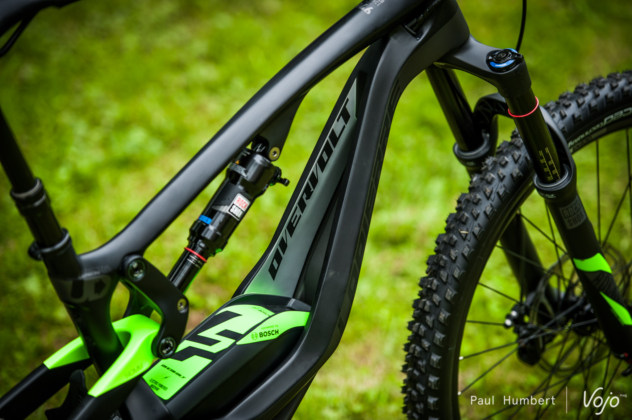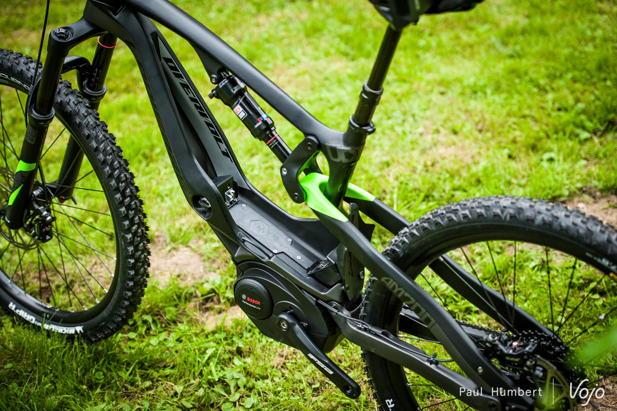 100% en carbone, le vélo développe 140mm de débattement et une fourche 150mm est installée à l’avant. Il a fallu repartir de zéro pour concevoir ce vélo bien différent des autres Overvolt. La principale nouveauté, outre le matériau utilisé, est la modification du placement de la batterie pour abaisser le centre de gravité au maximum et améliorer la gestion des masses.