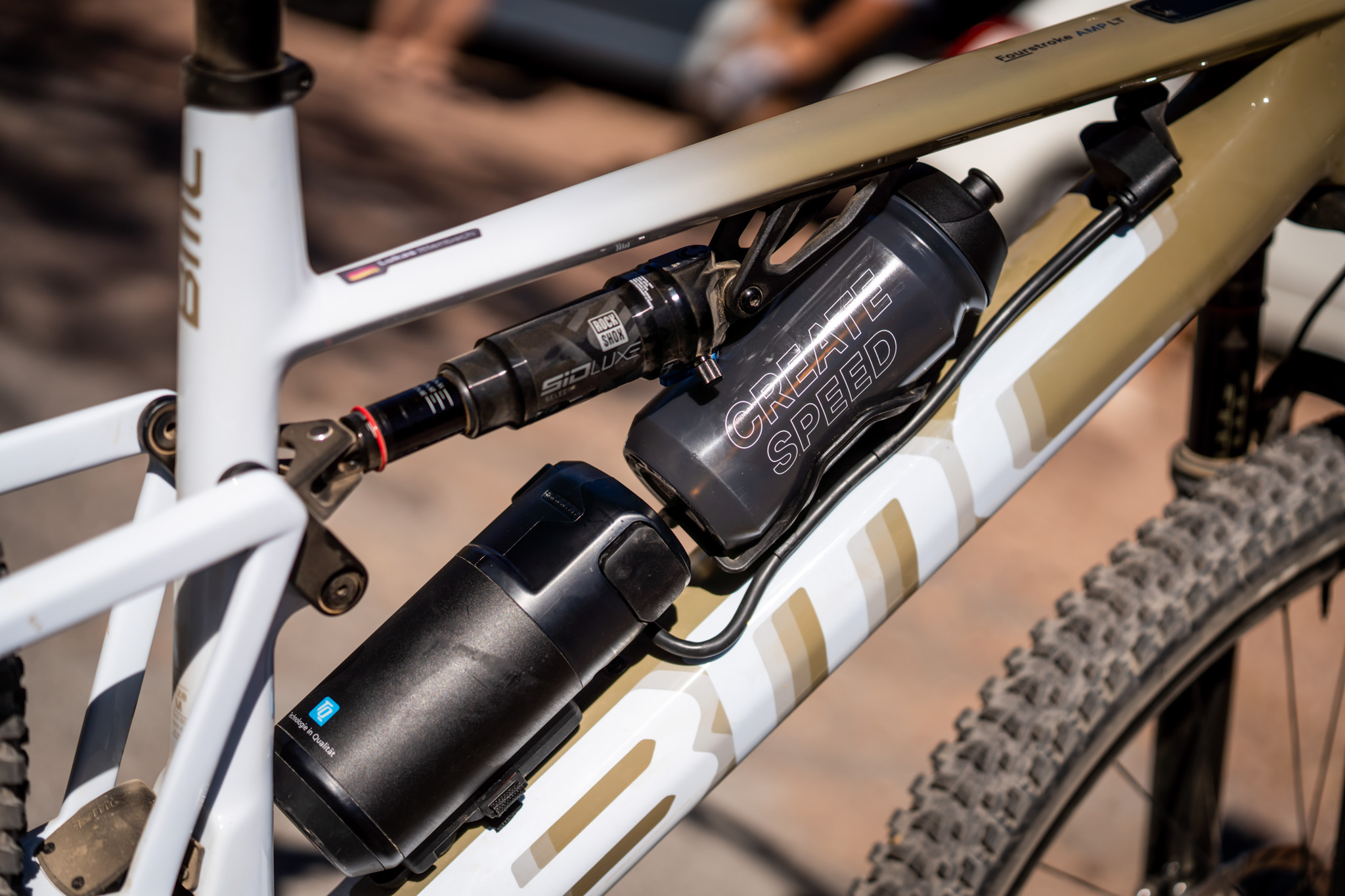 Le reste, ça se passe d’abord sur le tube supérieur avec un bel écran à l’affichage largement personnalisable, par les marques en premier lieu (à gauche l’écran version Trek, à droite celui de BMC) mais aussi par les utilisateurs. On navigue entre les différentes informations avec le bouton qui se situe au bas de l’écran, qui sert également à allumer et éteindre tout le système. Il propose également une connexion Bluetooth et ANT+, pour retrouver les informations sur son compteur.