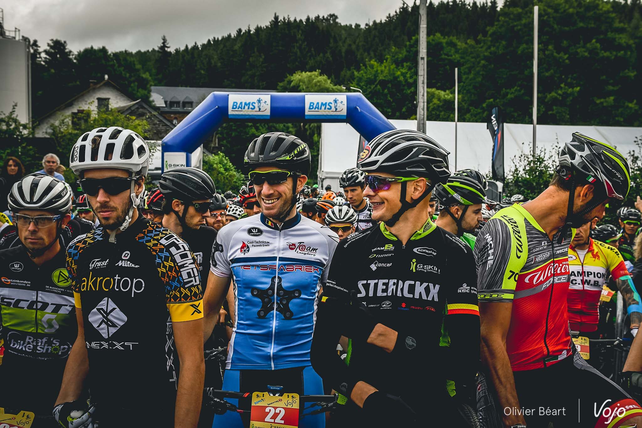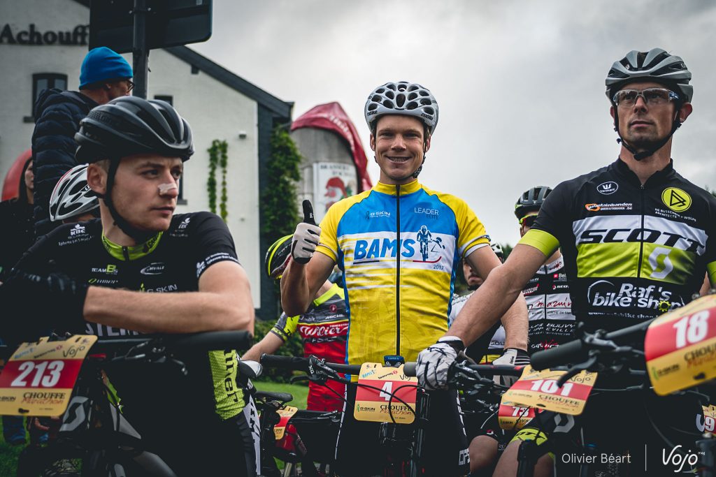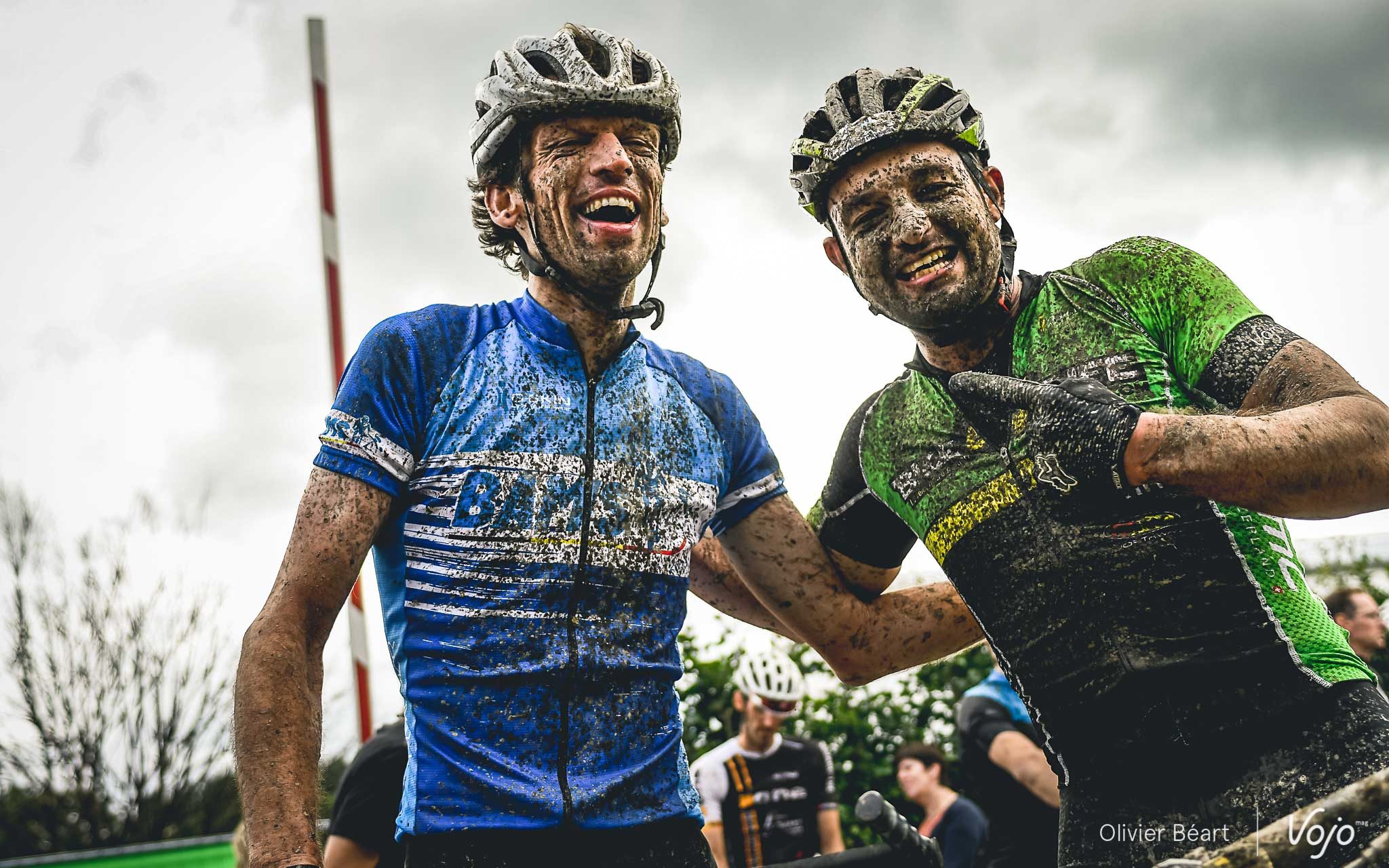 Les différents leaders du challenge BAMS (comme ici Ken van den Bulke en Master 2 et Cédric Himpe en Elite) arborent fièrement leur maillot distinctif, encore immaculé… mais cela ne vas pas durer car même s’il fait beau en ce dimanche de la fin du mois d’août, il a plus généreusement les jours précédents et le terrain promet d’être humide.