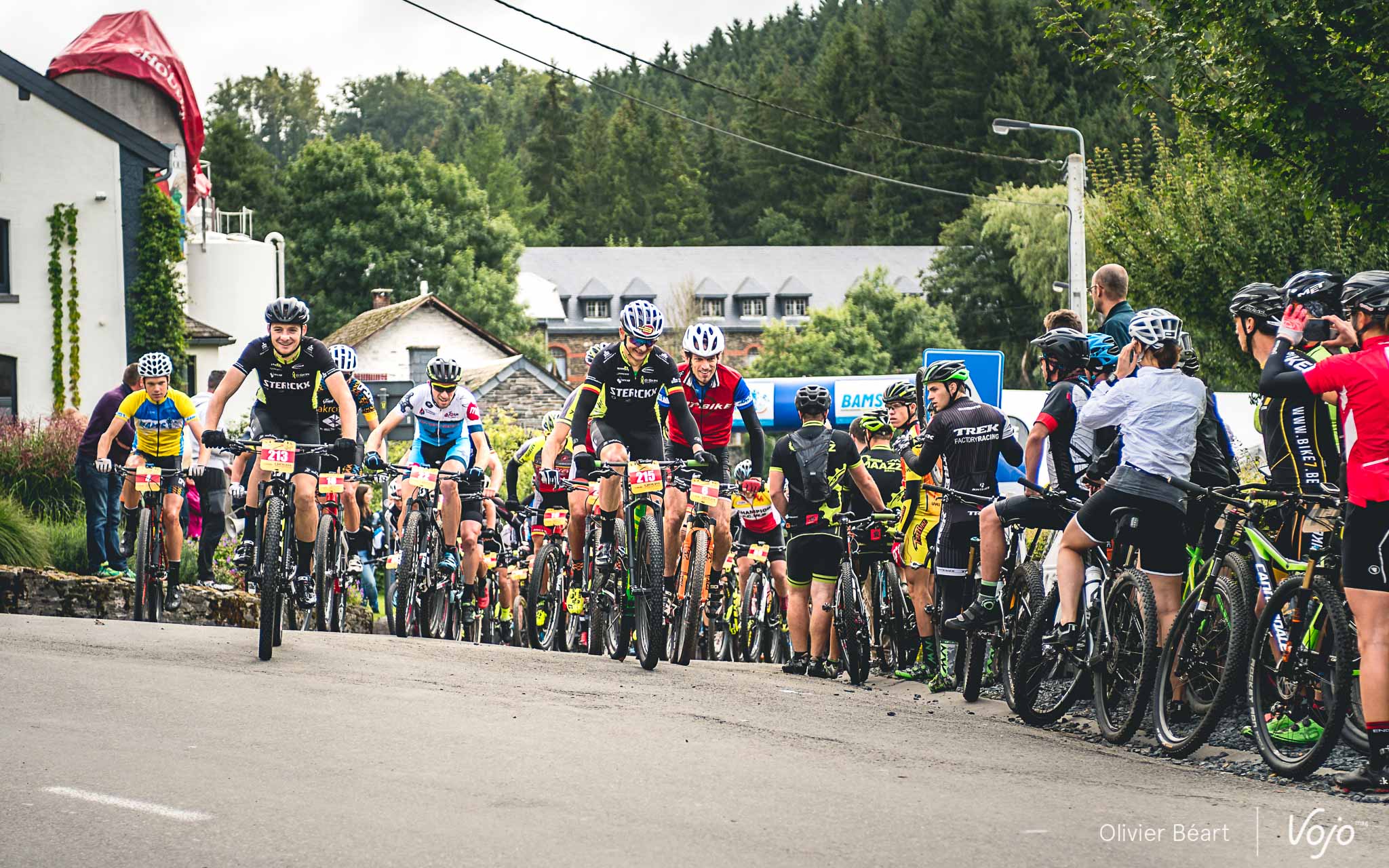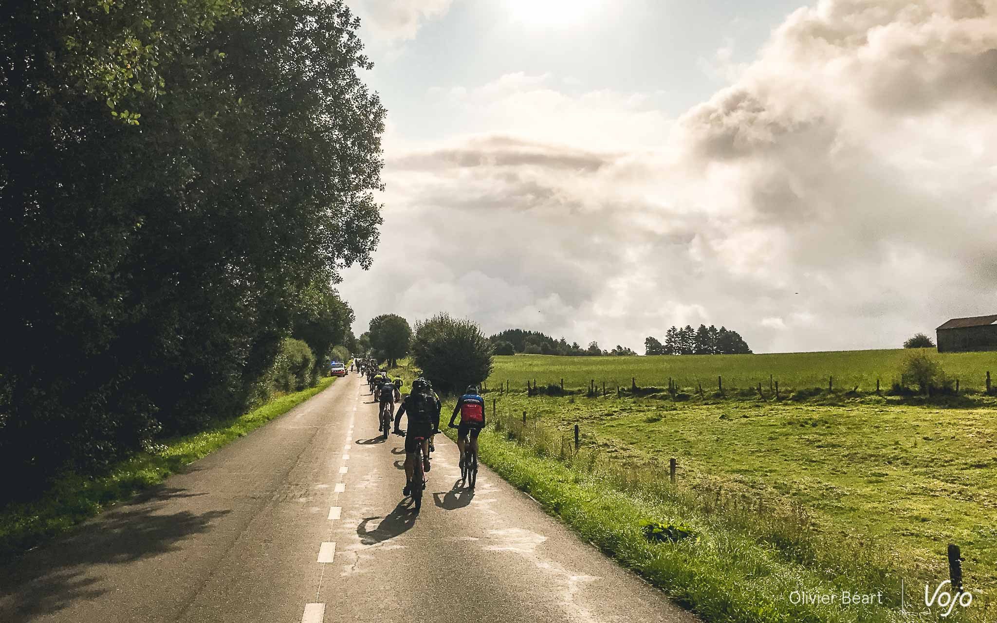 Sitôt sorti du village, le rythme de la tête de course s’accélère et une longue côte sur asphalte se charge d’étirer le peloton. D’emblée, on rentre dans le vif du sujet en prenant la direction d’Houffalize. Votre serviteur enfourche sa monture et s’infiltre dans le peloton des 65km pour suivre la course de l’intérieur.