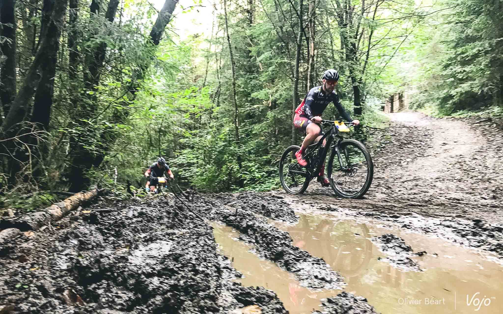 Entre les flaques de boue et les ascensions bien raides qui imposent parfois à certains de mettre pied à terre, on a de quoi faire et la fatigue se fait rapidement sentir.