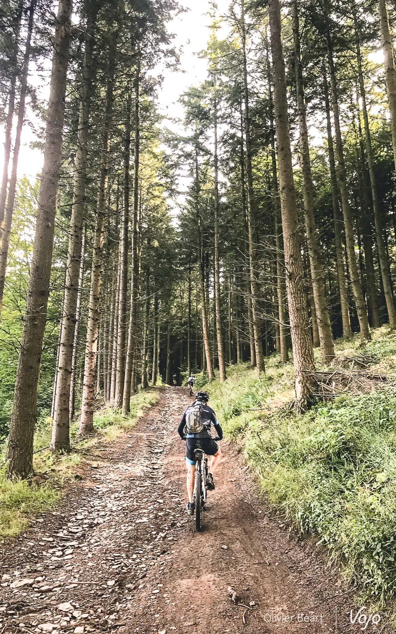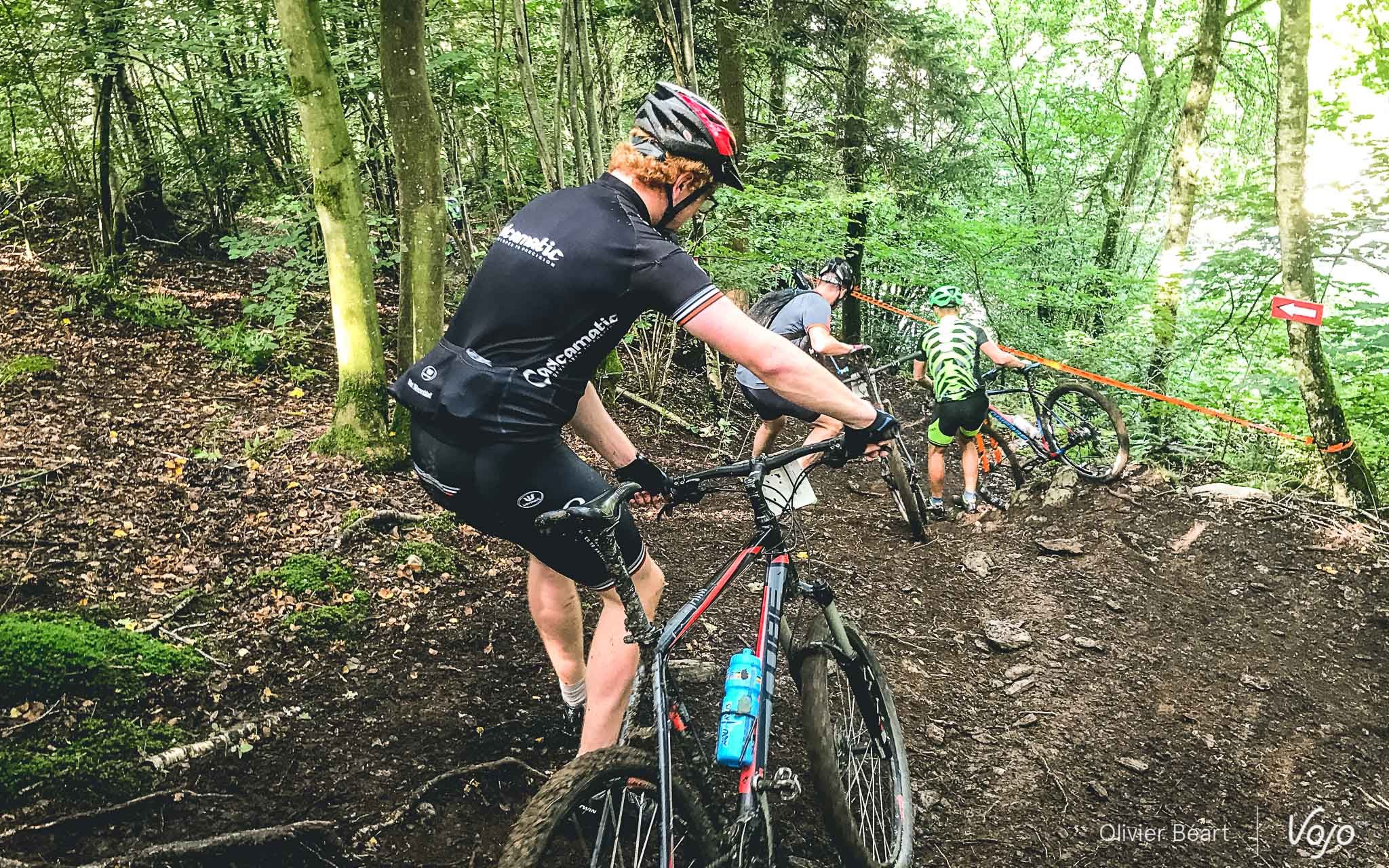 En queue de groupe pourtant, l’arrivée dans les singletracks de l’ancien parcours de la mythique coupe du Monde entraînent quelques bouchons. Bon, ça passe à vélo, mais on comprend que les roches glissantes et la pente généreuse puissent donner des sueurs froides à certains. Alors, on prend son mal en patience !