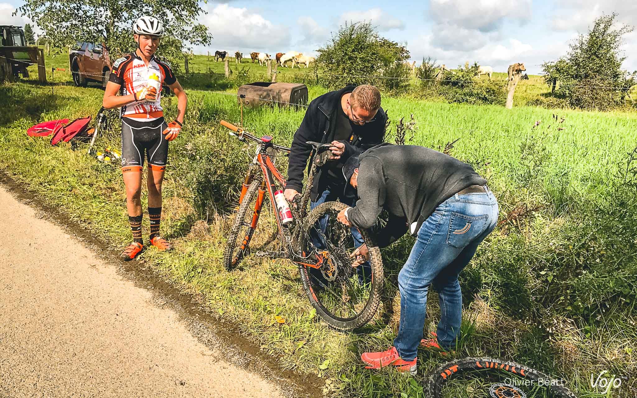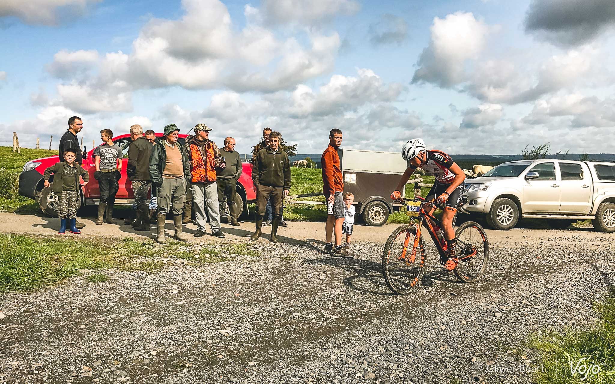 Jusque là, le parcours n’est pas très technique, mais il comporte tout de même pas mal de petits pièges dont va être victime Nicolas Rome, membre du club local que nous croisons au premier ravitaillement alors que son assistance s’affaire à changer sa roue. Après quelques minutes, il repart sous l’oeil amusé d’un groupe de chasseurs locaux… qui ne sont heureusement pas venus protester ni « tirer du vttiste » mais simplement profiter du spectacle.
