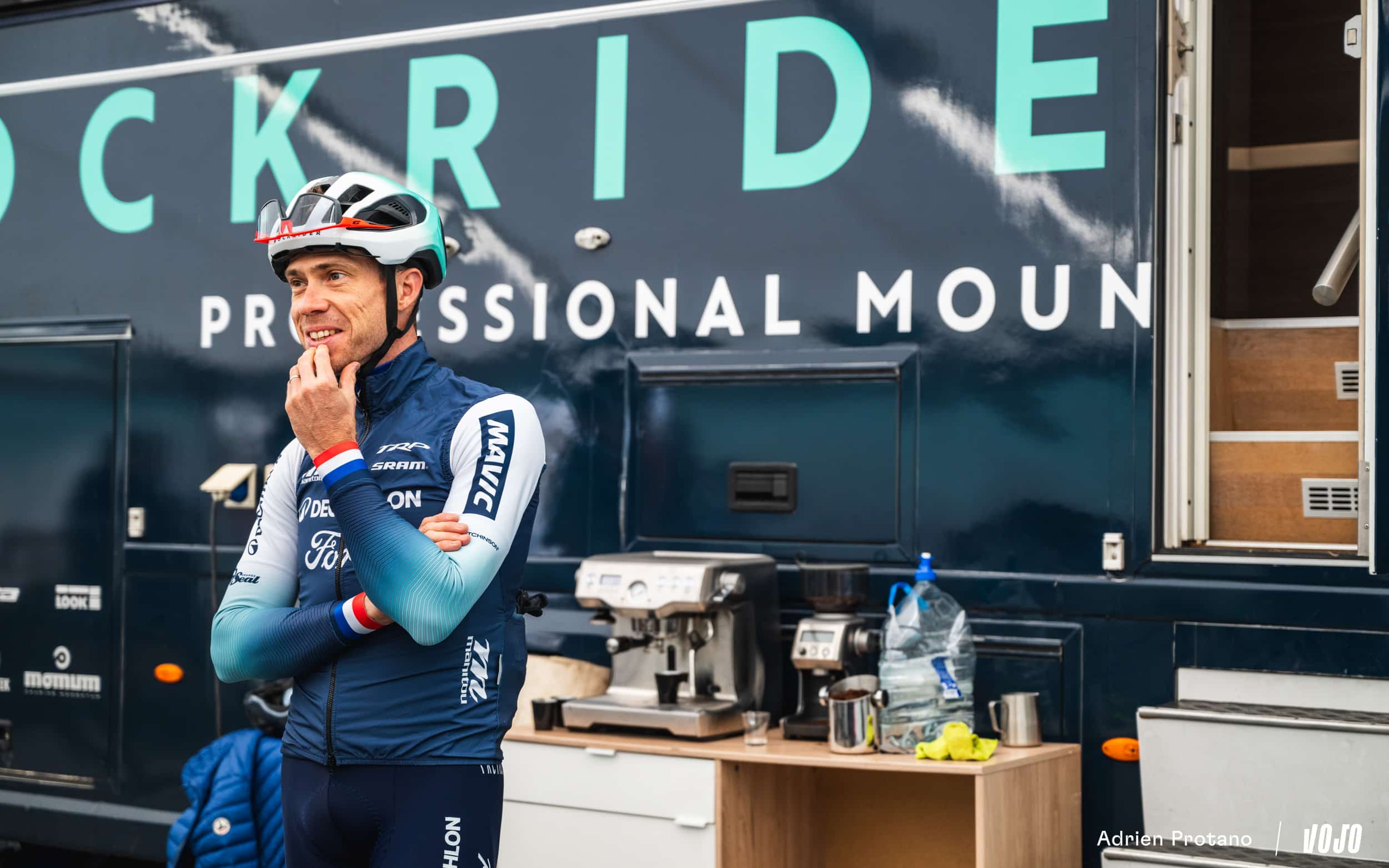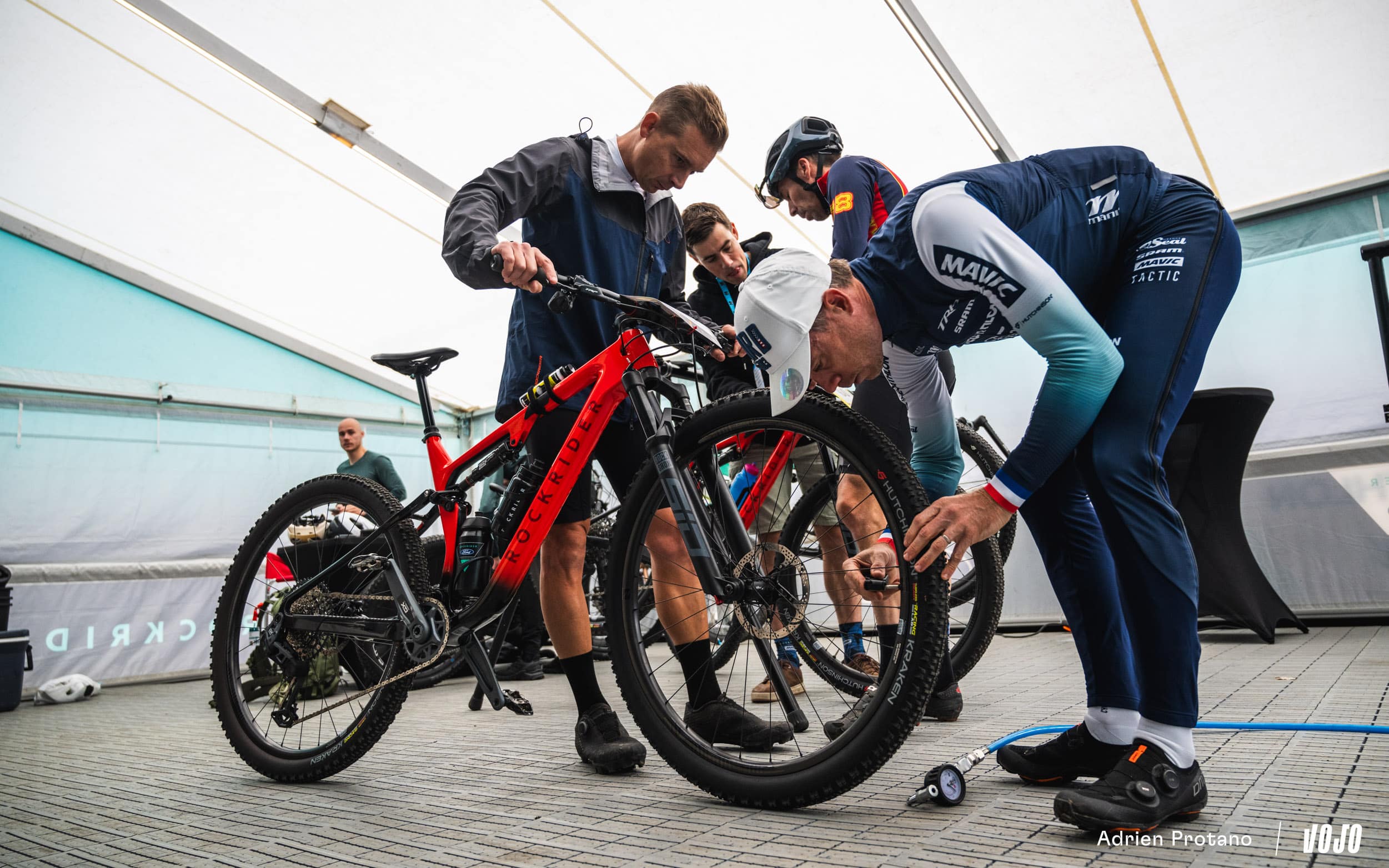 Pour que cette journée à bord du Race 940S soit idéale, Cyril et Ludo ont eu droit à un service VIP pour peaufiner les réglages de leur vélo du jour : Joseph de Poortere (ingénieur produit) et Théo Mougenel (mécanicien au sein du Decathlon Ford Racing Team) ont répondu présents en cette matinée. Cerise sur le gâteau, c’est Monsieur Maxime Marotte qui s’occupe des pressions en personne !