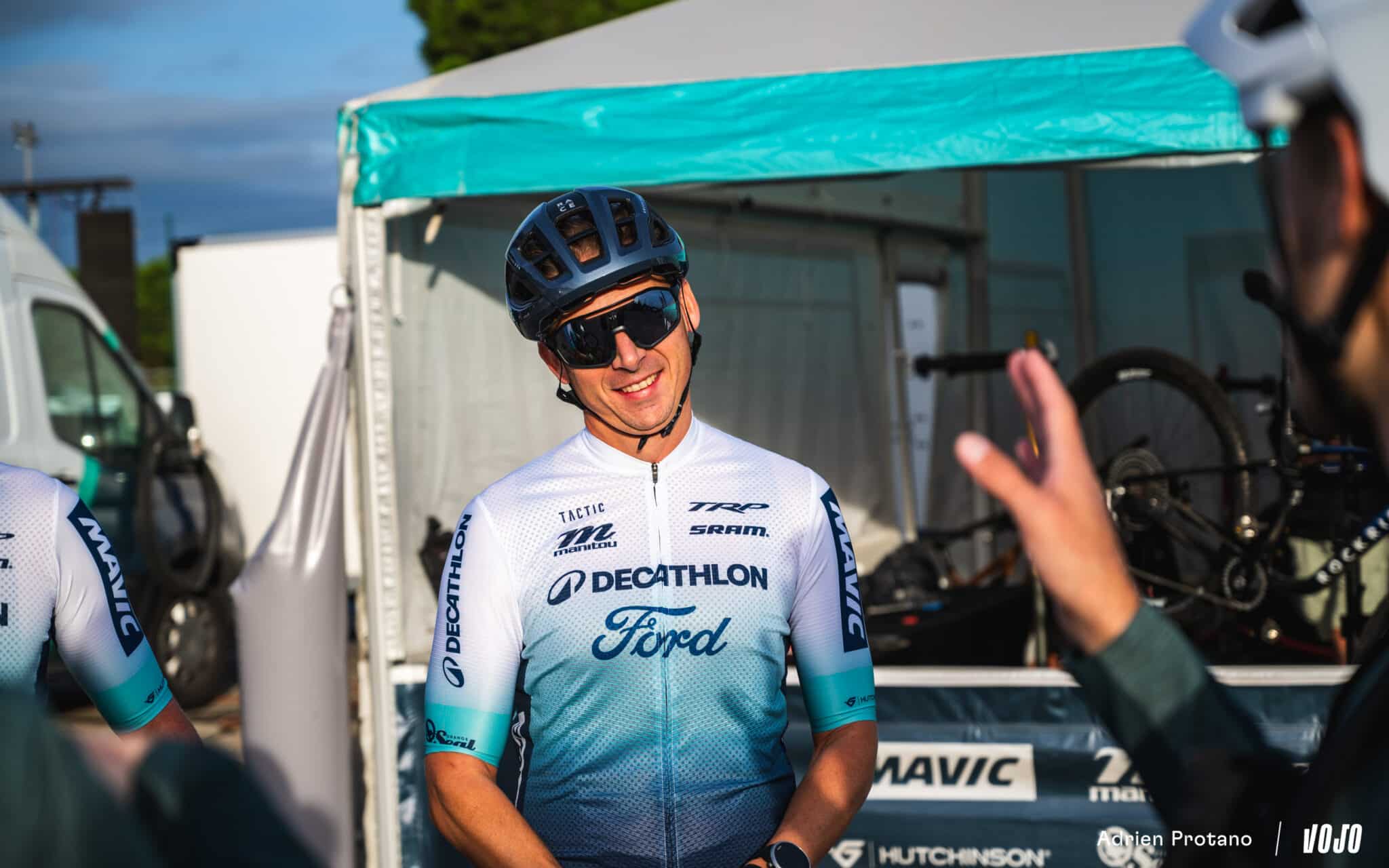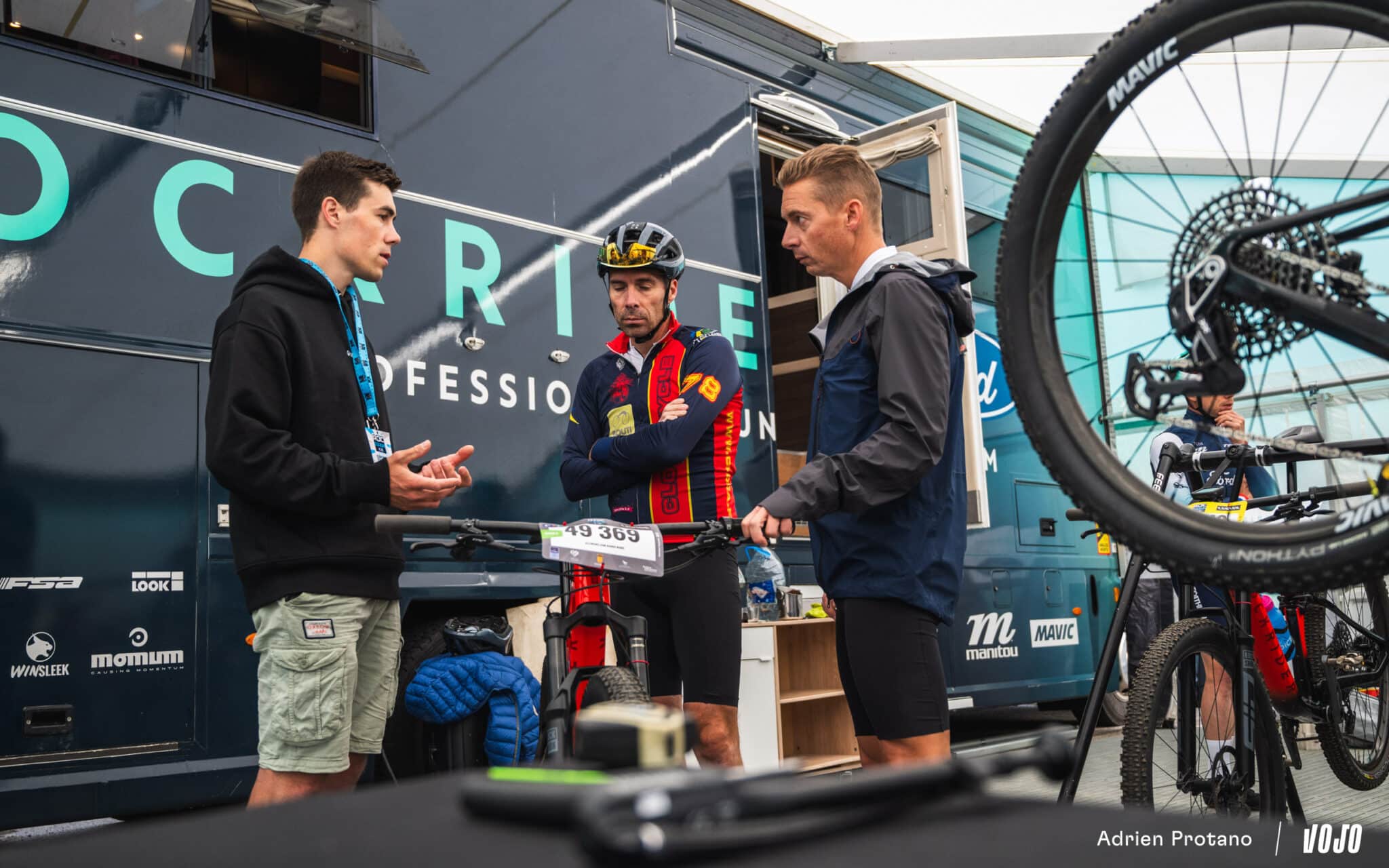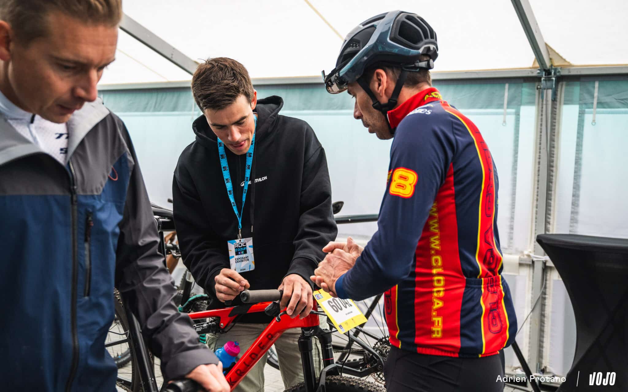 Pour que cette journée à bord du Race 940S soit idéale, Cyril et Ludo ont eu droit à un service VIP pour peaufiner les réglages de leur vélo du jour : Joseph de Poortere (ingénieur produit) et Théo Mougenel (mécanicien au sein du Decathlon Ford Racing Team) ont répondu présents en cette matinée. Cerise sur le gâteau, c’est Monsieur Maxime Marotte qui s’occupe des pressions en personne !