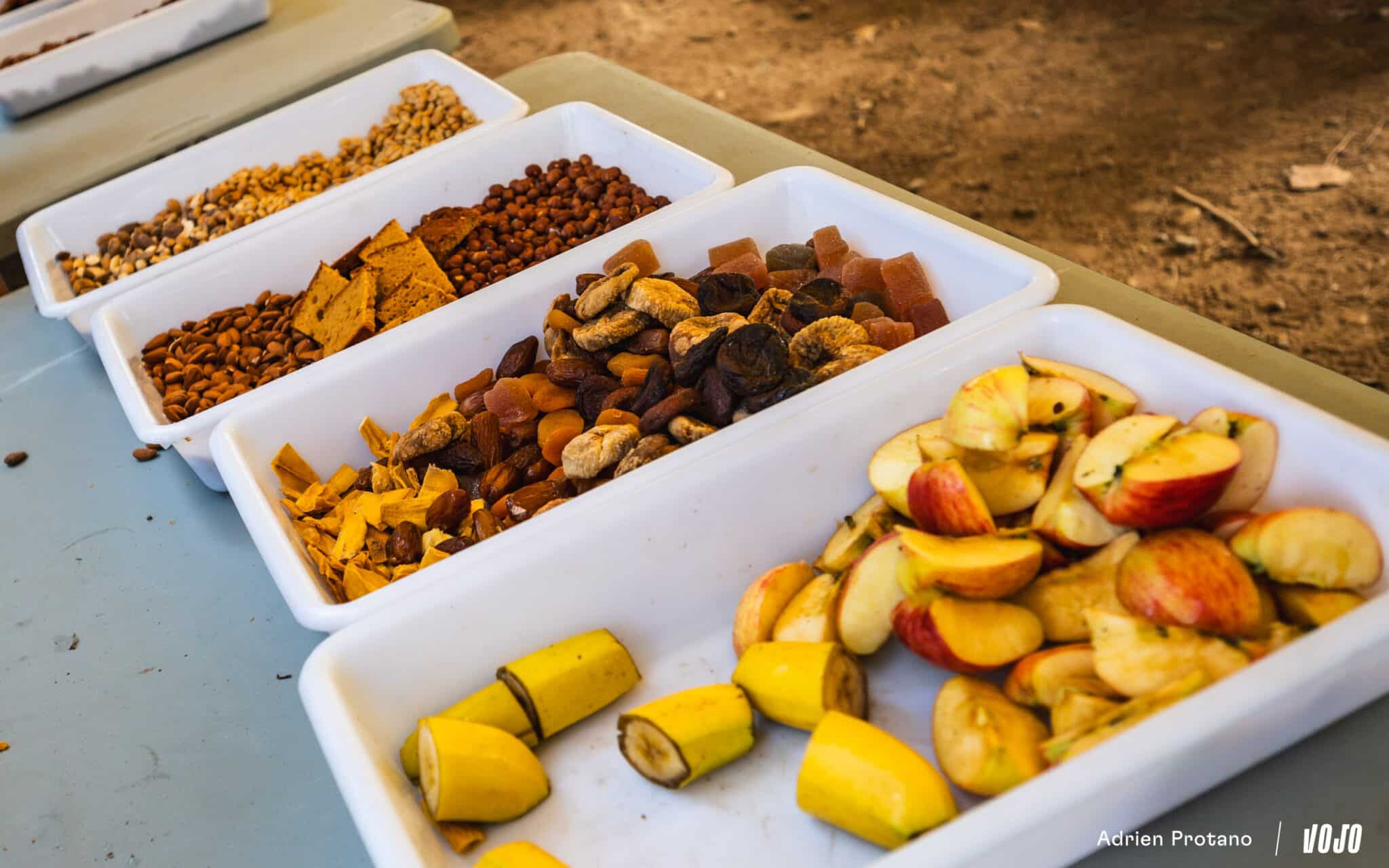 Nous voilà déjà arrivés au ravito du Car brûlé, à environ mi-parcours. Chacun se ravitaille en eau et en petites douceurs avant de repartir, et si la transpiration coule à grosses gouttes, tout le monde a la banane (sans mauvais jeu de mots) !