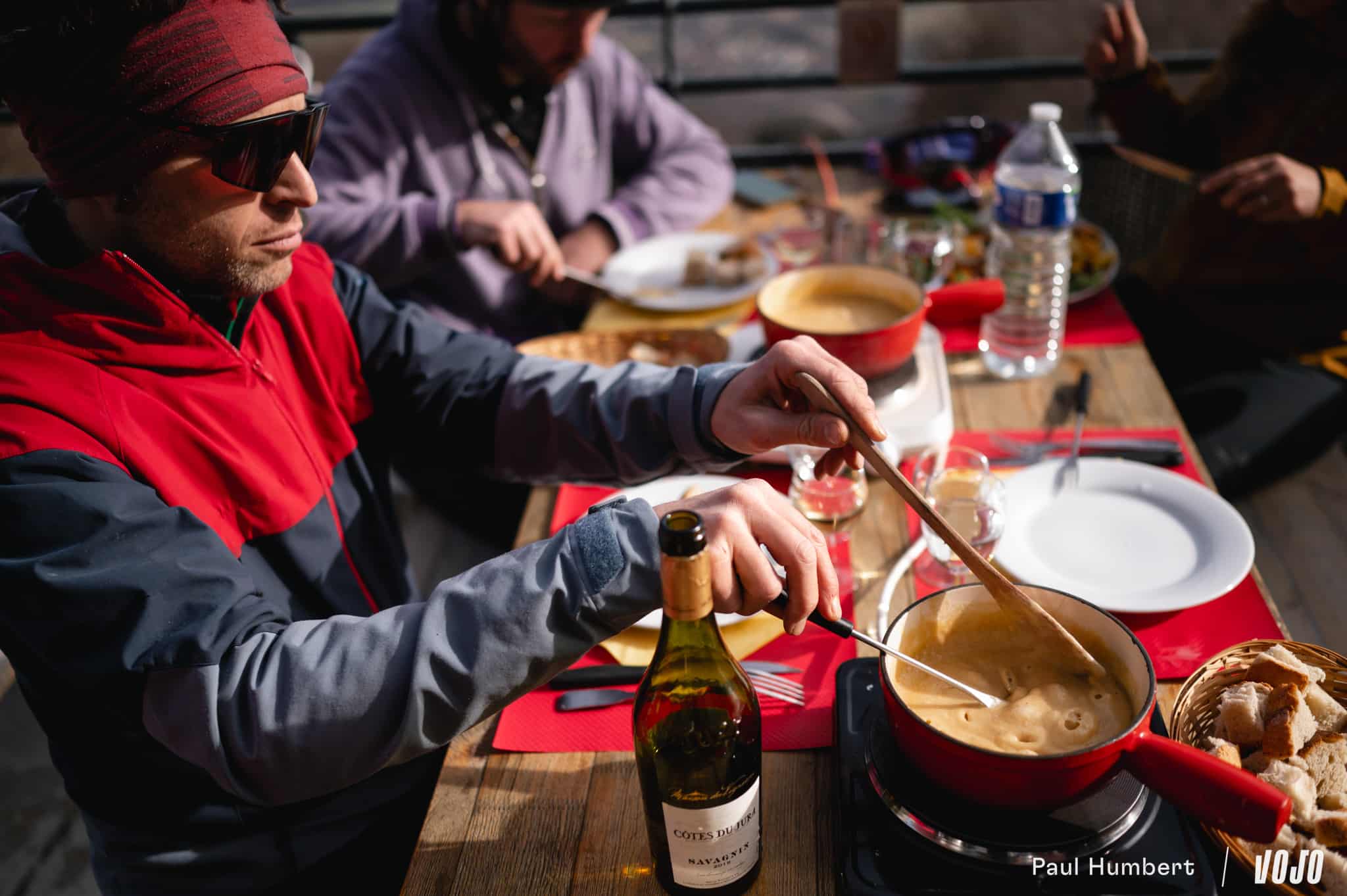 Avant d’entamer un petit repas léger, version ghetto, nos regards croisent ceux des quelques skieurs qui glissent péniblement sur une langue de neige qui fond à vue d’oeil. Les deux camps sont amusés de la présence de l’autre et on se retrouve tous autour d’une fondue avec une vue imprenable sur les alpes, le massif du mont Blanc et le lac Léman.