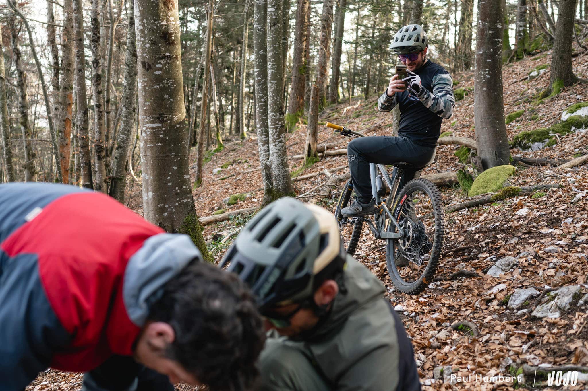 Pour découvrir les pistes de Crozet, on est en présence de Jonathan, également appelé « Monsieur le président du Ghetto », de François Bailly-Maître et de son associé au magasin Anthony. La pilote d’enduro Morgane Charre rejoint la troupe pour un combiné découverte/entraînement en vue de la saison 2024 qui approche.