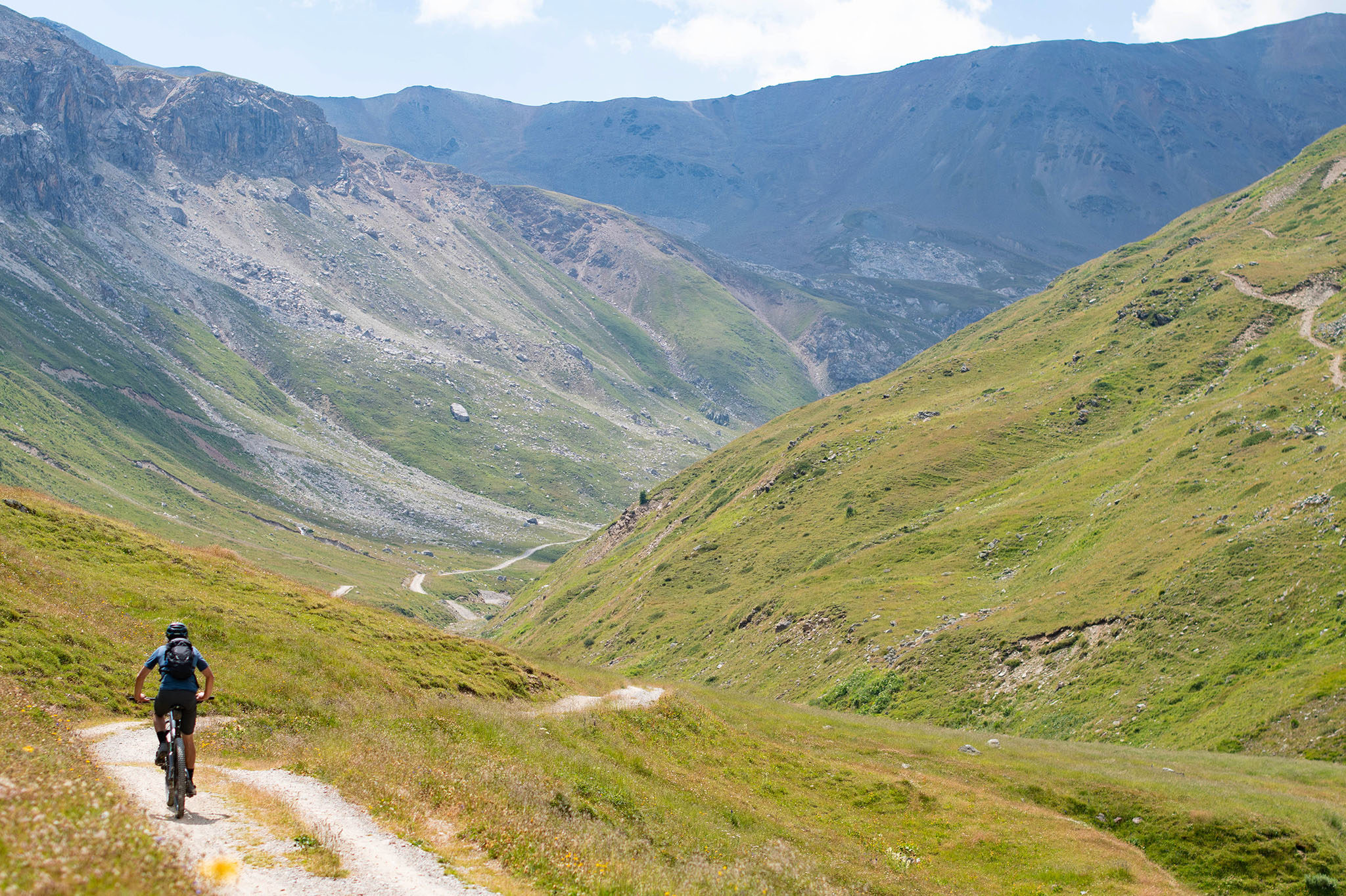 Aux abords, les vaches paissent en liberté au beau milieu des vélos disséminés dans l’alpage. Le chemin se mue enfin en un joli single trail, sans difficulté technique majeure mais particulièrement plaisant. Là, rouler sur un VTT prend tout son sens. Si Vincent retrouve ses réflexes d’enduriste et cherche les parties les plus chaotiques, de mon côté, je me contente d’emprunter la trace la plus rapide et la plus aisée. A tel point que le col de Costainas, situé à 2251 m, est traversé sans que l’on s’en aperçoive.