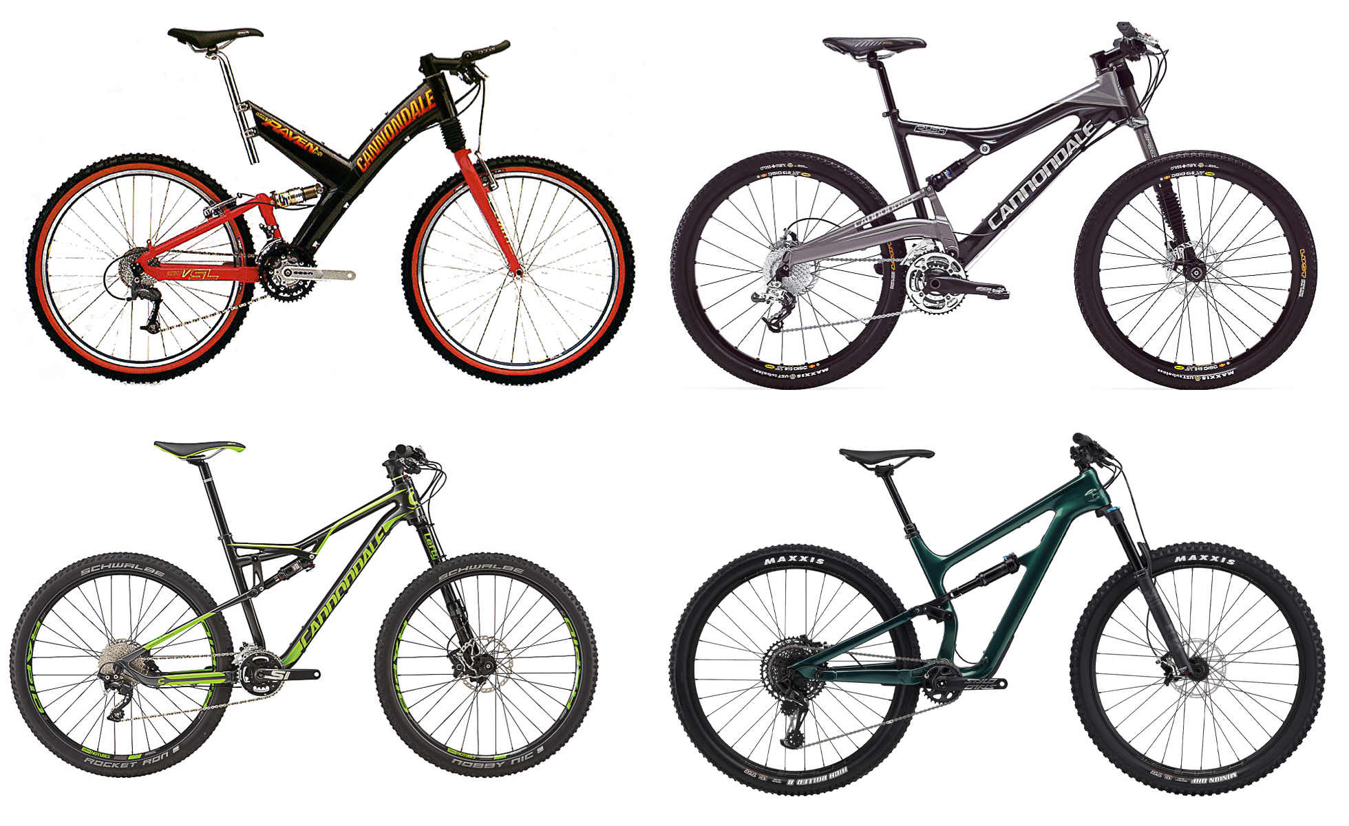 Quelle est la situation deux échelons au-dessus, pour 3500 € ? En 1997 cette somme donnait déjà accès à de très bon tout-suspendus. La plupart étaient en aluminium mais on pouvait déjà trouver quelques modèles avec un triangle avant en carbone (l’arrière restant en alu), à l’image des désormais célèbres Trek Y et Cannondale Raven. Pour ce dernier, la première version (Raven 2000 SL) était affichée à 23 900 FF (3650 € à l’époque) en France et 139 000 FB (3445 €) en Belgique. Avec l’inflation, 3500 € de 1997 représentaient un peu moins de 4600 € en 2017 et valent désormais plus de 5000 € aujourd’hui. Voyons l’évolution du modèle et de ses remplaçants :