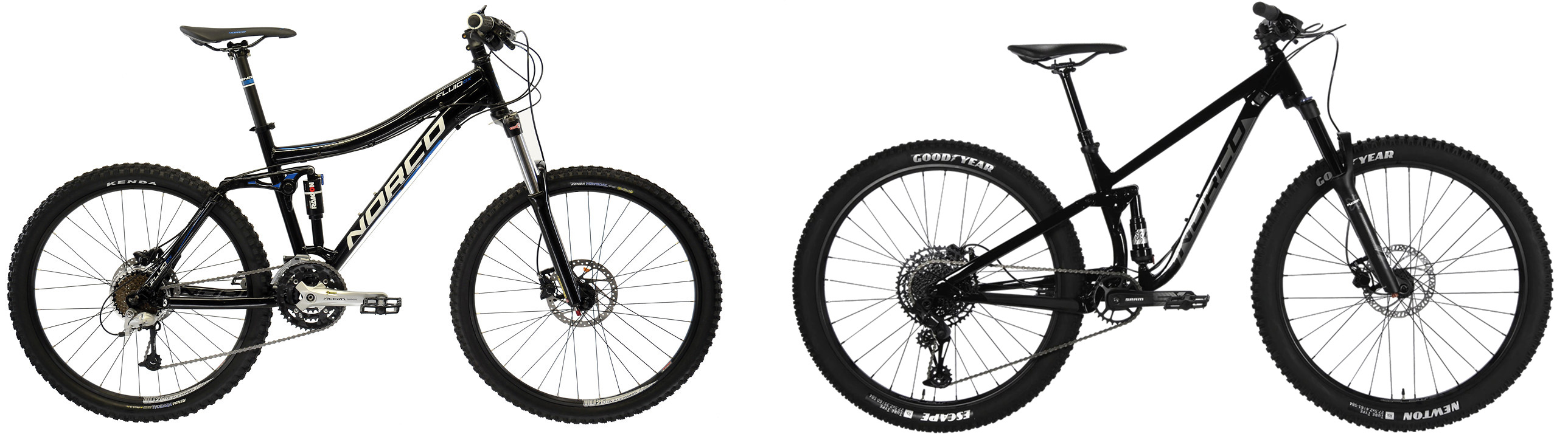 En tout-suspendu, le moins cher qu’on ait pu trouver aujourd’hui est le Norco Fluid FS 3 (27,5″ ou 19″ suivant la taille, 120/130 mmm de débattement), doté de suspensions X-Fusion et d’une transmission Sram SX Eagle pour 1899 €. En 2012 ce modèle précis n’existait pas encore mais le Fluid DX (26″, 140/140 mm) était plus ou moins son équivalent avec ses suspensions SR Suntour Raidon et sa transmission Shimano Acera/Deore. Il se vendait alors pour un peu moins de 1400 €, soit aux alentours de 1650 € aujourd’hui en prix constant. De 1650 € à 1899 €, cela représente une augmentation de 15 % hors inflation. De manière générale, tout ce segment du premier prix tout-suspendu « roulable » (avec de vrais composants de VTT) a augmenté de 300 à 500 € en valeur réelle dans cette période : la plupart des modèles se situent désormais autour des 2000 € alors que c’était plus proche des 1500 € il y a 10-11 ans. Mais il y a aussi eu de belles avancées technologiques à ce niveau, réellement profitables au plaisir de rouler (plus que sur les semi-rigides).