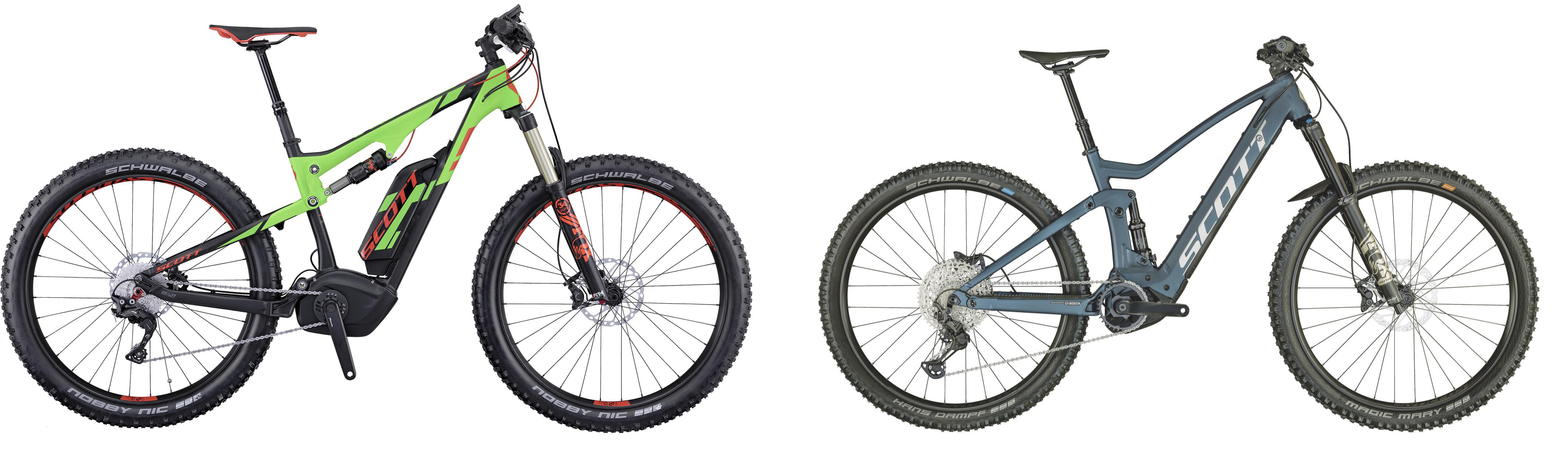 Pour rendre compte de leur évolution, nous avons retenu deux modèles : le Specialized Turbo Levo, l’une des références du marché qui a en plus le bon goût d’avoir une vie rythmée par des « générations » ce qui rend la comparaison encore plus intéressante et le Scott Genius eRide, l’un des tous premiers e-bikes sérieux testés par la rédaction (c’était en 2015 : Test – Scott E-Genius 710 Plus : l’électrique éclectique).
