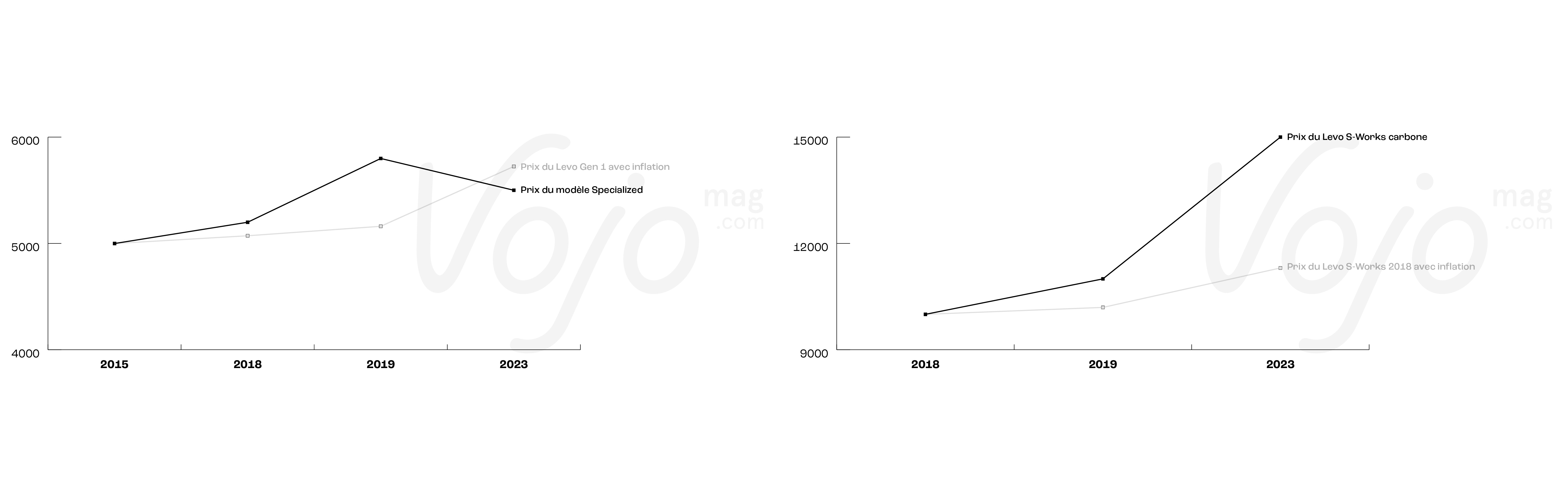Sur le graphique de gauche, le premier prix dans la famille Turbo Levo (modèle Comp puis Alloy). Sur celui de droite, la version S-Works depuis son passage au carbone en 2018. On constate que bien que le tarif du modèle d’accès ait augmenté dans l’absolu (de 4999 € à 5500 €), son impact sur le pouvoir d’achat est aujourd’hui moindre qu’il y a huit ans. Une bonne chose ? Oui mais dans les faits ce graphique cache d’autre choses : dans l’intervalle, ce modèle a baissé d’un cran en équipement, passant d’une RockShox Revelation / Sram GX a une RockShox 35 Silver / Sram NX et SX Eagle mais la capacité de la batterie à bondi, passant de 460 Wh en 2015 à 700 Wh aujourd’hui. L’accès à la plateforme Specialized Turbo Levo est donc un peu plus facile que par le passé et si cela se fait au prix de composants de moindre qualité, on profite en revanche d’une batterie bien plus robuste.