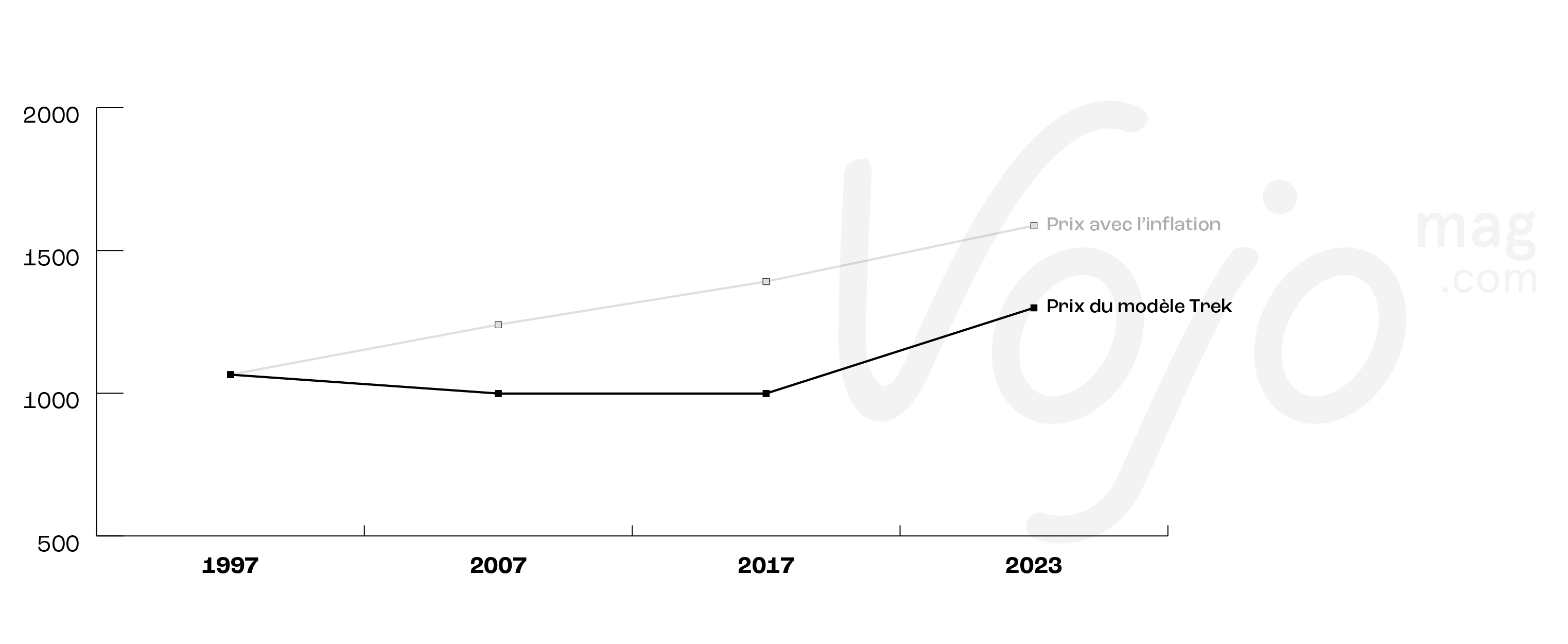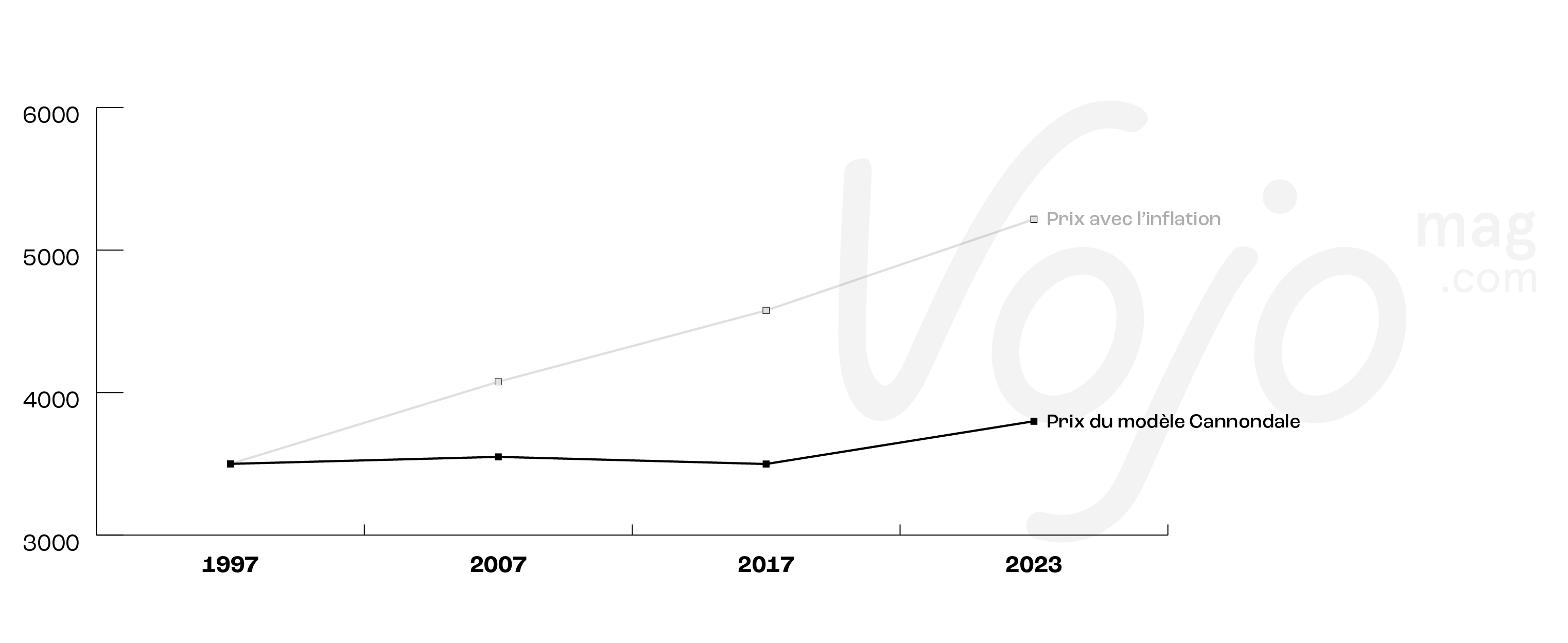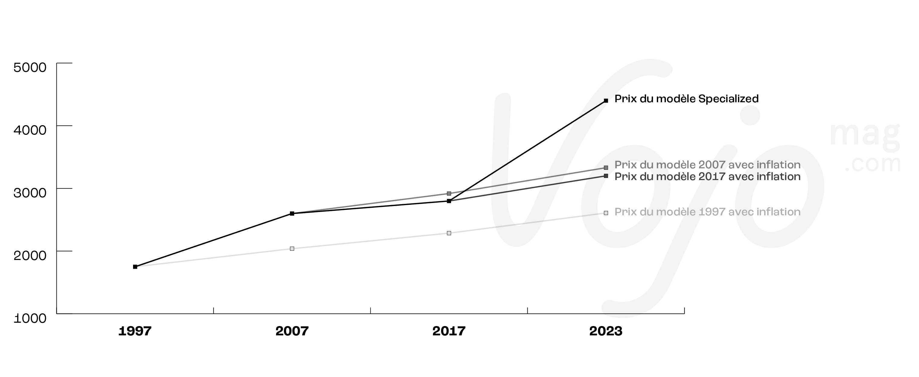 Par rapport à 1997, en 2007, on pouvait toujours s’offrir le même vélo et même mieux, puisqu’il bénéficiait de freins à disque. Même chose en 2017, même si le modèle a changé de nom et que la transmission est peut-être un peu en retrait. En 2023 en revanche, la hausse est manifeste même s’il faut noter que l’équipement s’est amélioré par rapport à 2017 (transmission).