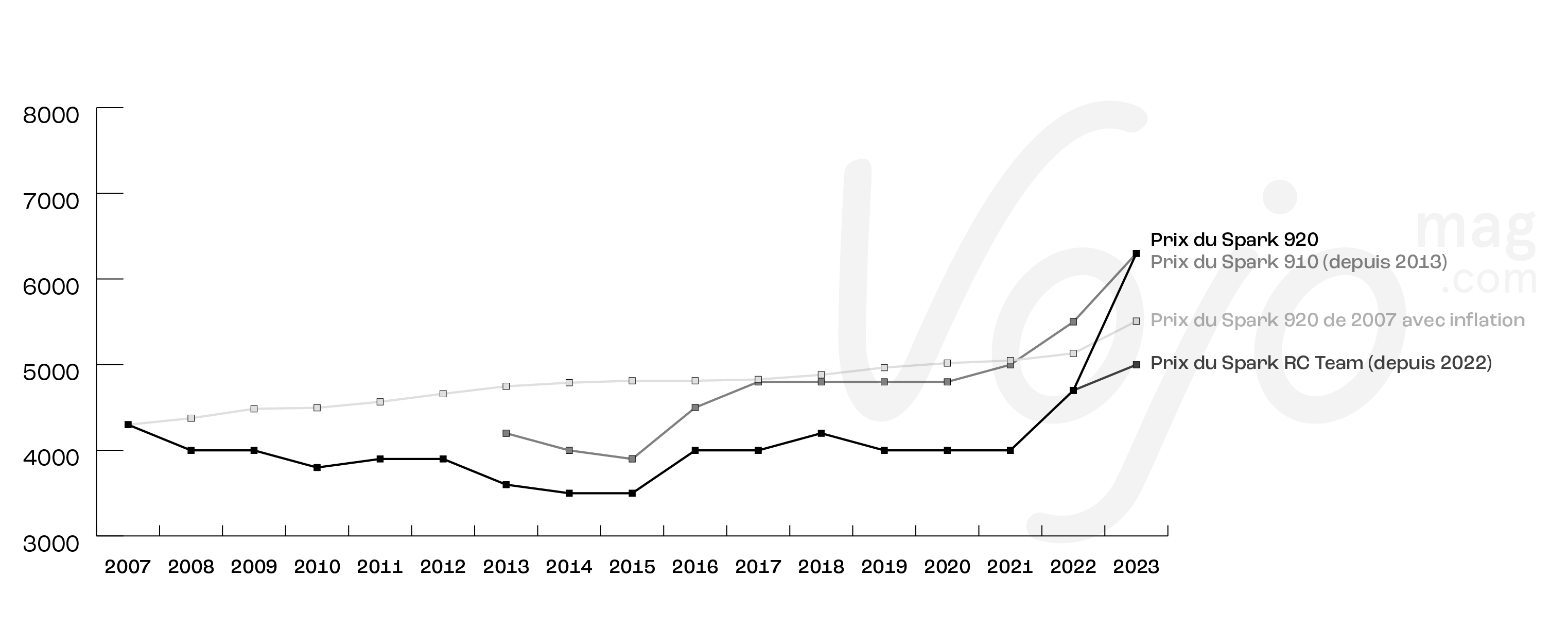 Que voit-on sur les courbes ? Cette fois, tout semblait bien se passer… jusqu’en 2022, l’année de lancement de la plateforme actuelle avec son amortisseur intégré dans le cadre. En suivant l’inflation le Spark 20 de 2007 aurait dépassé les 4900 € courant 2018 et serait aujourd’hui affiché à 5500 €. Dans les faits le modèle était nettement en-dessous de cette valeur, avec un écart parfois supérieur à 1000 € entre le tarif pratiqué et la valeur en prix constant.