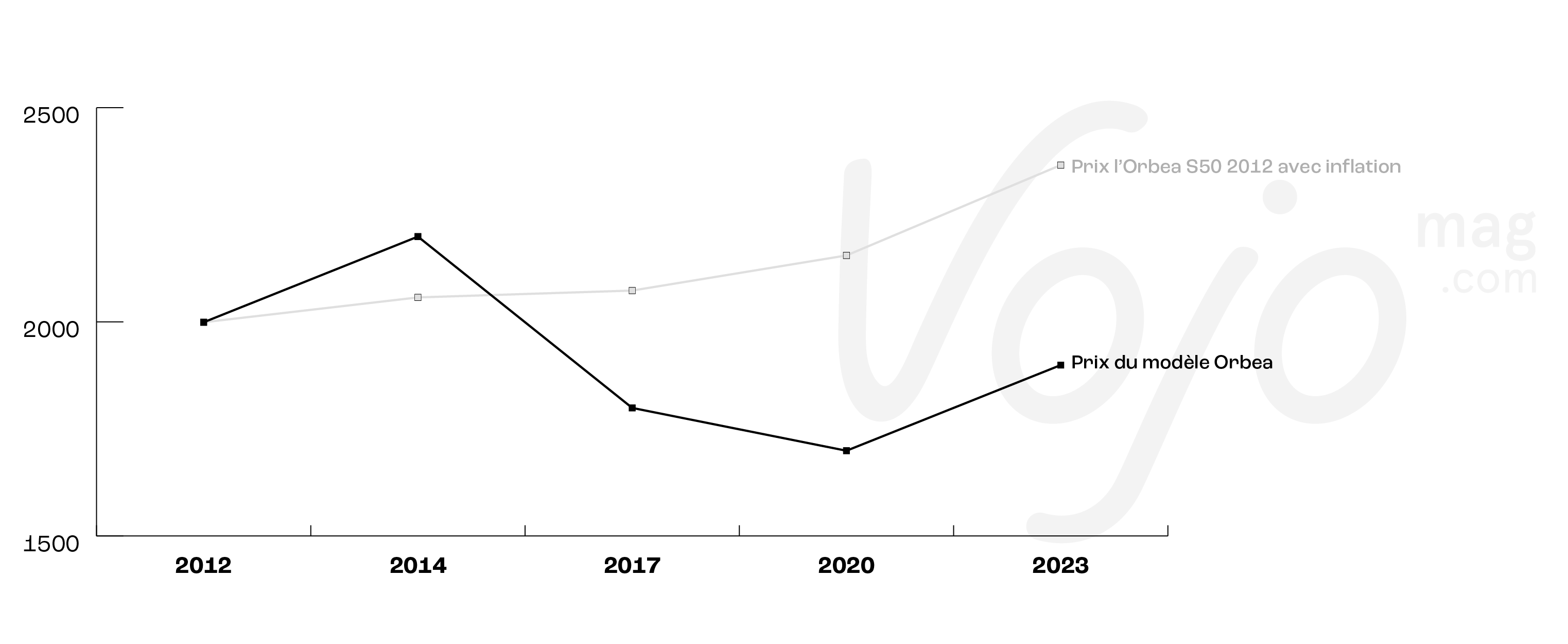 A l’époque, l’Orbea Alma S50 était affiché à 1999 € (près de 2370 € en 2023 au prix constant). Roues Mavic Crossride, transmission Shimano Deore/SLX/XT, fourche Fox 32 RL, l’équipement était cohérent avec sa position de « porte d’entrée » de la gamme Alma carbone. Rapidement renommé M50, il est ensuite monté jusqu’à 2199 € en 2014 avant de redescendre à 1799 € en 2017 puis 1699 € en 2020. Aujourd’hui, son tarif est de 1899 €. Alors certes, l’équipement est un peu moins bon qu’avant (groupe Shimano Deore/SLX, fourche RockShox Judy Silver) mais il « pèse » aussi presque 500 € de moins qu’il y a 10 ans sur le pouvoir d’achat. Et on peut trouver encore moins cher, comme le Rockrider Race 740 (1799 €) ou le Cube Reaction C:62 One (1569 €), qui est lui aussi resté dans les mêmes eaux en valeur nominale malgré l’inflation.