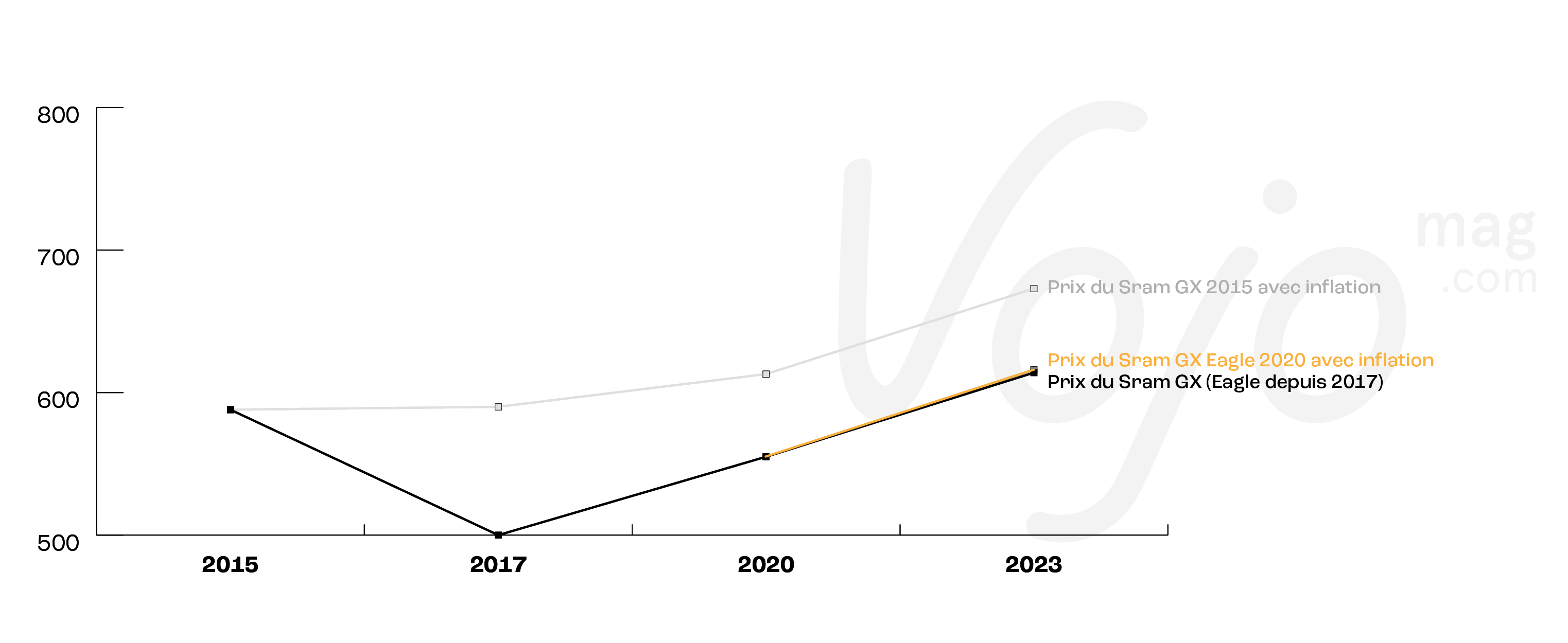A sa sortie en 2015 la version 1×11 s’échangeait contre 588 €, ce qui donne 673 € en 2023 à prix constant. Le groupe est ensuite descendu à 500 € environ avec le passage au 1×12 en 2017 (oui oui) avant de remonter à 555 € en 2020 avec la sortie de deuxième génération et son joli saut vers l’avant en termes de qualité (voir Test nouveauté | Sram GX Eagle 52 : montée en gamme… et en dents !). En 2023, le groupe GX Eagle est affiché à 614 € sur le site Sram. On est donc en-dessous du tarif de 2015 ajusté à l’inflation alors que le groupe est de meilleure qualité qu’à ses débuts.