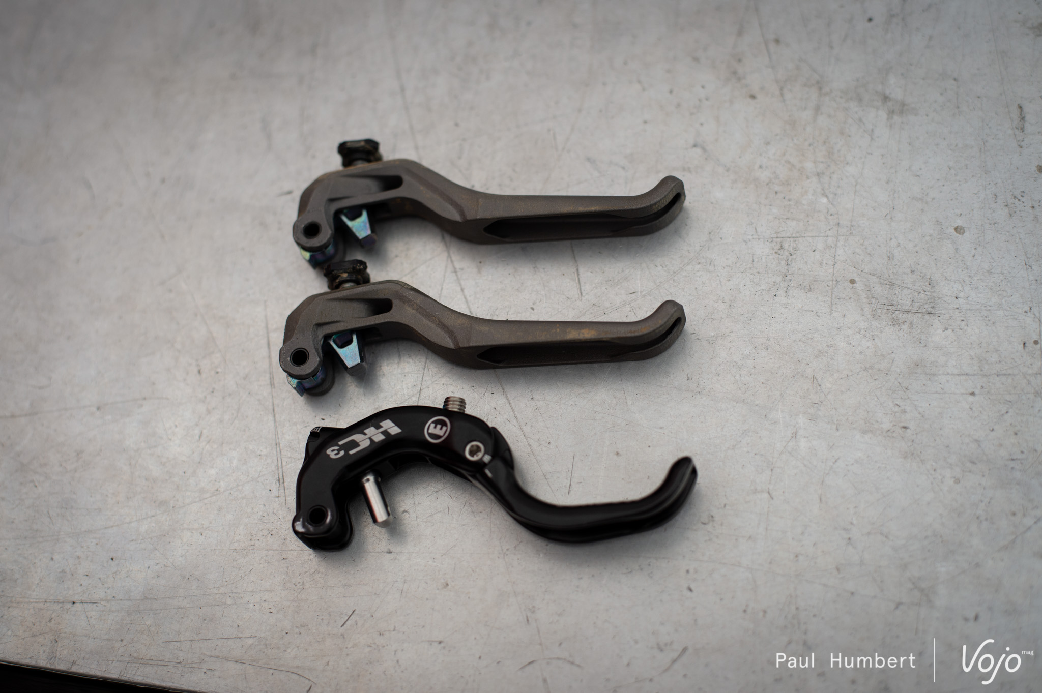 On est partis du levier d’origine Magura. Les ingénieurs de la marque nous ont fait des modèles en plastique qu’on pouvait limer, ajuster et ça c’est fait comme ça. Maintenant, ce levier est en titane, conçu en 3D.
